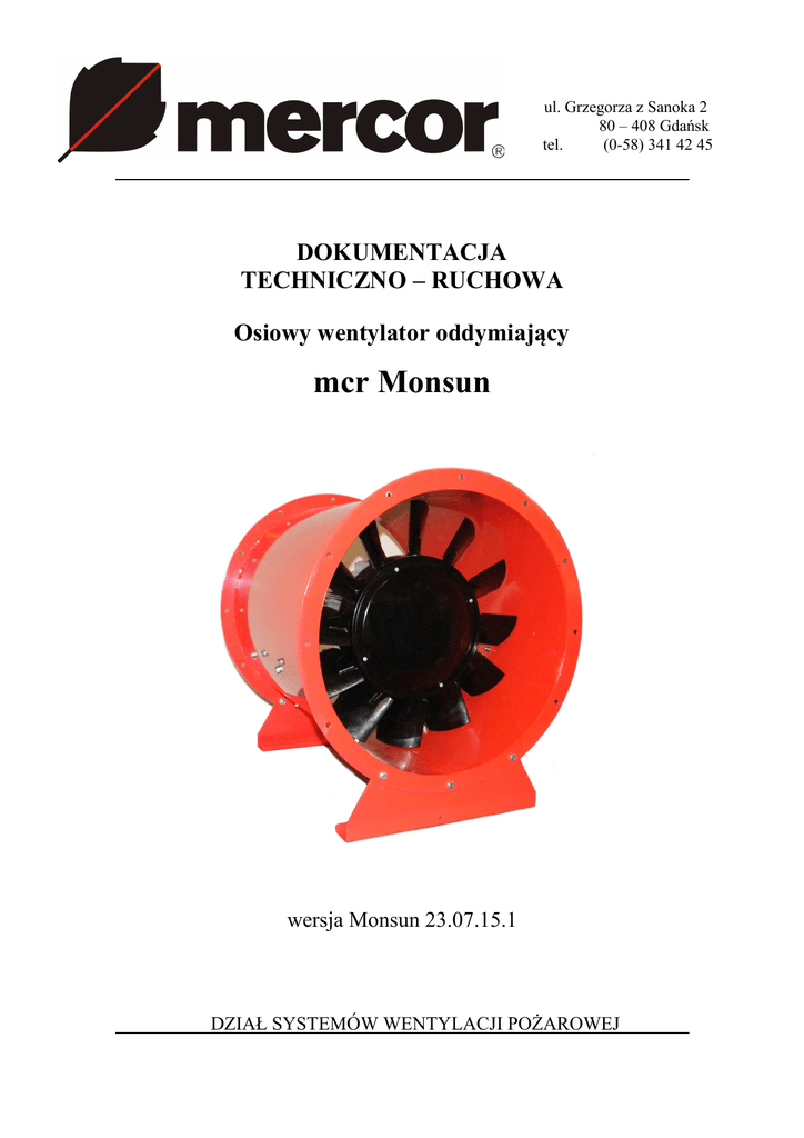ul. Grzegorza z Sanoka 2 80 – 408 Gdańsk tel. (0-58) 341 42 45 tel./fax (0-58) 341 39 85 DOKUMENTACJA TECHNICZNO – RUCHOWA Osiowy wentylator oddymiający mcr Monsun wersja Monsun 23.07.15.1 DZIAŁ SYSTEMÓW WENTYLACJI POŻAROWEJ SPIS TREŚCI: 1. UWAGI WSTĘPNE............................................................................................................................... 3 2. ZASTRZEŻENIA PRODUCENTA ........................................................................................................ 3 3. PRZEDMIOT DOKUMENTACJI ........................................................................................................... 4 4. PRZEZNACZENIE ............................................................................................................................... 4 4.1. Zastosowanie .............................................................................................................................. 4 4.2. Odporność ogniowa ..................................................................................................................... 5 4.3. Wersje wykonania ........................................................................................................................ 5 5. BUDOWA I ZASADA DZIAŁANIA URZĄDZENIA ................................................................................. 5 5.1. Budowa ....................................................................................................................................... 5 5.2. Działanie ...................................................................................................................................... 6 5.3. Wymiary....................................................................................................................................... 6 5.4. Osprzęt ………………………………………………………………………………………………….....6 6. OZNACZENIE ................................................................................................................................... 11 7. MONTAŻ URZĄDZENIA..................................................................................................................... 11 7.1. Przegląd przed montażem ......................................................................................................... 11 7.2. Posadowienie i montaż .............................................................................................................. 11 7.3. Podłączenie elektryczne ............................................................................................................ 13 7.4. Uruchomienie ............................................................................................................................ 14 8. WARUNKI TRANSPORTU I SKŁADOWANIA .................................................................................... 14 9. INSTRUKCJA BHP............................................................................................................................. 15 10. KONSERWACJA I SERWIS ............................................................................................................. 15 11. WARUNKI GWARANCJI .................................................................................................................. 16 PROTOKÓŁ POMIAROWY WENTYLATORA .................................................................................. 17 2/18 UWAGA Z datą wydania dokumentacji techniczno ruchowej tracą ważność poprzednie wersje. Dokumentacja techniczno ruchowa nie dotyczy wentylatorów wyprodukowanych przed datą jej wydania. 1. UWAGI WSTĘPNE__________________________________________________ Niniejsza Dokumentacja Techniczno-Ruchowa przeznaczona jest dla użytkownika wentylatorów osiowych oddymiających typu mcr Monsun. Jej celem jest dostarczenie wskazówek dotyczących zastosowania, budowy, uruchamiania i eksploatacji w/w wyrobu. Przed przystąpieniem do montażu urządzenia na stanowisku pracy i jego uruchomieniem należy dokładnie zapoznać się z jej treścią. W razie stwierdzenia wadliwej pracy lub usterek, należy zwrócić się do producenta lub jego upoważnionego przedstawiciela. Ze względu na stałe udoskonalanie naszych wyrobów zastrzegamy sobie możliwość zmian konstrukcyjnych podwyższających walory użytkowe i bezpieczeństwo urządzenia. Konstrukcja wentylatorów odpowiada zasadniczym wymaganiom zawartym w normie PN-EN 12101-3:2004 dotyczącej wentylatorów oddymiających. Odpowiada ona również wymaganiom aktualnego poziomu techniki oraz zapewnia bezpieczeństwo i ochronę zdrowia. Urządzenie zostało skonstruowane i wyprodukowane w oparciu o następujące normy: PN-EN 12101-3:2004 PN-EN ISO 12100-1:2005 PN-EN ISO 12100-2:2005 PN-EN 60204-1:2001 Systemy kontroli rozprzestrzeniania dymy i ciepła. Część 3: Wymagania techniczne dotyczące wentylatorów oddymiających. Bezpieczeństwo maszyn. Pojęcia podstawowe, ogólne zasady projektowania. Część 1: Podstawowa terminologia, metodologia. Bezpieczeństwo maszyn. Pojęcia podstawowe, ogólne zasady projektowania. Część 2: Zasady techniczne. Bezpieczeństwo maszyn – Wyposażenie elektryczne maszyn. Cz.1: Wymagania ogólne. 2. ZASTRZEŻENIA PRODUCENTA____________________________________ Producent nie ponosi odpowiedzialności za skutki wynikające z niezgodnego z przeznaczeniem użytkowania urządzenia. Niedopuszczalne jest instalowanie na urządzeniu dodatkowych elementów, nie wchodzących w jego skład lub wyposażenie. Niedopuszczalne są samowolne przeróbki lub modyfikacje urządzenia. Należy chronić obudowę urządzenia przed uszkodzeniami mechanicznymi. Przed montażem urządzenia sprawdzić nośność elementów konstrukcyjnych do których urządzenie będzie mocowane, gdyż niepewne zamocowanie może doprowadzić do uszkodzenia lub zniszczenia urządzenia, a także stwarzać może zagrożenie dla zn