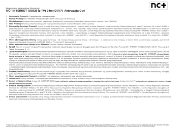 Regulamin Warunków Promocji: NC+ INTERNET 100GB (z TV) 24m (01/17) Aktywacja 0 zł 1. 2. 3. 4. 5. Organizator Promocji: ITI Neovision S.A. (Dostawca usług). Nazwa Promocji: NC+ INTERNET 100GB (z TV) 24m (01/17) Aktywacja 0 zł (Promocja). Oferta Łączona: Program Oferty Łączonej, uregulowany Regulaminem Szczegółowych Warunków Programu Oferty Łączonej z dnia 5.09.2016 r. Opis Promocji: Promocja umożliwia korzystanie z Usługi transmisji danych w ramach Programu Oferty Łączonej. Dokumenty dotyczące Promocji: Umowa o świadczenie Usług Telekomunikacyjnych – Internet (dalej: Umowa), Regulamin świadczenia Usług Telekomunikacyjnych przez ITI Neovision S.A. z dnia 7.03.2016 r. (dalej: Regulamin), Cennik Usług Telekomunikacyjnych ITI Neovision S.A. – Internet z dnia 7.03.2016 r. (dalej: Cennik), Cennik Regulaminu Warunków Promocji NC+ INTERNET 100GB (z TV) 24m (01/17) Aktywacja 0 zł, Regulamin Szczegółowych Warunków świadczenia Usługi NC+ INTERNET 100GB z dnia 7.03.2016 r., Cennik Regulaminu Szczegółowych Warunków świadczenia Usługi NC+ INTERNET 100GB z dnia 7.03.2016 r., Regulamin Szczegółowych Warunków Programu Oferty Łączonej z dnia 5.09.2016 r., Cennik Sprzętu w Usługach Telekomunikacyjnych świadczonych przez ITI Neovision S.A. z dnia 25.10.2016 r., Regulamin Szczegółowych Warunków świadczenia Usługi Unlimited TV w ramach NC+ INTERNET z dnia 5.01.2017 r., Cennik Regulaminu Szczegółowych Warunków świadczenia Usługi Unlimited TV w ramach NC+ INTERNET z dnia 5.01.2017 r. 6. Okres obowiązywania Umowy: miesiąc zawarcia Umowy + 23 miesiące/miesiąc zawarcia Umowy + 22 miesiące - w zależności od dnia miesiąca, w którym Klient zawarł Umowę, szczegóły: patrz Cennik Regulaminu Warunków Promocji NC+ INTERNET 100GB (z TV) 24m (01/17) Aktywacja 0 zł. 7. Okres wypowiedzenia Umowy przez Abonenta: 1 miesiąc, zgodnie z Umową, Regulaminem. 8. Sprzęt: Abonent w ramach niniejszej Promocji uzyskuje możliwość nabycia Sprzętu na własność. Szczegóły patrz: Cennik Regulaminu Warunków Promocji NC+ INTERNET 100GB (z TV) 24m (01/17) Aktywacja 0 zł, Tabele Promocyjne 3 i 4. 9. Zgody marketingowe: Klient/Abonent przed skorzystaniem z Promocji/w trakcie trwania Okresu obowiązywania Umowy może wyrazić zgody na działania marketingowe, których zakres wskazany jest w Umowie. W przypadku wyrażenia tych zgód, Opłaty miesięczne obowiązujące Abonenta w trakcie okresu oznaczonego zostaną obniżone o 5 zł, tj. Abonent, z tytułu korzystania z Usługi NC+ INTERNET, uiszczać będzie kwoty wskazane w Tabeli promocyjnej 1. Obniżenie Opłat nastąpi w przypadku wyrażenia wszystkich zgód marketingowych zawartych w Umowie. W przypadku wycofania przez Abonenta którejkolwiek z tych zgód, suma Opłat miesięcznych może zostać podwyższona o 5 zł. Po ponownym wyrażeniu uprzednio wycofanych zgód lub po uzupełnieniu wszystkich wskazanych w Umowie zgód marketingowych, Opłaty miesięczne będą naliczane zgodnie z Tabelą promocyjną 1 tak długo, jak długo obowiązywać będą wszystkie wskazane w Umowie zgody marketingowe. W przypadku jednoczesnego zawarcia przez Klienta/Abonenta więcej niż jednej Umowy z Dostawcą usług, w tym: Umowy o świadczenie Usług telewizyjnych, Umowy o świadczenie Usług Telekomunikacyjnych – Internet, Umowy o świadczenie Usług Telekomunikacyjnych – NC+ TELEFON, stanowiących łącznie pakiet usług, do uzyskania obniżenia Opłat opisanego w zdaniach poprzedzających, wystarczające jest wyrażenie i nieodwołanie zgód marketingowych tylko dla jednej z Umów. W przypadku niewyrażenia lub wycofania przez Abonenta którejkolwiek ze zgód, suma Opłat miesięcznych może zostać podwyższona o 5 zł – tylko dla jednej z Umów. 10. Przekształcenie Umowy: umowa po okresie oznaczonym, w przypadku braku odmiennej decyzji Abonenta, przekształca się, zgodnie z Regulaminem, automatycznie w umowę na okres nieoznaczony, szczegóły patrz: Cennik Regulaminu Warunków Promocji NC+ INTERNET 100GB (z TV) 24m (01/17) Aktywacja 0 zł. 11. Okres obowiązywania Promocji: od 5.01.2017 r. do odwołania, z zachowaniem praw nabytych Abonentów. 12. Unlimited TV: Usługa Unlimited TV dostępna tylko dla Abonentów korzystających z Usług Dostawcy usług w ramach Programu Oferty Łączonej. 13. Zasady wyłączania Usług: Usługa NC+ INTERNET 100GB: brak możliwości wyłączenia poza przypadkami rozwiązania/wygaśnięcia Umowy. Usługa Unlimited TV: automatyczne wyłączenie z końcem Okresu gwarantowanego korzystania. 14. Kwestie nieuregulowane: w kwestiach nieuregulowanych niniejszym Regulaminem Warunków Promocji zastosowanie będą miały postanowienia: Umowy, Regulaminu, Cennika, Cennika Regulaminu Warunków Promocji NC+ INTERNET 100GB (z TV) 24m (01/17) Aktywacja 0 zł, Regulaminu Szczegółowych Warunków świadczenia Usługi NC+ INTERNET 100GB z dnia 7.03.2016 r., Cennika Regulaminu Szczegółowych Warunków świadczenia Usługi NC+ INTERNET 100GB z dnia 7.03.2016 r., Regulaminu Szczegółowych Warunków Programu Oferty Łączonej z dnia 5.09.2016 r., Cennika Sprzętu w Usługach Telekomunikacyjnych świadczonych przez ITI Neovision S.A. z dnia 25.10.2016 r., Regulaminu Szczegółowych Warunków świadczenia Usługi Unlimited TV w ramach NC+ INTERNET z dnia 5.01.2017 r., Cennika Regulaminu Szczegółowych Warunków świadczenia Usługi Unlimited TV w ramach NC+ INTERNET z dnia 5.01.2017 r. 15. Kolizja postanowień: W przypadku kolizji między postanowieniami zawartymi w dokumentach wymienionych w ust. 14 powyżej, a postanowieniami niniejszego Regulaminu Warunków Promocji, pierwszeństwo będą miały postanowienia niniejszego Regulaminu Warunków Promocji. ITI Neovision S.A., 02-758 Warszawa, al. Gen. W. Sikorskiego 9, dane do korespondencji: 02-100 Warszawa, skr. pocztowa 8, Biuro Obsługi Klienta: tel. 801 044 944, 22 310 47 47 (opłata według cennika operatorów) NIP: 521-00-82-774, REGON: 010175861, w