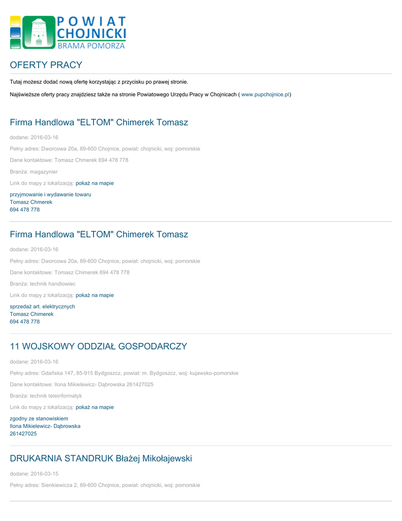 OFERTY PRACY Tutaj możesz dodać nową ofertę korzystając z przycisku po prawej stronie. Najświeższe oferty pracy znajdziesz także na stronie Powiatowego Urzędu Pracy w Chojnicach ( www.pupchojnice.pl) Firma Handlowa "ELTOM" Chimerek Tomasz dodane: 2016-03-16 Pełny adres: Dworcowa 20a, 89-600 Chojnice, powiat: chojnicki, woj: pomorskie Dane kontaktowe: Tomasz Chmerek 694 478 778 Branża: magazynier Link do mapy z lokalizacją: pokaż na mapie przyjmowanie i wydawanie towaru Tomasz Chmerek 694 478 778 Firma Handlowa "ELTOM" Chimerek Tomasz dodane: 2016-03-16 Pełny adres: Dworcowa 20a, 89-600 Chojnice, powiat: chojnicki, woj: pomorskie Dane kontaktowe: Tomasz Chimerek 694 478 778 Branża: technik handlowiec Link do mapy z lokalizacją: pokaż na mapie sprzedaż art. elektrycznych Tomasz Chimerek 694 478 778 11 WOJSKOWY ODDZIAŁ GOSPODARCZY dodane: 2016-03-16 Pełny adres: Gdañska 147, 85-915 Bydgoszcz, powiat: m. Bydgoszcz, woj: kujawsko-pomorskie Dane kontaktowe: Ilona Mikielewicz- Dąbrowska 261427025 Branża: technik teleinformatyk Link do mapy z lokalizacją: pokaż na mapie zgodny ze stanowiskiem Ilona Mikielewicz- Dąbrowska 261427025 DRUKARNIA STANDRUK Błażej Mikołajewski dodane: 2016-03-15 Pełny adres: Sienkiewicza 2, 89-600 Chojnice, powiat: chojnicki, woj: pomorskie Dane kontaktowe: Błażej Mikołajewski 52 397 43 32 Branża: technik handlowiec Link do mapy z lokalizacją: pokaż na mapie sprzedaż towarów i usług drukarni Błażej Mikołajewski 52 397 43 32 SALECO Robert Kuczyñski dodane: 2016-03-15 Pełny adres: Podleśna 23, 89-608 Swornegacie, powiat: chojnicki, woj: pomorskie Dane kontaktowe: Robert Kuczyñski 600 329 394 Branża: technik prac biurowych Link do mapy z lokalizacją: pokaż na mapie Fakturowanie, kontakt z klientem, przyjmowanie zleceñ ofertowych Robert Kuczyñski 600 329 394 Salon Kosmetyczny "WENA"-MAGDALENA WERA dodane: 2016-03-15 Pełny adres: Reymonta 10, 89-600 Chojnice, powiat: chojnicki, woj: pomorskie Dane kontaktowe: Magdalena Wera 600686755 Branża: manikiurzystka Link do mapy z lokalizacją: pokaż na mapie stylizacja paznokci Magdalena Wera 600686755 SEKO S.A. dodane: 2016-03-15 Pełny adres: Zakładowa 3, 89-600 Chojnice, powiat: chojnicki, woj: pomorskie Dane kontaktowe: Paweł Jakubowski 525108140 Branża: inżynier technologii chemicznej Link do mapy z lokalizacją: pokaż na mapie wdrażanie nowych technologii i produktów Paweł Jakubowski 525108140 Producent Wyrobów z Drewna Czesław Grzesik dodane: 2016-03-15 Pełny adres: Sielska 3, 89-600 Powałki, powiat: chojnicki, woj: pomorskie Dane kontaktowe: Czesław Grzesik 509152630 Branża: stolarz Link do mapy z lokalizacją: pokaż na mapie obsługa obrabiarek do drewna Czesław Grzesik 509152630 Hotel "PIAST" Roman Jabłoñski dodane: 2016-03-15 Pełny adres: za pośrednictwem urzędu Powiatowy Urząd Pracy w Chojnicach Lichnowska 5, 89-620 Chojnice, powiat: chojnicki, woj: pomorskie Dane kontaktowe: Kinga Rudnik Numer telefonu ze strony urzędu: 523950705 Branża: barman Link do mapy z lokalizacją: pokaż na mapie zgodny ze stanowiskiem Kinga Rudnik Numer telefonu ze strony urzędu: 523950705 PHU LENC-BUD Andrzej Lenc dodane: 2016-03-15 Pełny adres: 89-620 Władysławek 6A, powiat: chojnicki, woj: pomorskie Dane kontaktowe: Andrzej Lenc 607 171 198 Branża: murarz Link do mapy z lokalizacją: pokaż na mapie prace związane ze wznoszeniem budynków Andrzej Lenc 607 171 198 DAKO SERVICES Sp. z o.o. dodane: 2016-03-15 Pełny adres: Grabowa 2, 40-172 Katowice, powiat: m. Katowice, woj: śląskie Dane kontaktowe: ANNA GRZONDZIEL 500 237 876 Branża: robotnik gospodarczy Link do mapy z lokalizacją: pokaż na mapie PRACE PORZĄDKOWE NA TERENIE MARKETU BUDOWLANEGO ANNA GRZONDZIEL 500 237 876 Cargo Sp.zoo dodane: 2016-03-14 Pełny adres: Chojnice, ... Dane kontaktowe: [email protected] Branża: Produkcja-handel Link do mapy z lokalizacją: pokaż na mapie Przedsiębiorstwo produkcyjne zatrudni osoby do pracy przy składaniu artykułów biurowych. Prosta praca fizyczna, oparta o umowę, bez wymaganego doświadczenia, stała lub dorywcza, wykonywana całkowicie we własnym miejscu zamieszkania. Wymagane zdolności manualne, samoorganizacja czasu, ukoñczone 16 lat, oraz matematyka na poziomie podstawowym. Zarobki nawet do 2700zł miesięcznie. Zainteresowanych prosimy o zgłoszenia na EMAIL!!! [email protected] za pośrednictwem urzędu dodane: 2016-03-11 Pełny adres: Powiatowy Urząd Pracy w Grudziądzu Parkowa 22, 86-300 Grudziądz, powiat: m. Grudziądz, woj: kujawsko-pomorskie Dane kontaktowe: Janusz Miechowiecki 566438455 Branża: kasjer handlowy Link do mapy z lokalizacją: pokaż na mapie wg załącznika Janusz Miechowiecki 566438455 REGIONALNE CENTRUM KRWIODAWSTWA I KRWIOLECZNICTWA dodane: 2016-03-11 Pełny adres: Szarych Szeregów 21, 76-200 Słupsk, powiat: m. Słupsk, woj: pomorskie Dane kontaktowe: Kinga Sass 59 84 220 21 Branża: pielęgniarka Link do mapy z lokalizacją: pokaż na mapie pobieranie krwi pełnej od krwiodawców Kinga Sass 59 84 220 21 FRYZJERSTWO I KOSMETYKA-JOANNA WINIECKA dodane: 2016-03-11 Pełny adres: 18 Pułku Ułanów Pomorskich 7, 89-620 Krojanty, powiat: chojnicki, woj: pomorskie Dane kontaktowe: Monika Szopiñska 535 244 145 Branża: fryzjer Link do mapy z lokalizacją: pokaż na mapie zgodny ze stanowiskiem Monika Szopiñska 535 244 145