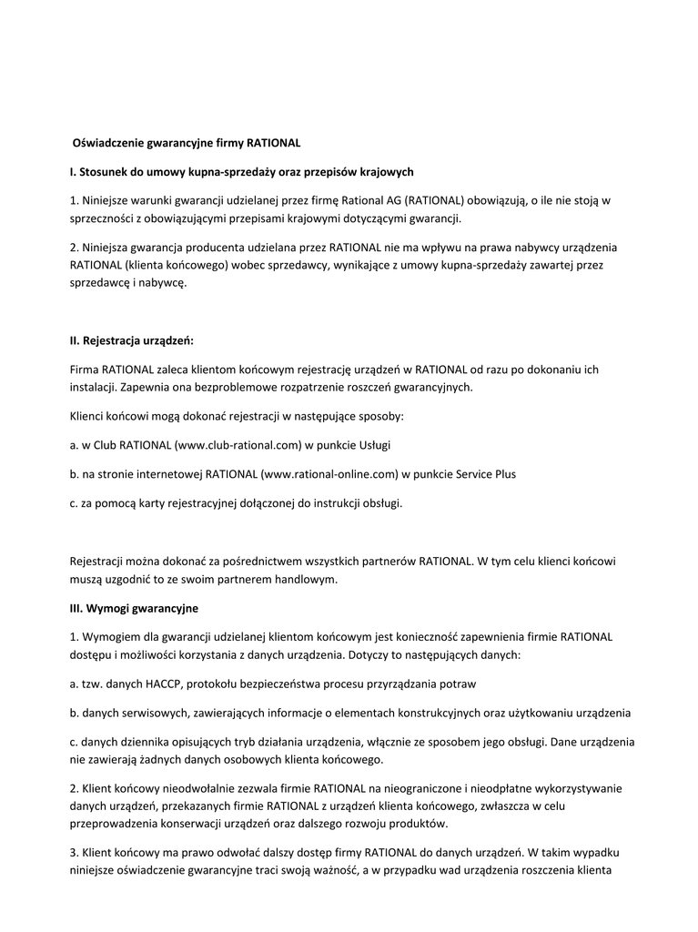 Oświadczenie gwarancyjne firmy RATIONAL I. Stosunek do umowy kupna-sprzedaży oraz przepisów krajowych 1. Niniejsze warunki gwarancji udzielanej przez firmę Rational AG (RATIONAL) obowiązują, o ile nie stoją w sprzeczności z obowiązującymi przepisami krajowymi dotyczącymi gwarancji. 2. Niniejsza gwarancja producenta udzielana przez RATIONAL nie ma wpływu na prawa nabywcy urządzenia RATIONAL (klienta końcowego) wobec sprzedawcy, wynikające z umowy kupna-sprzedaży zawartej przez sprzedawcę i nabywcę. II. Rejestracja urządzeń: Firma RATIONAL zaleca klientom końcowym rejestrację urządzeń w RATIONAL od razu po dokonaniu ich instalacji. Zapewnia ona bezproblemowe rozpatrzenie roszczeń gwarancyjnych. Klienci końcowi mogą dokonać rejestracji w następujące sposoby: a. w Club RATIONAL (www.club-rational.com) w punkcie Usługi b. na stronie internetowej RATIONAL (www.rational-online.com) w punkcie Service Plus c. za pomocą karty rejestracyjnej dołączonej do instrukcji obsługi. Rejestracji można dokonać za pośrednictwem wszystkich partnerów RATIONAL. W tym celu klienci końcowi muszą uzgodnić to ze swoim partnerem handlowym. III. Wymogi gwarancyjne 1. Wymogiem dla gwarancji udzielanej klientom końcowym jest konieczność zapewnienia firmie RATIONAL dostępu i możliwości korzystania z danych urządzenia. Dotyczy to następujących danych: a. tzw. danych HACCP, protokołu bezpieczeństwa procesu przyrządzania potraw b. danych serwisowych, zawierających informacje o elementach konstrukcyjnych oraz użytkowaniu urządzenia c. danych dziennika opisujących tryb działania urządzenia, włącznie ze sposobem jego obsługi. Dane urządzenia nie zawierają żadnych danych osobowych klienta końcowego. 2. Klient końcowy nieodwołalnie zezwala firmie RATIONAL na nieograniczone i nieodpłatne wykorzystywanie danych urządzeń, przekazanych firmie RATIONAL z urządzeń klienta końcowego, zwłaszcza w celu przeprowadzenia konserwacji urządzeń oraz dalszego rozwoju produktów. 3. Klient końcowy ma prawo odwołać dalszy dostęp firmy RATIONAL do danych urządzeń. W takim wypadku niniejsze oświadczenie gwarancyjne traci swoją ważność, a w przypadku wad urządzenia roszczenia klienta końcowego ograniczają się jedynie do ustalonych w ramach umowy i przepisów ustawowych roszczeń gwarancyjnych wobec sprzedawcy. Odwołanie dostępu do danych nie dotyczy danych dostarczonych już firmie RATIONAL. IV. Świadczenia gwarancyjne 1. W ramach niniejszej gwarancji firma RATIONAL zapewnia użytkownikom produktu RATIONAL: a. dla nowych urządzeń gwarancję na 2 (dwa) lata b. dla urządzeń używanych w postaci urządzeń prezentacyjnych, szkoleniowych itp. gwarancję na 12 (dwanaście) miesięcy (o ile nie poczyniono żadnych innych pisemnych ustaleń) Okres gwarancji rozpoczyna się w momencie instalacji urządzenia u klienta końcowego. Klient końcowy ma obowiązek pisemnego potwierdzenia daty instalacji oraz typu urządzenia lub przedłożenia faktury za instalację wykonaną przez dystrybutora lub partnera handlowego. 2. Jeżeli w okresie gwarancji wystąpią wady, które nie są objęte w punkcie V niniejszej gwarancji, firma RATIONAL usuwa je w wybrany przez siebie sposób, poprzez naprawę, wymianę uszkodzonych części lub wymianę urządzenia. Wymienione części lub urządzenia przechodzą na własność firmy RATIONAL. 3. Niniejsza gwarancja obowiązuje w tych wszystkich krajach i może być egzekwowana w przypadku urządzeń znajdujących się w tych krajach, w których autoryzowani partnerzy firmy RATIONAL realizują świadczenia gwarancyjne zgodnie z niniejszymi warunkami gwarancji. 4. Skorzystanie ze świadczeń gwarancyjnych nie powoduje przedłużenia ani odnowienia okresu gwarancji. 5. Nie udziela się żadnych innych świadczeń gwarancyjnych niż wyżej wymienione. V. Warunki gwarancji 1. Wada musi zostać zgłoszona firmie RATIONAL pisemnie w ciągu 14 dni od jej rozpoznania przez klienta lub możliwości jej rozpoznania. Ważna jest data jej zgłoszenia wady w punkcie RATIONAL-Servicepartner przez klienta końcowego. 2. Usługi gwarancyjne mogą być świadczone jedynie pod warunkiem, że wraz z urządzeniem dostarczona zostanie kopia oryginalnej faktury lub paragonu kasowego wystawionego przez dystrybutora. 3. Gwarancja nie uprawnia do bezpłatnej inspekcji i konserwacji urządzenia. Gwarancja nie obejmuje również zużycia urządzenia w wyniku jego użytkowania przez klienta końcowego ani uszkodzeń części ulegających zużyciu, spowodowanych zwykłym użytkowaniem urządzenia. Do części ulegających zużyciu się zalicza się przede wszystkim żarówki i uszczelnienia. Gwarancja nie obejmuje także uszkodzeń elementów szklanych oraz uszkodzeń powstałych na skutek osadzania się kamienia w urządzeniu. 4. Ponadto gwarancja nie obejmuje uszkodzeń urządzenia spowodowanych przez a) błędne użytkowanie urządzenia lub użytkowanie urządzenia niezgodnie z jego przeznaczeniem, a także nieprzestrzeganie instrukcji obsługi i konserwacji RATIONAL, zwłaszcza w przypadku niedostatecznego czyszczenia i pielęgnacji urządzenia b) nieodpowiednią instalację lub użytkowanie urządzenia w sposób niespełniający wymogów technicznych lub bezpieczeństwa obowiązujących w kraju, w którym urządzenie jest wykorzystywane c) niefachowe lub nieprzepisowe próby naprawy urządzenia lub prace wykonywane na urządzeniu przez nieautoryzowane podmioty trzecie d) działanie osób trzecich lub siły wyższej (np. szkody spowodowane pożarem lub powodzią) e) inne środki czyszczące i pielęgnacyjne niż zalecane przez firmę RATIONAL. 5. Uprawnienia gwarancyjne wygasają w przypadku zastosowania innych niż oryginalne części zamiennych lub elementów ulegających zużyciu bądź też w przypadku naprawy lub otwarcia urządzenia przez nieautoryzowany warsztat, nieautoryzowanego usługodawcę serwisowego lub klienta końcowego. Nie ma przy tym zn