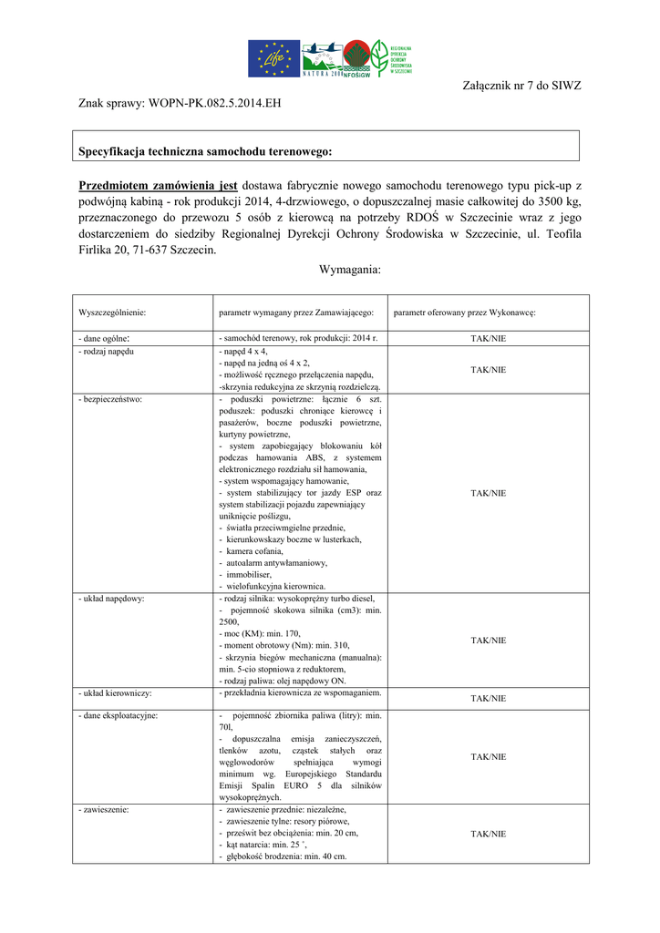Załącznik nr 7 do SIWZ Znak sprawy: WOPN-PK.082.5.2014.EH Specyfikacja techniczna samochodu terenowego: Przedmiotem zamówienia jest dostawa fabrycznie nowego samochodu terenowego typu pick-up z podwójną kabiną - rok produkcji 2014, 4-drzwiowego, o dopuszczalnej masie całkowitej do 3500 kg, przeznaczonego do przewozu 5 osób z kierowcą na potrzeby RDOŚ w Szczecinie wraz z jego dostarczeniem do siedziby Regionalnej Dyrekcji Ochrony Środowiska w Szczecinie, ul. Teofila Firlika 20, 71-637 Szczecin. Wymagania: Wyszczególnienie: parametr wymagany przez Zamawiającego: - dane ogólne: - rodzaj napędu - samochód terenowy, rok produkcji: 2014 r. - bezpieczeństwo: - układ napędowy: - układ kierowniczy: - dane eksploatacyjne: - zawieszenie: - napęd 4 x 4, - napęd na jedną oś 4 x 2, - możliwość ręcznego przełączenia napędu, -skrzynia redukcyjna ze skrzynią rozdzielczą. - poduszki powietrzne: łącznie 6 szt. poduszek: poduszki chroniące kierowcę i pasażerów, boczne poduszki powietrzne, kurtyny powietrzne, - system zapobiegający blokowaniu kół podczas hamowania ABS, z systemem elektronicznego rozdziału sił hamowania, - system wspomagający hamowanie, - system stabilizujący tor jazdy ESP oraz system stabilizacji pojazdu zapewniający uniknięcie poślizgu, - światła przeciwmgielne przednie, - kierunkowskazy boczne w lusterkach, - kamera cofania, - autoalarm antywłamaniowy, - immobiliser, - wielofunkcyjna kierownica. - rodzaj silnika: wysokoprężny turbo diesel, - pojemność skokowa silnika (cm3): min. 2500, - moc (KM): min. 170, - moment obrotowy (Nm): min. 310, - skrzynia biegów mechaniczna (manualna): min. 5-cio stopniowa z reduktorem, - rodzaj paliwa: olej napędowy ON. - przekładnia kierownicza ze wspomaganiem. - pojemność zbiornika paliwa (litry): min. 70l, - dopuszczalna emisja zanieczyszczeń, tlenków azotu, cząstek stałych oraz węglowodorów spełniająca wymogi minimum wg. Europejskiego Standardu Emisji Spalin EURO 5 dla silników wysokoprężnych. - zawieszenie przednie: niezależne, - zawieszenie tylne: resory piórowe, - prześwit bez obciążenia: min. 20 cm, - kąt natarcia: min. 25 ˚, - głębokość brodzenia: min. 40 cm. parametr oferowany przez Wykonawcę: TAK/NIE TAK/NIE TAK/NIE TAK/NIE TAK/NIE TAK/NIE TAK/NIE - nadwozie 4-drzwiowe z osobną przestrzenią ładunkową typu pickup: - hamulce: - masa: - kolor nadwozia: - wyposażenie samochodu: - gwarancja: - serwis: - długość całkowita pojazdu (mm): min. 4900, max. 5500 - szerokość całkowita pojazdu z lusterkami (mm): min. 1700, max. 2500 - wysokość całkowita pojazdu (mm): max. 1900 - liczba miejsc siedzących wraz z kierowcą: 5. - oś przednia tarczowe, - oś tylna tarczowe lub bębnowe. - ładowność (kg) min. 700, - dopuszczalna masa całkowita pojazdu (kg) max. do 3500. - biały, srebrny lub czarny. - skrzynia ładunkowa zabudowana osłoną metalową zamykaną na zamek, - centralny zamek ze sterowaniem zdalnym, - klimatyzacja, - fabryczny radioodtwarzacz z CD, MP3, USB, Bluetooth, - elektrycznie podnoszone przednie i tylne szyby boczne, - elektrycznie sterowane i podgrzewane lusterka, - podgrzewana szyba tylna, - komputer pokładowy, - progi boczne, - hak holowniczy, - koło zapasowe, - dodatkowy komplet 4 szt. kół z oponami zimowymi, - wyciągarka, - dywaniki gumowe dla kierowcy i pasażerów. - gwarancja mechaniczna (na silnik i podzespoły): min. 3 lata, - gwarancja na perforację nadwozia: min. 5 lat, - gwarancja na powłokę lakierniczą: min. 3 lata. - Wykonawca zapewnia możliwość świadczenia usług obsługowych i serwisowych oraz napraw w okresie udzielanej gwarancji, w co najmniej jednej autoryzowanej stacji obsługi na terenie województwa zachodniopomorskiego. TAK/NIE TAK/NIE TAK/NIE TAK/NIE TAK/NIE - gwarancja mechaniczna (na silnik i podzespoły): ………………. m-cy , - gwarancja na perforację nadwozia: ..……… m-cy. - gwarancja na powłokę lakierniczą: ……. m-cy UWAGA: Wykonawca zobowiązany jest zaoferować ilość miesięcy gwarancji, jednak nie więcej niż 80 miesięcy. Wymaganie zostanie uznane za spełnione w przypadku zaoferowania przynajmniej minimalnych okresów gwarancji określonych przez Zamawiającego. TAK/NIE Termin wykonania zamówienia: przedmiot zamówienia należy dostarczyć do siedziby Zamawiającego w terminie 30 dni od daty podpisania umowy pomiędzy Wykonawcą, a Zamawiającym.