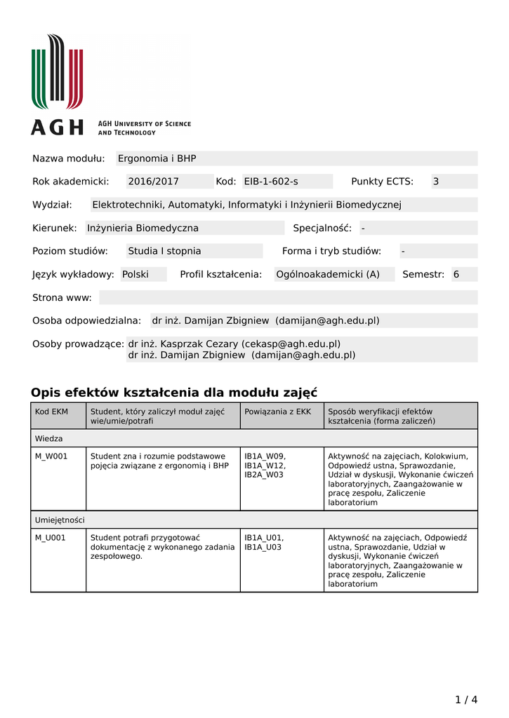 Nazwa modułu: Rok akademicki: Wydział: Kierunek: Ergonomia i BHP 2016/2017 Kod: EIB-1-602-s Punkty ECTS: 3 Elektrotechniki, Automatyki, Informatyki i Inżynierii Biomedycznej Inżynieria Biomedyczna Poziom studiów: Specjalność: Studia I stopnia Język wykładowy: Polski - Forma i tryb studiów: Profil kształcenia: Ogólnoakademicki (A) Semestr: 6 Strona www: Osoba odpowiedzialna: dr inż. Damijan Zbigniew ([email protected]) Osoby prowadzące: dr inż. Kasprzak Cezary ([email protected]) dr inż. Damijan Zbigniew ([email protected]) Opis efektów kształcenia dla modułu zajęć Kod EKM Student, który zaliczył moduł zajęć wie/umie/potrafi Powiązania z EKK Sposób weryfikacji efektów kształcenia (forma zaliczeń) Student zna i rozumie podstawowe pojęcia związane z ergonomią i BHP IB1A_W09, IB1A_W12, IB2A_W03 Aktywność na zajęciach, Kolokwium, Odpowiedź ustna, Sprawozdanie, Udział w dyskusji, Wykonanie ćwiczeń laboratoryjnych, Zaangażowanie w pracę zespołu, Zaliczenie laboratorium Student potrafi przygotować dokumentację z wykonanego zadania zespołowego. IB1A_U01, IB1A_U03 Aktywność na zajęciach, Odpowiedź ustna, Sprawozdanie, Udział w dyskusji, Wykonanie ćwiczeń laboratoryjnych, Zaangażowanie w pracę zespołu, Zaliczenie laboratorium Wiedza M_W001 Umiejętności M_U001 1/4 Karta modułu - Ergonomia i BHP M_U002 Student potrafi — przy formułowaniu i rozwiązywaniu zadań inżynierskich — integrować wiedzę z zakresu dziedzin nauki i dyscyplin naukowych, właściwych dla ergonomii oraz zastosować podejście systemowe, uwzględniające także aspekty pozatechniczne. Student potrafi wykorzystać w zadaniu praktycznym zagadnienia projektowania ergonomicznego. IB1A_U02, IB1A_U03 Aktywność na zajęciach, Odpowiedź ustna, Sprawozdanie, Udział w dyskusji, Wykonanie ćwiczeń laboratoryjnych, Zaangażowanie w pracę zespołu, Zaliczenie laboratorium IB1A_K01, IB1A_K03 Aktywność na zajęciach, Odpowiedź ustna, Sprawozdanie, Udział w dyskusji, Wykonanie ćwiczeń laboratoryjnych, Zaangażowanie w pracę zespołu, Zaliczenie laboratorium Kompetencje społeczne M_K001 Student potrafi pracować w zespole nad powierzonym mu zadaniem. Matryca efektów kształcenia w odniesieniu do form zajęć Konwersatori um Zajęcia seminaryjne Zajęcia praktyczne Zajęcia terenowe Zajęcia warsztatowe + - + - - - - - - - - M_U001 Student potrafi przygotować dokumentację z wykonanego zadania zespołowego. + - + - - - - - - - - M_U002 Student potrafi — przy formułowaniu i rozwiązywaniu zadań inżynierskich — integrować wiedzę z zakresu dziedzin nauki i dyscyplin naukowych, właściwych dla ergonomii oraz zastosować podejście systemowe, uwzględniające także aspekty pozatechniczne. Student potrafi wykorzystać w zadaniu praktycznym zagadnienia projektowania ergonomicznego. - - + - - - - - - - - - - + - - - - - - - - E-learning Ćwiczenia projektowe Student zna i rozumie podstawowe pojęcia związane z ergonomią i BHP Inne Ćwiczenia laboratoryjne Forma zajęć Ćwiczenia audytoryjne Student, który zaliczył moduł zajęć wie/umie/potrafi Wykład Kod EKM Wiedza M_W001 Umiejętności Kompetencje społeczne M_K001 Student potrafi pracować w zespole nad powierzonym mu zadaniem. 2/4 Karta modułu - Ergonomia i BHP Treść modułu zajęć (program wykładów i pozostałych zajęć) Wykład Ergonomia jako nauka i dziedzina stosowana: geneza, definicja, zakres, podmiot i cele. Podstawowy model ergonomiczny – struktura, interpretacja elementów składowych. Etapy pracy i ocena ich stopnia ciężkości – stosowane metody i narzędzia badań. Charakterystyka okresu nauki, pracy właściwej i monotypowej z monotonią. Zmęczenie: przyczyny, klasyfikacja, zalecenia. Zasady wprowadzania przerw. Procesy energetyczne organizmu ludzkiego, homeostaza, termoregulacja, behawioryzm. Procesy percepcyjne (zwłaszcza widzenia i słyszenia). Procesy informacyjne i sterujące człowieka. Parametry charakteryzujące sylwetkę człowieka. Antropometryczne zasady kształtowania obszarów pracy. Wymagania stawiane stanowisku pracy: płaszczyzna pracy, siedzisko i ich relacja; wyposażenie i jego rozmieszczenie; strefa obserwacji. Wymagania stawiane środowisku pracy – wartości graniczne, oddziaływanie, metodologia pomiaru, kryteria oceny higienicznej, zalecenia. Pozycja i postawa ciała pracownika, związane z tym dolegliwości i zagrożenia oraz zalecenia. Ergonomia stanowiska komputerowego – szkodliwości i zalecenia. Zalecenia ergonomiczne dotyczące pracy operatora. Ćwiczenia laboratoryjne Określenie wartości wybranych cech antropometrycznych – pomiar i analiza statystyczna. Asymetria anatomiczna i funkcjonalna. Wykreślenie zasięgów ruchu kończyn oraz określenie stref pracy i sformułowanie zaleceń. Ocena wybranych stanowisk pracy w aspekcie uzyskanych danych statycznych i dynamicznych cech antropometrycznych. Ocena wydolność fizjologicznej pracującego organizmu i stopnia ciężkości pracy. Monotonia i monotypia – zagrożenia i sposoby zaradcze. Badanie psychofizycznych możliwości człowieka. Ekonomika ruchu. Urządzenia informacyjne oraz sterownicze – cechy, dobór i zalecenia ergonomiczne. Proces widzenia i wymagania stawiane warunkom świetlnym. Zagadnienie komunikowania się i warunki akustyczne pomieszczeń – badanie i zalecenia. Wibracja – działanie, kryteria biologiczne, normatywy higieniczne, metody zaradcze. Sposób obliczania oceny końcowej Ocena końcowa z modułu jest obliczana na podstawie ocen z egzaminu oraz ćwiczeń z wagą 20:80 Wymagania wstępne i dodatkowe Znajomość podstaw biomechaniki i analiz statystycznych. Zalecana literatura i pomoce naukowe Wykowska M.: Ergonomia. Wyd. AGH, Kraków 1994. http://ergonomia.imir.agh.edu.pl, 2001. Wykowska M.: Zajęcia laboratoryjne z ergonomii. Wyd. AGH, skrypt 1412, Kraków 1995. Praca zbiorowa (red. Koradecka D.): Bezpieczeństwo pracy i ergonomia. T. 1 i 2, Wyd. CIOP, Warszawa