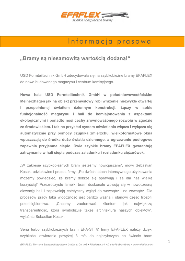 „Bramy są niesamowitą wartością dodaną!“ USD Formteiltechnik GmbH zdecydowała się na szybkobieżne bramy EFAFLEX do nowo budowanego magazynu i centrum komisyjnego. Nowa hala USD Formteiltechnik GmbH w południowowestfalskim Meinerzhagen jak na obiekt przemysłowy robi wrażenie niezwykle otwartej i przepełnionej światłem dziennym konstrukcji. Łączy w sobie funkcjonalność magazynu i hali do komisjonowania z aspektami ekologicznymi i ponadto nosi cechy zrównoważonego rozwoju w zgodzie ze środowiskiem. I tak na przykład system oświetlenia włącza i wyłącza się automatycznie przy pomocy czujnika zmierzchu, wielkoformatowe okna wpuszczają do środka dużo światła dziennego, a ogrzewanie podłogowe zapewnia przyjemne ciepło. Dwie szybkie bramy EFAFLEX gwarantują zatrzymanie w hali ciepła podczas załadunku i rozładunku ciężarówek. „W zakresie szybkobieżnych bram jesteśmy nowicjuszami“, mówi Sebastian Kosak, udziałowiec i prezes firmy. „Po dwóch latach intensywnego użytkowania możemy powiedzieć, że bramy dobrze się sprawują i są dla nas wielką korzyścią!“ Przezroczyste lamelki bram doskonale wpisują się w nowoczesną elewację hali i zapewniają estetyczny wgląd do wewnątrz i na zewnątrz. Dla procesów pracy taka widoczność jest bardzo ważna i stanowi część filozofii przedsiębiorstwa. „Chcemy zaoferować klientom jak największą transparentność, którą symbolizuje także architektura naszych obiektów“, wyjaśnia Sebastian Kosak. Seria turbo szybkobieżnych bram EFA-STT® firmy EFAFLEX należy dzięki szybkości otwierania powyżej 3 m/s do najszybszych na świecie bram 1 EFAFLEX Tor- und Sicherheitssysteme GmbH & Co. KG Fliederstr.14 D 84079 Bruckberg www.efaflex.com otwieranych w pionie. Cały panel bramy składa się z wymienialnych, odpornych na wiatr i pogodę, połączonych ze sobą przezroczystych lamelek. Podział jest co 225 mm, więc przepuszczalność światła stale utrzymuje się na poziomie ponad 70%. Efektem są wspaniałe warunki świetlne i zawsze dobry widok. Bardzo stabilna i świetnie uszczelniona brama na całym obrysie oraz niezwykle duża prędkość otwierania sprawiają, że znacząco spadają koszty energii, a za to rośnie stopień ochrony pracowników przez zimnem i przeciągiem. Jednocześnie bramy są odporne na działanie wiatru na poziomie powyżej 120 km/h zgodnie z normą DIN EN 12424. Dzięki koncepcji zmiany obciążeń do 200.000 na rok okresy przeglądów i konserwacji są znacznie wydłużone, a ich koszt zauważalnie niski. Sebastian Kosak szczególnie krytycznie obserwuje obie bramy EFAFLEX- „Tutaj niezawodność jest bardzo ważnym zagadnieniem“. „W przypadku zastojów w tym obszarze, staje cały zakład. Towar ani nie może wjechać, ani wyjechać. Na coś takiego nie możemy sobie pozwolić.“ „Mimo, że bramy są w stałym użyciu, serwis pojawia się u nas tylko raz w roku”, mówi kierownik magazynu Torsten Kauferstein. „Częściej nie potrzebujemy fachowców, brama musi pracować. I tak się dzieje zresztą, ku wielkiemu naszemu zadowoleniu.“ Aby zminimalizować straty ciepła na bramie przy rampie, brama zamyka się nie na podeście do ładowania, tylko na poziomie posadzki pod rampą. Na pierwszy rzut oka konstrukcja jest dziwna, ale przekonuje jej funkcjonalność. I na dodatek brama dobrze opiera się zimie i wszelkim warunkom atmosferycznym. „Intensywnie zastanawialiśmy się nad szczegółami nowego obiektu “, opowiada prezes firmy. „Zresztą zawsze tak robimy, gdy chodzi o optymalizację warunków i wyposażenia zakładu. W przypadku dostaw na różne kontynenty elementów kutych, odlewanych, Sinter, MIM, toczonych, wybijanych i podzespołów jest to sprawa kluczowa. USD transportuje i składuje produkty na około 4.500 m² własnej powierzchni. Jedynie wykorzystanie własnych, nowoczesnych terenów 2 EFAFLEX Tor- und Sicherheitssysteme GmbH & Co. KG Fliederstr.14 D 84079 Bruckberg www.efaflex.com logistycznych pozwala na niezawodne i bezpieczne dostawy towarów do klientów.” Firma założona przez Jürgen Kosak w 1977 r. miała na początku ukierunkowanie handlowe. Dzisiaj jest cenionym dostawcą na świecie. Odbiorcy mogą zdać się na ponad 40-letnie już doświadczenie przedsiębiorstwa w branży. Do grona klientów należą znane firmy średniej wielkości, liczni liderzy rynków światowych, przedsiębiorstwa notowane na giełdzie i międzynarodowe koncerny. Wszyscy oni otrzymują pełną kompleksową obsługę dostawczą. W zakresie pozyskiwania wysokojakościowych produktów dział zaopatrzenia wspierany jest konsekwentnie przez system oceny dostawców, wizje lokalne i audyty. Ponadto zespoły ds. kontroli jakości regularnie sprawdzają wzory i części seryjne sporządzając na ten temat właściwą dokumentację. USD inwestuje w jakość i bezpieczeństwo, czego dowodem jest wyposażenie obu pomieszczeń pomiarowych o ustalonej temperaturze zgodnie z wytycznymi VDI/VDE 2627 i III klasą jakości w nowoczesne urządzenia pomiarowe, jak trójwymiarowe mierniki współrzędnych, optyczne urządzenia pomiarowe, urządzenia kontroli twardości, spektrometry i różne inne sprzęty do takich celów. Wszystkie one mają zapewnić stały poziom jakości. Kontakt prasowy w EFAFLEX: Pan Alexander Beck 0049 8765 – 82126 [email protected] 3 EFAFLEX Tor- und Sicherheitssysteme GmbH & Co. KG Fliederstr.14 D 84079 Bruckberg www.efaflex.com