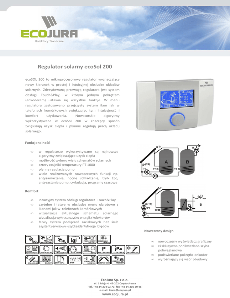 Regulator solarny ecoSol 200 ecoSOL 200 to mikroprocesorowy regulator wyznaczający nowy kierunek w prostej i intuicyjnej obsłudze układów solarnych. Zdecydowaną przewagą regulatora jest system obsługi Touch&Play, w którym jednym pokrętłem (enkoderem) ustawia się wszystkie funkcje. W menu regulatora zastosowano przejrzysty system ikon jak w telefonach komórkowych zwiększając tym intuicyjność i komfort użytkowania. Nowatorskie algorytmy wykorzystywane w ecoSol 200 w znaczący sposób zwiększają uzysk ciepła i płynnie regulują pracą układu solarnego. Funkcjonalność • • • • • w regulatorze wykorzystywane są najnowsze algorytmy zwiększające uzysk ciepła możliwość wyboru wielu schematów solarnych cztery czujniki temperatury PT 1000 płynna regulacja pomp wiele realizowanych nowoczesnych funkcji np. antyzamarzanie, nocne schładzanie, tryb Eco, antyzastanie pomp, cyrkulacja, programy czasowe Komfort • • • • intuicyjny system obsługi regulatora Touch&Play czytelne i łatwe w obsłudze menu obrotowe z ikonami jak w telefonach komórkowych wizualizacja aktualnego schematu solarnego wizualizacja wykresu uzysku energii z kolektorów łatwy system podłączeń zaciskowych bez śrub asystent serwisowy - szybka identyfikacja błędów Noweczsny design • • • • nowoczesny wyświetlacz graficzny ekskluzywna podświetlana szyba poliwęglanowa podświetlane pokrętło-enkoder wyróżniający się wzór obudowy