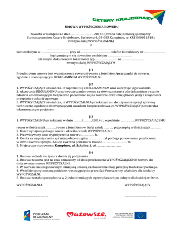 UMOWA WYPOŻYCZENIA ROWERU zawarta w Kampinosie dnia…………………….....2014r. (zwana dalej Umową) pomiędzy: Stowarzyszeniem Cztery Krajobrazy, Baśniowa 4, 05-085 Kampinos, nr KRS 0000315481 zwanym dalej WYPOŻYCZALNIĄ a …............................................................................................................................ zamieszkałym w …..................................... przy ul. …........................................telefon kontaktowy nr ............................... legitymującym się dowodem osobistym ................................... lub innym dokumentem tożsamości typ ................................ nr ................................ zwanym dalej WYPOŻYCZAJĄCYM §1 Przedmiotem umowy jest wypożyczenie roweru/roweru z fotelikiem/przyczepki do roweru, zgodnie z obowiązującym REGULAMINEM WYPOŻYCZALNI. §2 1. WYPOŻYCZAJĄCY oświadcza, iż zapoznał się z REGULAMINEM oraz akceptuje jego warunki. 2. Akceptacja REGULAMINU oraz wypożyczenie roweru są równoznaczne z oświadczeniem o stanie zdrowia umożliwiającym bezpieczne poruszanie się na rowerze oraz umiejętności jazdy i znajomości przepisów ruchu drogowego. 3. WYPOŻYCZAJĄCY oświadcza, iż WYPOŻYCZALNIA przekazuje mu do używania sprzęt sprawny technicznie, zgodnie z obowiązującymi zasadami bezpieczeństwa, co WYPOŻYCZAJĄCY potwierdza własnoręcznym podpisem. §3 1. WYPOŻYCZALNIA przekazuje w dniu …......../............/2014 r., o godzinie ………..........WYPOŻYCZAJĄCEMU rower w ilości sztuk …........., rower z fotelikiem w ilości sztuk …….…., przyczepkę w ilości sztuk ………… 2. Koszt wynajmu jednego roweru określa cennik WYPOŻYCZALNI. 3. Przewidywany czas wypożyczenia roweru ………….... h, 4. Kwota za wypożyczenie sprzętu pobrana z góry ……………….zł podlega ponownemu przeliczeniu w chwili zwrotu sprzętu. Kaucja zwrotna pobrana w kwocie ……………………….. zł. 5. Miejsce zwrotu roweru: Kampinos, ul. Szkolna 1, tel. ………………………. §4 1. Umowa wchodzi w życie z dniem jej podpisania. 2. Umowa zawarta jest na czas oznaczony od dnia przekazania WYPOŻYCZAJĄCEMU roweru do dnia zwrotu roweru WYPOŻYCZALNI. 3. W zakresie nieuregulowanym niniejszą umową zastosowanie mają przepisy Kodeksu cywilnego. 4. Wszelkie spory zostaną poddane rozstrzygnięciu przez Sąd Powszechny właściwy dla siedziby WYPOŻYCZALNI. 5. Umowa została sporządzona w 2 jednobrzmiących egzemplarzach po jednym dla każdej ze Stron. WYPOŻYCZALNIA WYPOŻYCZAJĄCY ...................................……… ...................................………