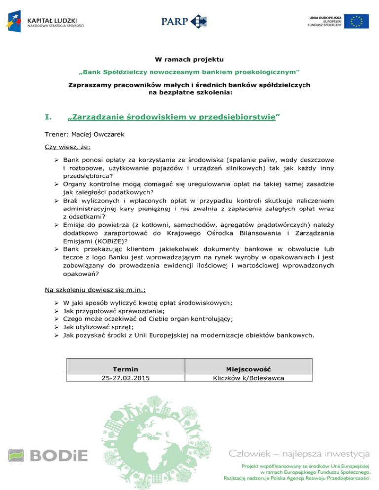W ramach projektu „Bank Spółdzielczy nowoczesnym bankiem proekologicznym” Zapraszamy pracowników małych i średnich banków spółdzielczych na bezpłatne szkolenia: I. „Zarządzanie środowiskiem w przedsiębiorstwie” Trener: Maciej Owczarek Czy wiesz, że: Bank ponosi opłaty za korzystanie ze środowiska (spalanie paliw, wody deszczowe i roztopowe, użytkowanie pojazdów i urządzeń silnikowych) tak jak każdy inny przedsiębiorca? Organy kontrolne mogą domagać się uregulowania opłat na takiej samej zasadzie jak zaległości podatkowych? Brak wyliczonych i wpłaconych opłat w przypadku kontroli skutkuje naliczeniem administracyjnej kary pieniężnej i nie zwalnia z zapłacenia zaległych opłat wraz z odsetkami? Emisje do powietrza (z kotłowni, samochodów, agregatów prądotwórczych) należy dodatkowo zaraportować do Krajowego Ośrodka Bilansowania i Zarządzania Emisjami (KOBiZE)? Bank przekazując klientom jakiekolwiek dokumenty bankowe w obwolucie lub teczce z logo Banku jest wprowadzającym na rynek wyroby w opakowaniach i jest zobowiązany do prowadzenia ewidencji ilościowej i wartościowej wprowadzonych opakowań? Na szkoleniu dowiesz się m.in.: W jaki sposób wyliczyć kwotę opłat środowiskowych; Jak przygotować sprawozdania; Czego może oczekiwać od Ciebie organ kontrolujący; Jak utylizować sprzęt; Jak pozyskać środki z Unii Europejskiej na modernizacje obiektów bankowych. Termin 25-27.02.2015 Miejscowość Kliczków k/Bolesławca II. „ Marketing i produkt ekologiczny” Trener: Krzysztof Fruba Czy wiesz, że: 92% firm, stosuje rozwiązania proekologiczne i czerpie z nich finansowe i marketingowe korzyści? W 2020 r. 15% energii zużywanej w Polsce musi pochodzić ze źródeł odnawialnych; 100% banków notowanych na GPW należy do indeksu RESPECT, który uwzględnia postępowanie proekologiczne? 96% firm deklaruje wprowadzanie ekoinnowacji? Program Operacyjny Inteligentny Rozwój o wartości 8,6 mld EURO (2014-2020) stawia na działania zrównoważone, a więc wspierające ekoinnowacje? Na szkoleniu uczestnicy poznają zagadnienia z zakresu marketingu, ekologii i sprzedaży. Po szkoleniu będziesz potrafić: Przekonać klienta do kupna określonego produktu; Stworzyć skuteczny komunikat reklamowy; Wdrożyć nowe produkty bankowe; Opracować darmową reklamę. I zjazd II zjazd Miejscowość 15-16.01.2015 19-20.01.2015 02-03.02.2015 04-05.03.2015 10-11.02.2015 16-17.02.2015 09-10.03.2015 02-03.04.2015 Warszawa Kliczków k/Bolesławca Bydgoszcz/Szczyrk Białystok III. Odnawialne źródła energii Trener: Bartosz Królczyk Czy wiesz, że: Kolektor słoneczny i panel fotowoltaiczny to nie to samo? Małe, przydomowe elektrownie wiatrowe mogą stanowić dodatkowe źródło zasilania dla domów jednorodzinnych lub nawet większych farm? Celem Europejskiej Strategii Energetycznej jest zwiększenie efektywności energetycznej o 20% do 2020 r.? NFOŚiGW udziela dotacje na budownictwo energooszczędne i pasywne? Po szkoleniu będziesz wiedział: Czym są odnawialne źródła energii? Jakie korzyści dla Banku ma rozwój odnawialnych źródeł energii w Polsce? Jak określić czynniki ryzyka i czynniki przewagi konkurencyjnej dla inwestycji związanych z odnawialnymi źródłami energii? Jak przeprowadzić analizę ryzyka i analizę ekonomiczną dla inwestycji związanych z odnawialnymi źródłami energii? Termin Miejsce 01-02.12.2014 19-20.02.2015 13-14.04.2015 Poznań Zakopane/Karpacz Kołobrzeg IV. „Ryzyko ekologiczne” Trener: dr Tomasz Wałowski Czy wiesz, że: Obecnie dokonuje się ekologiczna ewolucja rynku finansowego? Twój Bank uczestniczy w tych przemianach, a jego proekologiczny charakter staje się jakościowym wyznacznikiem działania? Przyznane środki z Unii Europejskiej na lata 2014-2020 są przeznaczone głównie na finansowanie odnawialnych źródeł energii, co stwarza kolejne możliwości dla Banków, ale równocześnie wpływa na powstanie nowego ryzyka operacyjnego jak i kredytowego? Ważne jest rozpoznanie, definiowanie ograniczenie i monitorowanie pojawiającego się ryzyka w działalności operacyjnej banku? Dzięki wdrożeniu koncepcji Społecznej Odpowiedzialności Biznesu (CSR), staje się możliwe zintegrowanie powiązań ekonomicznych, społecznych i środowiskowych w działalności Banków? Po szkoleniu będziesz wiedział.: W jaki sposób dokonać ewolucję ekologiczną w Twoim Banku; Jaką strategię ekologizacji Banku wybrać; Jakimi narzędziami się posługiwać, jakie metody identyfikacji i oceny ryzyka wybrać, by poprawiać ekologiczną jakość portfela kredytowego; Jak łagodnie przejść od bankowości tradycyjnej do bankowości ekologicznej; Jak robią to inni, czyli dobre praktyki w innych Bankach. Termin Miejsce 08-10.12.2014 28-30.01.2015 04-06.02.2015 17-19.03.2015 20-22.04.2015 Poznań Szklarska Poręba Ustrzyki Górne/Karpacz Poznań Kołobrzeg/ Ciechocinek Dowiedz się czym są odnawialne źródła energii i jak Twój Bank może skorzystać finansując inwestycje ekologiczne Nie czekaj! Zapisz się już dziś! Udział w szkoleniu jest bezpłatny. Gwarantujemy bezpłatne wyżywienie i noclegi w hotelach*** Szkolenia odbywają w ciekawych miejscach m.in: • Szklarska Poręba – Hotel Szrenica • Kliczków k/ Bolesławca – Folwark Książęcy, na terenie kompleksu zamkowego • Poznań – hotel Novotel Malta • Warszawa – hotel Colibra • Ciechocinek – hotel Abrava Każdy uczestnik otrzymuje darmowe ciekawe materiały szkoleniowe i jedną z poniżej wymienionych książek „Zintegrowane zarządzanie środowiskiem” – redakcja naukowa A. Kryński, M. Kramer, A. F. Caekelbergh. „Efektywność inwestycji w odnawialne źródła energii – analiza kosztów i korzyści” Magdaleny Ligus. „Zielony rynek finansowy. Ekologiczna ewolucja rynku finansowego” – Leszka Dziawgo. Zapewniamy także bezpłatnie wyżywienie i nocleg w komfortowym hotelu. Dla każdego Banku proekologicznych. 5 