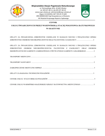 Wojewódzka Stacja Pogotowia Ratunkowego ul. Pstrowskiego 28 b, 10-602 Olsztyn tel. 89-537-38-11, fax 89-537-38-10 www.wspr.olsztyn.pl, [email protected] Regon 511332933, NIP 739-29-72-605 KRS 0000021823 Sąd Gospodarczy w Olsztynie VIII Wydział Krajowego Rejestru Sądowego CENNIK USŁUG ŚWIADCZONYCH PRZEZ WOJEWÓDZKĄ STACJĘ POGOTOWIA RATUNKOWEGO W OLSZTYNIE OPŁATY ZA ŚWIADCZENIA ZDROWOTNE UDZIELANE W RAMACH NOCNEJ I ŚWIĄTECZNEJ OPIEKI ZDROWOTNEJ OSOBOM NIEUBEZPIECZONYM ORAZ PACJENTOM Z ZAGRANICY………………………. 2 OPŁATY ZA ŚWIADCZENIA ZDROWOTNE UDZIELANE W RAMACH NOCNEJ I ŚWIĄTECZNEJ OPIEKI ZDROWOTNEJ OSOBOM NIEUBEZPIECZONYM, PACJENTOM Z ZAGRANICY ORAZ OSOBOM SKIEROWANYM DO GABINETU ZABIEGOWEGO Z PRYWATNEGO GABINETU LEKARSKIEGO ………… 2 TRANSPORT MEDYCZNY……………………………………………………………………………………………… 2 TRANSPORT SANITARNY ……………………………………………………………………………………………. 2 ZABEZPIECZENIE MEDYCZNE IMPREZ ……………………………………………………………………………. 3 OPŁATY ZA BADANIA TECHNICZNE POJAZDÓW ………………………………………………………………. 3 CENNIK USŁUG STACJI OBSŁUGI POJAZDÓW …………………………………………………………………… 5 CENNIK USŁUG WARMIŃSKO-MAZURSKIEJ SZKOŁY RATOWNICTWA MEDYCZNEGO …………………. 5 DOK/D/WND.3 Strona 1 z 6 Wojewódzka Stacja Pogotowia Ratunkowego ul. Pstrowskiego 28 b, 10-602 Olsztyn tel. 89-537-38-11, fax 89-537-38-10 www.wspr.olsztyn.pl, [email protected] Regon 511332933, NIP 739-29-72-605 KRS 0000021823 Sąd Gospodarczy w Olsztynie VIII Wydział Krajowego Rejestru Sądowego I. OPŁATY ZA ŚWIADCZENIA ZDROWOTNE UDZIELANE W RAMACH NOCNEJ I ŚWIĄTECZNEJ OPIEKI ZDROWOTNEJ OSOBOM NIEUBEZPIECZONYM ORAZ PACJENTOM Z ZAGRANICY 1. wizyta lekarska – 75,00 zł 2. wizyta lekarska w domu chorego – 150,00 zł. II. OPŁATY ZA ŚWIADCZENIA ZDROWOTNE UDZIELANE W RAMACH NOCNEJ I ŚWIĄTECZNEJ OPIEKI ZDROWOTNEJ OSOBOM NIEUBEZPIECZONYM, PACJENTOM Z ZAGRANICY ORAZ OSOBOM SKIEROWANYM DO GABINETU ZABIEGOWEGO Z PRYWATNEGO GABINETU LEKARSKIEGO III. 1. zabieg pielęgniarski w domu chorego – 25,00 zł + cena zabiegu 2. EKG – 25,00 zł 3. iniekcja domięśniowa – 15,00 zł 4. iniekcja dożylna – 25,00 zł 5. iniekcja podskórna – 15,00 zł 6. wlew kroplowy – 30,00 zł 7. nebulizacja – 20,00 zł. TRANSPORT MEDYCZNY 1. Transporty medyczne wykonywane w granicach administracyjnych Miasta Olsztyna: karetka „S” każda rozpoczęta godzina- 200,00 zł karetka „P” każda rozpoczęta godzina- 160,00 zł (bez względu na ilość przejechanych kilometrów) 2. Transporty medyczne wykonywane poza granice administracyjne Miasta Olsztyna: (Ceny transportów wykonywanych powyżej 200 kilometrów mogą podlegać negocjacjom) karetka „S” karetka „P” IV. 1 godzina - 200,00 zł 1 kilometr- 2,00 zł 1 godzina- 160,00 zł 1 kilometr- 2,00 zł TRANSPORT SANITARNY (Ceny transportów wykonywanych powyżej 200 kilometrów mogą podlegać negocjacjom) 1. Transporty sanitarne wykonywane pojazdem sanitarnym: (sam kierowca) 1godzina- 28,00 zł 1 kilometr 1,80 zł 2. Transporty sanitarne wykonywane pojazdem sanitarnym: (kierowca + noszowy) DOK/D/WND.3 1 godzina- 45,00 zł 1 kilometr- 1,80 zł Strona 2 z 6 Wojewódzka Stacja Pogotowia Ratunkowego ul. Pstrowskiego 28 b, 10-602 Olsztyn tel. 89-537-38-11, fax 89-537-38-10 www.wspr.olsztyn.pl, [email protected] Regon 511332933, NIP 739-29-72-605 KRS 0000021823 Sąd Gospodarczy w Olsztynie VIII Wydział Krajowego Rejestru Sądowego 3. Transporty sanitarne realizowane na zlecenie lekarzy rodzinnych w ramach umowy z NFZ są wykonywanie nieodpłatnie. V. ZABEZPIECZENIE MEDYCZNE IMPREZ (ceny zabezpieczeń medycznych imprez mogą podlegać negocjacjom) 1. Zespół „S” 3-osobowy - 2. Zespół „P” 3-osobowy - 2-osobowy - 3. 1 godzina 220,00 zł 1 kilometr 2,00 zł 1 godzina 180,00 zł 1 kilometr 2,00 zł 1 godzina 150,00 zł 1 kilometr 2,00 zł Patrol ratowniczy 2-osobowy -1 godzina 4. Zespół transportowy 2-osobowy - V. 80,00 zł 1 godzina 70,00 zł 1 kilometr 1,80 zł OPŁATY ZA BADANIA TECHNICZNE POJAZDÓW (zgodne z Rozporządzeniem Ministra Infrastruktury z dnia 29 września 2004 r. w sprawie wysokości opłat związanych z prowadzeniem stacji kontroli pojazdów oraz przeprowadzaniem badań technicznych pojazdów (Dz.U. nr 223 z dnia 14 października 2004 r., poz. 2261 z późn. zm.) 1. Okresowe badanie techniczne: 62,00 zł 1.1. motocykl 1.2. samochód osobowy, autobus przeznaczony do przewozu nie więcej niż 15 osób łącznie z kierowcą, samochód ciężarowy i specjalny do 3,5 t d.m.c., pojazd trójkołowy powyżej 0,4 t m.w.1) 98,00 zł 1.3. pojazd przystosowany do zasilania gazem (za badanie specjalistyczne) 63,00 zł 1.4. motorower 2. Ponowne sprawdzenie mechanizmów i zespołów w pojeździe, w którym stwierdzono usterki w trakcie badań 50,00 zł technicznych w zakresie: 2.1. skuteczności i równomierności działania hamulców 2.2. ustawienia i natężenia świateł drogowych i świateł mijania 2.3. połączeń układu kierowniczego oraz jałowego ruchu koła kierownicy, luzów w zawieszeniu 2.4. toksyczności spalin 2.5. poziomu hałasu 2.6. geometrii kół jednej osi 2.7. działania amortyzatorów jednej osi 14,00 zł DOK/D/WND.3 20,00 zł 14,00 zł 20,00 zł 14,00 zł 20,00 zł 36,00 zł Strona 3 z 6 Wojewódzka Stacja Pogotowia Ratunkowego ul. Pstrowskiego 28 b, 10-602 Olsztyn tel. 89-537-38-11, fax 89-537-38-10 www.wspr.olsztyn.pl, [email protected] Regon 511332933, NIP 739-29-72-605 KRS 0000021823 Sąd Gospodarczy w Olsztynie VIII Wydział Krajowego Rejestru Sądowego 2.8. wszystkich innych usterek łącznie 20,00 zł 3. Dodatkowe badanie techniczne pojazdu skierowanego przez organ kontroli ruchu drogowego w razie uzasadnionego przypuszczenia, że zagraża be