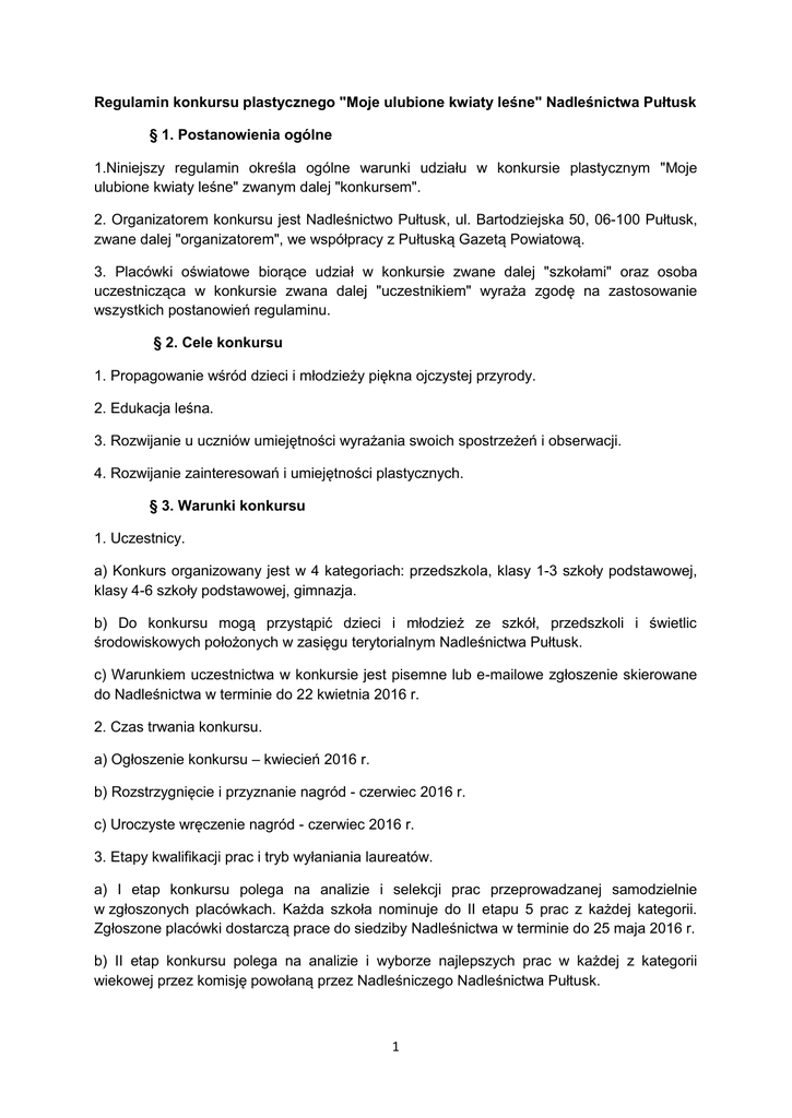 Regulamin konkursu plastycznego "Moje ulubione kwiaty leśne" Nadleśnictwa Pułtusk § 1. Postanowienia ogólne 1.Niniejszy regulamin określa ogólne warunki udziału w konkursie plastycznym "Moje ulubione kwiaty leśne" zwanym dalej "konkursem". 2. Organizatorem konkursu jest Nadleśnictwo Pułtusk, ul. Bartodziejska 50, 06-100 Pułtusk, zwane dalej "organizatorem", we współpracy z Pułtuską Gazetą Powiatową. 3. Placówki oświatowe biorące udział w konkursie zwane dalej "szkołami" oraz osoba uczestnicząca w konkursie zwana dalej "uczestnikiem" wyraża zgodę na zastosowanie wszystkich postanowień regulaminu. § 2. Cele konkursu 1. Propagowanie wśród dzieci i młodzieży piękna ojczystej przyrody. 2. Edukacja leśna. 3. Rozwijanie u uczniów umiejętności wyrażania swoich spostrzeżeń i obserwacji. 4. Rozwijanie zainteresowań i umiejętności plastycznych. § 3. Warunki konkursu 1. Uczestnicy. a) Konkurs organizowany jest w 4 kategoriach: przedszkola, klasy 1-3 szkoły podstawowej, klasy 4-6 szkoły podstawowej, gimnazja. b) Do konkursu mogą przystąpić dzieci i młodzież ze szkół, przedszkoli i świetlic środowiskowych położonych w zasięgu terytorialnym Nadleśnictwa Pułtusk. c) Warunkiem uczestnictwa w konkursie jest pisemne lub e-mailowe zgłoszenie skierowane do Nadleśnictwa w terminie do 22 kwietnia 2016 r. 2. Czas trwania konkursu. a) Ogłoszenie konkursu – kwiecień 2016 r. b) Rozstrzygnięcie i przyznanie nagród - czerwiec 2016 r. c) Uroczyste wręczenie nagród - czerwiec 2016 r. 3. Etapy kwalifikacji prac i tryb wyłaniania laureatów. a) I etap konkursu polega na analizie i selekcji prac przeprowadzanej samodzielnie w zgłoszonych placówkach. Każda szkoła nominuje do II etapu 5 prac z każdej kategorii. Zgłoszone placówki dostarczą prace do siedziby Nadleśnictwa w terminie do 25 maja 2016 r. b) II etap konkursu polega na analizie i wyborze najlepszych prac w każdej z kategorii wiekowej przez komisję powołaną przez Nadleśniczego Nadleśnictwa Pułtusk. 1 c) Dodatkowo, z prac zakwalifikowanych do II etapu, publiczność wybierze trzy prace w drodze głosowania internetowego. d) Podsumowanie konkursu połączone z wystawą prac konkursowych oraz wręczeniem nagród odbędzie się w czerwcu 2016 r. w miejscu wyznaczonym przez Nadleśnictwo. 4. Kryteria wyboru prac. a) pomysłowość i oryginalność pracy, b) estetyka wykonania i nakład pracy, c) zgodność pracy z tytułem konkursu, 5.Warunki głosowania internetowego. a) w głosowaniu mogą uczestniczyć wszyscy. b) każda osoba biorąca udział w głosowaniu może oddać tylko jeden głos na jednego z uczestników. c) informacje dotyczące warunków głosowania umieszczona zostanie na stronie internetowej Nadleśnictwa Pułtusk oraz w Pułtuskiej Gazecie Powiatowej w terminie do 25 maja 2016 r. § 4. Informacje dotyczące prac konkursowych 1. Technika wykonania prac- dowolna (np. akwarela, olej, kredka, ołówek, itp.). Nie przysyłać prac przestrzennych. 2. Obowiązują wyłącznie prace indywidualne. 3. Dopuszczalny format pracy dla przedszkoli i klas 1-3 szkoły podstawowej- A4, dla klas 4-6 szkoły podstawowej- A3 i gimnazjów – A2. 4. Każda praca powinna zawierać na odwrocie imię i nazwisko autora, klasę , nazwę i adres szkoły oraz tytuł pracy. Do każdej pracy należy dołączyć załącznik podpisany przez rodziców/ prawnych opiekunów ( załącznik nr 1). § 5. Nagrody 1. Nagrody zostaną przyznane za zajęcie I, II, III miejsca w każdej z wymienionej kategorii. 2. W każdej kategorii mogą być przyznane po 2 nagrody dodatkowe, jako wyróżnienia w formie dyplomu lub książki. 3. Zostaną przyznane trzy " Nagrody publiczności" w wyniku głosowania internetowego. 4. Zgodnie z art. 21 ust. 1 pkt. 68 Ustawy o podatku dochodowym od osób fizycznych jednorazowa wartość tych nagród nie przekroczy kwoty 760,00 zł na osobę. 2 1) Nagrodami będą: Kategoria Przedszkola - za zajęcie I miejsca – gra, zestaw plastyczny, długopisy żelowe, puzzle, układanka edukacyjna - za zajęcie II miejsca – gra, gra planszowa, długopisy żelowe, puzzle, układanka edukacyjna, kredki - za zajęcie III miejsca – gra, puzzle, mazaki Kategoria klasa 1-3 szkoły podstawowe - za zajęcie I miejsca – plecak, piłka, portfel, saszetka - za zajęcie II miejsca – plecak, torba na ramię - za zajęcie III miejsca – plecak Kategoria klasy 4-6 szkoły podstawowej - za zajęcie I miejsca – tablet - za zajęcie II miejsca – słuchawki - za zajęcie III miejsca – pamięć USB, myszka bezprzewodowa Kategoria Gimnazja - za zajęcie I miejsca – tablet - za zajęcie II miejsca – dysk zewnętrzny - za zajęcie III miejsca – pamięć USB, myszka bezprzewodowa 2) Nagrodami publiczności będą: - za zajęcie I miejsca – zestaw głośników - za zajęcie II miejsca – aparat cyfrowy - za zajęcie III miejsca – klawiatura bezprzewodowa, myszka bezprzewodowa 5. Odbiór nagród odbędzie się za pisemnym pokwitowaniem (Załącznik nr 2). § 6. Postanowienia końcowe 1. Interpretacja konkursu oraz jego regulamin należy wyłącznie do organizatora konkursu. 2. Sytuacje sporne, wątpliwości i sprawy nieuregulowane niniejszym regulaminem rozstrzyga organizator, którego decyzja jest ostateczną i nie podlega odwołaniu. 3. Dostarczone prace nie podlegają zwrotowi. 3 4. Organizator zastrzega sobie prawo do bezpłatnego wykorzystania prac nadesłanych na konkurs. 5. Prace niekompletne formalnie i nadesłane po terminie wyznaczonym regulaminem nie będą rozpatrywane (liczy się data stempla pocztowego). 4