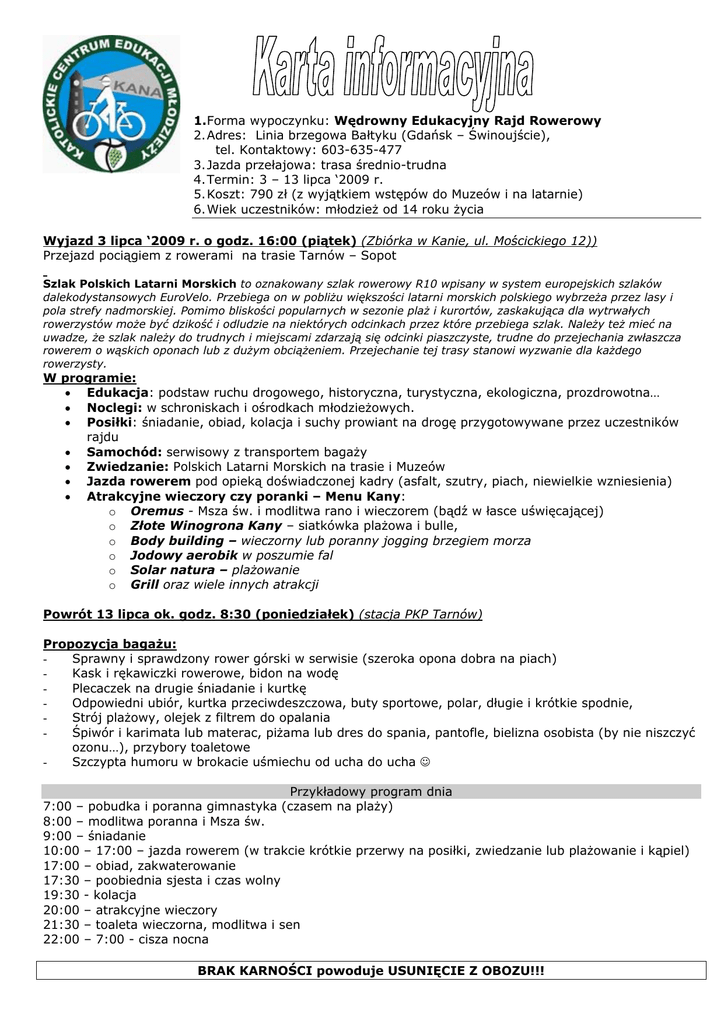 1.Forma wypoczynku: Wędrowny Edukacyjny Rajd Rowerowy 2. Adres: Linia brzegowa Bałtyku (Gdańsk – Świnoujście), tel. Kontaktowy: 603-635-477 3. Jazda przełajowa: trasa średnio-trudna 4. Termin: 3 – 13 lipca ‘2009 r. 5. Koszt: 790 zł (z wyjątkiem wstępów do Muzeów i na latarnie) 6. Wiek uczestników: młodzież od 14 roku życia Wyjazd 3 lipca ‘2009 r. o godz. 16:00 (piątek) (Zbiórka w Kanie, ul. Mościckiego 12)) Przejazd pociągiem z rowerami na trasie Tarnów – Sopot Szlak Polskich Latarni Morskich to oznakowany szlak rowerowy R10 wpisany w system europejskich szlaków dalekodystansowych EuroVelo. Przebiega on w pobliżu większości latarni morskich polskiego wybrzeża przez lasy i pola strefy nadmorskiej. Pomimo bliskości popularnych w sezonie plaż i kurortów, zaskakująca dla wytrwałych rowerzystów może być dzikość i odludzie na niektórych odcinkach przez które przebiega szlak. Należy też mieć na uwadze, że szlak należy do trudnych i miejscami zdarzają się odcinki piaszczyste, trudne do przejechania zwłaszcza rowerem o wąskich oponach lub z dużym obciążeniem. Przejechanie tej trasy stanowi wyzwanie dla każdego rowerzysty. W programie: Edukacja: podstaw ruchu drogowego, historyczna, turystyczna, ekologiczna, prozdrowotna… Noclegi: w schroniskach i ośrodkach młodzieżowych. Posiłki: śniadanie, obiad, kolacja i suchy prowiant na drogę przygotowywane przez uczestników rajdu Samochód: serwisowy z transportem bagaży Zwiedzanie: Polskich Latarni Morskich na trasie i Muzeów Jazda rowerem pod opieką doświadczonej kadry (asfalt, szutry, piach, niewielkie wzniesienia) Atrakcyjne wieczory czy poranki – Menu Kany: o Oremus - Msza św. i modlitwa rano i wieczorem (bądź w łasce uświęcającej) o Złote Winogrona Kany – siatkówka plażowa i bulle, o Body building – wieczorny lub poranny jogging brzegiem morza o Jodowy aerobik w poszumie fal o Solar natura – plażowanie o Grill oraz wiele innych atrakcji Powrót 13 lipca ok. godz. 8:30 (poniedziałek) (stacja PKP Tarnów) Propozycja bagażu: Sprawny i sprawdzony rower górski w serwisie (szeroka opona dobra na piach) Kask i rękawiczki rowerowe, bidon na wodę Plecaczek na drugie śniadanie i kurtkę Odpowiedni ubiór, kurtka przeciwdeszczowa, buty sportowe, polar, długie i krótkie spodnie, Strój plażowy, olejek z filtrem do opalania Śpiwór i karimata lub materac, piżama lub dres do spania, pantofle, bielizna osobista (by nie niszczyć ozonu…), przybory toaletowe Szczypta humoru w brokacie uśmiechu od ucha do ucha Przykładowy program dnia 7:00 – pobudka i poranna gimnastyka (czasem na plaży) 8:00 – modlitwa poranna i Msza św. 9:00 – śniadanie 10:00 – 17:00 – jazda rowerem (w trakcie krótkie przerwy na posiłki, zwiedzanie lub plażowanie i kąpiel) 17:00 – obiad, zakwaterowanie 17:30 – poobiednia sjesta i czas wolny 19:30 - kolacja 20:00 – atrakcyjne wieczory 21:30 – toaleta wieczorna, modlitwa i sen 22:00 – 7:00 - cisza nocna BRAK KARNOŚCI powoduje USUNIĘCIE Z OBOZU!!!