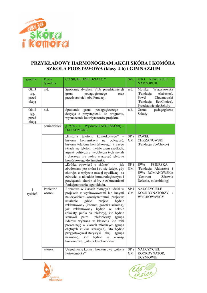 PRZYKŁADOWY HARMONOGRAM AKCJI SKÓRA I KOMÓRA SZKOŁA PODSTAWOWA (klasy 4-6) i GIMNAZJUM tygodnie Dzień tygodnia CO SIĘ BĘDZIE DZIAŁO ? Szk. KTO REALIZUJE NADZORUJE Ok. 3 tyg. przed akcją n.d. Spotkanie dyrekcji i/lub przedstawicieli grona pedagogicznego oraz przedstawicieli obu Fundacji n.d. Ok. 2 tyg. przed akcją n.d. Spotkanie grona pedagogicznego – decyzja o przystąpieniu do programu, wyznaczenie koordynatorów projektu. n.d. Monika Wyrzykowska (Fundacja Alabaster), Paweł Chrzanowski (Fundacja EcoChoice), Przedstawiciele Szkoły Grono pedagogiczne Szkoły poniedziałek g. 9.30 - 11 Wykłady RATUJ SKÓRĘ – DAJ KOMÓRĘ: 1 tydzień Poniedz./ wtorek wtorek / „Historia telefonu komórkowego” – historia komunikacji na odległość, historia telefonu komórkowego, z czego składa się telefon, metale ziem rzadkich, aspekt polityczny wydobycia tych metali i dlaczego nie wolno wyrzucać telefonu komórkowego do śmietnika. „Krótka opowieść o skórze” - jak zbudowana jest skóra i co się dzieje, gdy choruje, o wpływie naszej cywilizacji na zdrowie, o układzie immunologicznym i powiązaniu chorób skóry z zaburzeniami funkcjonowania tego układu. Rozmowa w klasach biorących udział w projekcie z wychowawcami lub innymi nauczycielami-koordynatorami projektu: ustalenie gdzie projekt będzie reklamowany (internet, gazetka szkolna), jak reklamowany będzie w szkole (plakaty, pudła na telefony), kto będzie stanowił patrol telefoniczny (grupa liderów wybrana w klasach), kto robi prezentację w klasach młodszych (grupa chętnych z klas starszych), kto będzie przygotowywał statystyki akcji (grupa uczniów), kto będzie w komisji konkursowej „Akcja Fotokomórka”. SP i GM PAWEŁ CHRZANOWSKI (Fundacja EcoChoice) SP i GM EWA PSIURSKA (Fundacja Alabaster) i EWA ROMANOWSKA (Centrum Zdrowia Dziecka, mikrobiolog) SP i GM NAUCZYCIELE KOORDYNATORZY / WYCHOWAWCY Uzgodnienie komisji konkursowej „Akcja Fotokomórka” SP i GM NAUCZYCIEL KOORDYNATOR, UCZNIOWIE środa Zespoły projektowe (3-4 osobowe) wymyślają sposób przeprowadzenia poszczególnych etapów projektu, a także tworzą harmonogram (oczywiście pod skrzydłami kogoś z nauczycieli). Praca w projekcie. SP i GM UCZNIOWIE, NAUCZYCIELE. środa Wykonanie plakatów, napisanie tekstów do gazetki, do internetu, przygotowanie pudeł, inne pomysły plastyczne. Początek zbiórki telefonów. Ogłoszenie konkursu „Akcja Fotokomórka” – fotorelacja wykonana komórką o tematyce proekologicznej. Komórki (lekcja) - o różnych komórkach naszego organizmu i sposobach na ich wspomaganie, ich interakcjach. Oglądanie różnych komórek pod mikroskopem, pobieranie komórek. Zajęcia plastyczne – budowanie trójwymiarowego modelu skóry ze „śmieci”, poprzedzone oglądaniem fragmentu filmu o budowie skóry („Było sobie życie..”), a zakończone prezentacją przygotowanych w zespołach modeli. SP i GM NAUCZYCIELE PLASTYCY, J. POLSKI SP i GM UCZNIOWIE SP 4-6 NAUCZYCIELE PRZYRODY SP 4-6 Starsze klasy prezentują młodszym temat: o komórkach, o wpływie zanieczyszczenia środowiska na zdrowie, o celu i przebiegu akcji. Zajęcia dramowe metodą stymulatorów – przybliżenie sytuacji gimnazjalisty z chorą skórą i pogorszonym wyglądem. SP I GM UCZNIOWIE KL. 4 – 6, max. 30 osób; czas do 1 h 45 min ALABASTER– E. Psiurska, M. Wyrzykowska, K. Klimczak UCZNIOWIE, NAUCZYCIELE (też klas młodszych) Warsztaty z psychologiem szkolnym – rozmowy o empatii, tolerancji, pomaganiu, działaniom charytatywnym, o współzależnościach społecznych (ktoś wyrzuca śmieci, ktoś niepełnosprawny ma pracę) rozmowy podsumowujące projekt i przygotowujące do wyjazdu do sortowni śmieci. Wyjazd do sortowni śmieci Stowarzyszenia Ekon (szkoła zapewnia transport, maks. 50 osób zaangażowanych w projekt). Grupa uczniów robi reportaż fotograficzny i filmowy komórkami z wyprawy. Wystawa zdjęć „Akcja Fotokomórka”. Głosowanie uczniów. SP I GM Finał SZKOLNEJ AKCJI SKÓRA I KOMÓRA.. i konkursu „Akcja Fotokomórka”. Komentarz na facebooku plus galeria zdjęć i film. SP I GM czwartek piątek poniedziałek Wtorek środa GM 2 tydzień czwartek piątek 3 tydzień Pon. – czw. piątek UCZNIOWIE GIMNAZJUM, max. 30 osób; czas 1 h 45 min ALABASTER– M. Romanowski, M. Wyrzykowska PSYCHOLOG SZKOLNY / WYCHOWAWCA KLASY SP I GM PAWEŁ CHRZANOWSKI (Fundacja EcoChoice) SP i GM UCZNIOWIE PLUS NAUCZYCIEL KOORDYNATOR NAUCZYCIELE, UCZNIOWIE, PRZEDSTAWICIEL(E) FUNDACJI 4 tydzień piątek Pokaz filmu i fotorelacji z wyjazdu o sortowni śmieci plus komentarze uczniów. SP i GM Pon. – wt. Przekazanie telefonów Fundacjom SP i GM NAUCZYCIELE, UCZNIOWIE, PRZEDSTAWICIEL(E) FUNDACJI