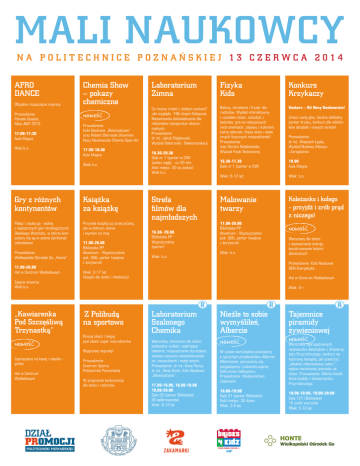 MALI NAUKOWCY NA POLITECHNICE POZNAŃSKIEJ 13 CZERWCA 2014 AFRO DANCE Oficjalne rozpoczęcie imprezy Prowadzenie: Pamela Ossete, Miss AWF 2013 17:00-17:30 Aula Magna Wiek b.o. Chemia Show – pokazy chemiczne NOWOŚĆ Prowadzenie: Koło Naukowe „Bioinicjatywa” oraz Robert Biernacki showmen Nocy Naukowców Chemia Open Air 17:30-18:30 Aula Magna Wiek b.o. Gry z różnych kontynentów Książka za książkę Pokaz i nauka go - jednej z najstarszych gier strategicznych Dalekiego Wschodu, w której komputery nie są w stanie dorównać człowiekowi. Przynieś książkę już przeczytaną, ale w dobrym stanie i wymień na inną 17.00-20.00 Biblioteka PP Akwarium - Wypożyczalnia pok. 006, parter (wejście z korytarza) Prowadzenie: Wielkopolski Ośrodek Go „Honte” 17.00-20.00 Hol w Centrum Wykładowym Zajęcia otwarte Wiek b.o. „Kawiarenka Pod Szczęśliwą Trzynastką” NOWOŚĆ Zapraszamy na kawę i ciastko gratis Hol w Centrum Wykładowym Laboratorium Zimna Fizyka Kids Konkurs Krzykaczy Co można zrobić z ciekłym azotem? Jak wygląda -196 stopni Celsjusza. Niesamowite doświadczenia dla miłośników temperatur ekstremalnych. Prowadzenie: dr inż. Jakub Pająkowski, Wydział Elektroniki i Telekomunikacji Balony, strzelanie i fryzjer dla rodziców. Wykład interaktywny z udziałem dzieci, szaszłyki z balonów, gra na nietypowych instrumentach, zabawy z kolorami, tańce piłeczek, fizyka stołu i wiele innych fizycznych niespodzianek! Prowadzenie: mgr Dorota Gołębiewska, Wydział Fizyki Technicznej Konkurs – Hit Nocy Naukowców! 16.30-17.30 Sala nr 1 (parter w CW) 19.00 Aula Magna Wiek: 6-12 lat Wiek: b.o. Malowanie twarzy Koleżanko i kolego - przyjdź i zrób prąd z niczego! 18.30-20.30 Sala nr 1 (parter w CW) (pokaz ciągły - co 20 min. ilość miejsc: 20 os./pokaz) Wiek b.o. Strefa filmów dla najmłodszych 16.30- 20.00 Biblioteka PP Wypożyczalnia (parter) Wiek: b.o. 17.00-20.00 Biblioteka PP Akwarium - Wypożyczalnia pok. 006, parter (wejście z korytarza) Wiek: b.o. Zmierz swój głos, bardzo dokładny pomiar krzyku, konkurs dla miłośników decybeli i nowych wrażeń Prowadzenie: dr inż. Wojciech Łapka, Wydział Budowy Maszyn i Zarządzania NOWOŚĆ Warsztaty dla dzieci z wytwarzania energii, konstruowanie baterii słonecznych Prowadzenie: Koło Naukowe SKN Energetyka Wiek: 3-17 lat (książki dla dzieci i młodzieży) Hol w Centrum Wykładowym Wiek: 6+ Z Polibudą na sportowo Rzucaj skacz i biegaj pod okiem super instruktorów Wygrywaj nagrody! Prowadzenie: Centrum Sportu Politechniki Poznańskiej W programie konkurencje dla dzieci i rodziców. Laboratorium Szalonego Chemika Nieźle to sobie wymyśliłeś, Albercie Warsztaty chemiczne dla dzieci; podwodny wulkan, wędrujące bakterie, rozpuszczanie styropianu, zabawa cieczami nienewtonowskimi, nanocukierki i wiele innych. Prowadzenie: dr inż. Anna Parus, dr inż. Alicja Szulc, Koło Naukowe „Bioinicjatywa”. NOWOŚĆ 17.00-18.00, 18.00-19.00 19.00-20.00 Sala 53 (parter Biblioteka) 20 osób/warsztat Wiek: 6-12 lat W czasie warsztatów poczytamy o sprytnym przedszkolaku Albercie Albertsonie, poruszamy się, pozgadujemy i pokonstruujemy tekturowe helikoptery. Prowadzenie: Wydawnictwo Zakamarki 18:00-19:00 Sala 51 (parter Biblioteka) Ilość miejsc: 30 dzieci Wiek: 3-6 lat Tajemnice piramidy żywieniowej NOWOŚĆ Warsztaty zaprzyjaźnionych naukowców dietetyków z Uniwersytetu Przyrodniczego, konkurs na kolorową kanapkę, jak utworzyć „idealnie zbilansowany talerz”, wpływ niezdrowej żywności na dzieci. Prowadzenie: Marta Kozioł, Anna Kudlak z Uniwersytetu Przyrodniczego 18:00-19:00, 19:00-20:00 Sala 121 (Biblioteka) 15 osób/ warsztat Wiek: 5-12 lat Poli-Komiks Warsztaty rysowania komiksów Uczestnicy warsztatów pod kierunkiem prowadzącego stworzą komiks- fascynujacą jednoplanszową historię. Prowadzenie: dr inż. Tomasz Jeż, Wydział Budownictwa i Inżynierii Lądowej 16:30-17:30, 18:00-19:00 Sala 6 (parter, CW) Grupy 10-osobowe Wiek: 7-12 lat (wymagana umiejętność pisania lub obecność osoby dorosłej) Wykrywacz kłamstw Stwórz grę komputerową Symulator motoszybowca Fregata Warsztaty w laboratorium, obserwuj zjawisko trzepotania skrzydeł, wejdź do motoszybowca i poczuj się jak prawdziwy pilot. Prowadzenie: dr inż. Agnieszka Wróblewska, mgr inż. Łukasz Semkło, Wydział Maszyn Roboczych i Transportu Prowadzenie: Jakub Marszałkowski, Wydział Informatyki, organizator Zjazdu Twórców Gier Warsztaty spawania światłowodów i druku 3D UWAGA! Na większość warsztatów i pokazów wstęp wolny. Na wybrane warsztaty (zaznaczone w programie) wymagana wcześniejsza rezerwacja w dniach: 18.00-19.00 Sala 123 (Biblioteka) 10-11 CZERWCA Ilość miejsc: 80 Wiek: b.o. 10 osób/warsztat Wiek: 7-14 lat NOWOŚĆ Rezerwacje przyjmuje Przemysław Kozakiewicz tel. 61 224 45 22 Poznański Teatr Lalki „Dudula” spektakl pt. „Dwa koziołki wg Tadeusza Kraszewskiego” 16.30-17.30 17.45-18.45 19.00-20.00 Biblioteka PP Czytelnia – Informatorium pok. 102, I piętro 16.00-16.30 16.45-17.15 17.30-18.00 Centrum Mechatroniki, Biomechaniki i Nanoinzynierii Sala 124 15 osób/ warsztat Wiek: 6+ 16.00-18.00 wiek 3-7 lat 18.00-20.00 wiek 8-12 lat Hol w Bibliotece Grupy 20-osobowe „Dwa koziołki wg Tadeusza Kraszewskiego” Prowadzenie: BRICKS4KIDDZ Spawanie Internetu 16.00-16.30, 16.45-17.15 17.30-18.00 Centrum Mechatroniki, Biomechaniki i Nanoinzynierii Sala: 222 6 osób/warsztat Wiek: 6+ Prowadzenie: Fundacja Serdecznik 18:00-19:00 19:30-20:30 Biblioteka PP, Sala 116 12 osób/warsztat Wiek: od 13-16 lat 17.00-18.30 wiek 3-10 18.30-20.00 wiek 10-18 Katedra Techniki Cieplnej, Hala 19, sala 18 Grupy po 12 osób – warsztaty tworzenie konstrukcji z klocków Lego Pokaz EEG i Eyetracking Zrób swojego robota ekologicznego. Z czego? Ze wszystkiego;-), wykorzystaj papier, folię, tkaniny, drewno… Kreatywne warsztaty plastyczne. Przyspieszony kurs - po 60 minutach każdy uczestnik wyjdzie z własną, prost