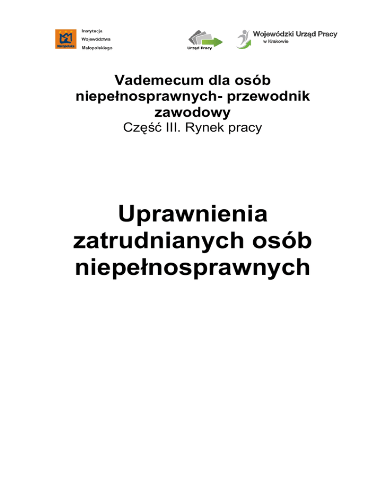 Vademecum dla osób niepełnosprawnych- przewodnik zawodowy Część III. Rynek pracy Uprawnienia zatrudnianych osób niepełnosprawnych SPIS TREŚCI: Zatrudnianie osób niepełnosprawnych str. 3 Obowiązek przedstawiania orzeczenia str. 3 Status zakładu pracy a orzeczenie str. 4 Stanowisko pracy str. 4 Czas pracy str. 5 Dodatkowa przerwa w pracy str. 5 Urlop str. 6 Prawo do korzystania ze zwolnienia z pracy str. 7 Turnus rehabilitacyjny str. 8 Badania specjalistyczne str. 9 Przydatne adresy stron www str. 10 2 Opracowano w CIiPKZ w Tarnowie na podstawie Informacji umieszczonych na stronach internetowych i obowiązujących przepisów prawnych. . kwiecień 2015 Zatrudnienie osób niepełnosprawnych Osoby niepełnosprawne mają takie samo prawo do pracy jak osoby zdrowe. Jednakże ze względu na mniejszą sprawność nie mogą podlegać tym samym rygorom, co pracownicy zdrowi. Dlatego też przepisy prawa odmiennie regulują niektóre ich uprawnienia i obowiązki pracownicze. Dodatkowe uprawnienia osób niepełnosprawnych wynikają z przepisów art. 14 - 20 ustawy z dnia 27 sierpnia 1997 r. o rehabilitacji zawodowej i społecznej oraz zatrudnianiu osób niepełnosprawnych (Dz. U. 123 poz. 776, z późn. zm.). Obowiązek przedstawienia orzeczenia Ustawa o rehabilitacji niepełnosprawnych nie zawodowej ustanawia i społecznej obowiązku oraz zatrudnianiu poinformowania osób pracodawcy o posiadaniu orzeczenia o stopniu niepełnosprawności. Korzystanie przez osobę niepełnosprawną z uprawnień pracowniczych przewidzianych w ustawie o rehabilitacji (…) jest prawem a nie obowiązkiem danego pracownika. Jednakże zgodnie z art. 221 § 1 Kodeksu pracy, do którego odsyła art. 66 ustawy o rehabilitacji (...) w sprawach nieuregulowanych jej przepisami, „Pracodawca ma prawo żądać od osoby ubiegającej się o zatrudnienie podania danych osobowych obejmujących: imię (imiona) i nazwisko, imiona rodziców, datę urodzenia, miejsce zamieszkania (adres do korespondencji), wykształcenie, przebieg dotychczasowego zatrudnienia”. Powyższy katalog informacji rozszerza § 2 pkt 1 art. 221 Kodeksu pracy, zgodnie z którym „Pracodawca ma prawo żądać od pracownika podania, niezależnie od danych 3 Opracowano w CIiPKZ w Tarnowie na podstawie Informacji umieszczonych na stronach internetowych i obowiązujących przepisów prawnych. . kwiecień 2015 osobowych, o których mowa w § 1, także innych danych osobowych pracownika, a także imion i nazwisk oraz dat urodzenia dzieci pracownika, jeżeli podanie takich danych jest konieczne ze względu na korzystanie przez pracownika ze szczególnych uprawnień przewidzianych w prawie pracy”. W tej kategorii mieści się również informacja o stopniu niepełnosprawności. Decyzja o zgłoszeniu pracodawcy faktu posiadania orzeczenia o stopniu niepełnosprawności należy wyłącznie do pracownika. Osoba niepełnosprawna nie zgłaszając faktu posiadania orzeczenia nie ponosi z tego tytułu żadnych negatywnych konsekwencji. Status zakładu pracy a orzeczenie Zaliczenie do znacznego albo umiarkowanego stopnia niepełnosprawności osoby z naruszoną sprawnością organizmu – niezdolnej do pracy albo zdolnej do pracy jedynie w warunkach pracy chronionej – nie wyklucza możliwości zatrudnienia takiej osoby u pracodawcy niezapewniającego warunków pracy chronionej, w przypadku przystosowania stanowiska pracy do potrzeb takiej osoby niepełnosprawnej lub w przypadku zatrudnienia w formie telepracy. Kontrolę w zakresie przystosowania stanowiska pracy do potrzeb osoby niepełnosprawnej, sprawuje Państwowa Inspekcja Pracy. Jak więc z powyższego wynika, osoba legitymująca się orzeczeniem o znacznym lub umiarkowanym stopniu niepełnosprawności, może być zatrudniona u pracodawcy nieposiadającego statusu zakładu pracy chronionej. Stanowisko pracy Osobie zatrudnionej, która w wyniku wypadku przy pracy lub choroby zawodowej utraciła zdolność do pracy na dotychczasowym stanowisku, pracodawca jest obowiązany wydzielić lub zorganizować odpowiednie stanowisko pracy 4 Opracowano w CIiPKZ w Tarnowie na podstawie Informacji umieszczonych na stronach internetowych i obowiązujących przepisów prawnych. . kwiecień 2015 z podstawowym zapleczem socjalnym, nie później niż w okresie trzech miesięcy od daty zgłoszenia przez tę osobę gotowości przystąpienia do pracy. Zgłoszenie gotowości przystąpienia do pracy powinno nastąpić w ciągu miesiąca od dnia uznania za osobę niepełnosprawną. Tego przepisu nie stosuje się, gdy wyłączną przyczyną wypadku przy pracy było naruszenie przepisów w zakresie bezpieczeństwa i higieny pracy przez pracownika z jego winy lub jego stanu nietrzeźwości - udowodnione przez pracodawcę. Czas pracy Czas pracy osoby niepełnosprawnej nie może przekraczać 8 godzin na dobę i 40 godzin tygodniowo. Czas pracy osoby niepełnosprawnej zaliczonej do znacznego lub umiarkowanego stopnia niepełnosprawności nie może przekraczać 7 godzin na dobę i 35 godzin tygodniowo. Osoba niepełnosprawna nie może być zatrudniona w porze nocnej i w godzinach nadliczbowych. Zmniejszony wymiar czasu pracy obowiązuje od dnia następującego po przedstawieniu pracodawcy orzeczenia o niepełnosprawności. Przepisów powyższych nie stosuje się: do osób zatrudnionych przy pilnowaniu oraz gdy, na wniosek osoby zatrudnionej, lekarz przeprowadzający badania profilaktyczne pracowników lub w razie jego braku, lekarz sprawujący opiekę nad tą osobą, wyrazi na to zgodę. Koszty tych badań ponosi pracodawca. Dodatkowa przerwa w pracy Osoba niepełnosprawna ma prawo do dodatkowej przerwy w pracy na gimnastykę usprawniającą lub wypoczynek. Czas przerwy wynosi 15 minut i jest wliczany do czasu pracy. Nie narusza to przepisów Kodeksu pracy. Stosowanie specjalnych norm czasu pracy, nie powoduje obniżenia wysokości wynagrodzenia wypłacanego w stałej miesięcznej wysokości. 5 Opracowano w CIiPKZ w Tarnowie na podstawie Inf