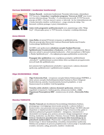 Dariusz BARANIK - moderator konferencji Dariusz Baranik - moderator konferencji. Prezenter telewizyjny, dziennikarz TVP Szczecin. Gospodarz i współautor programu "Zawsze po 18.00" oraz twarz serwisu informacyjnego "Kronika". Z wykształcenia prawnik. W TVP Szczecin pracuje od 2001 r. Zawsze marzył o pracy w telewizji - by być dziennikarzem ale z braku kierunku studiów wybrał prawo – czego zresztą nie żałuje. Ten kierunek wybitnie pomaga w pracy dziennikarza. Autor wielu programów publicystycznych m.in. popularnego cyklu "Misja Gryf”. Od początku pracy w TVP Szczecin, związany z redakcją informacji. Anna BULKA Anna Bulka od ponad 25 lat jest związana ze spółdzielczością. Obecnie pracuje jako Kierownik Centrum Ekonomii Społecznej Związku Lustracyjnego Spółdzielni Pracy. Od 2005 r. jest społecznym członkiem zarządu Fundacji Rozwoju Spółdzielczości Uczniowskiej w Krakowie, a od 2011 r. wiceprezesem. Bierze aktywny udział w pracach komisji konkursów: „Dziś oszczędzam w SKO jutro w Banku Spółdzielczym”, „Na najlepiej pracującą spółdzielnie uczniowską”. Propaguje idee spółdzielcze oraz współpracę pomiędzy spółdzielniami „dorosłych” i spółdzielniami uczniowskimi, które są miejscem przygotowania nowych kadr dla spółdzielczości. Jest autorem lub współautorem artykułów i opracowań z zakresu ekonomii społecznej, spółdzielczości i spółdzielczości socjalnej. Olga OCZKOWSKA - FIUK Olga Oczkowska-Fiuk – wiceprezes zarządu Salonu Edukacyjnego EMPIRIA, a także: prezes zarządu Zachodniopomorskiej Fundacji na Rzecz Integracji Środowiskowej, autorka i koordynatorka licznych projektów, w tym finansowanych ze środków Unii Europejskiej. Trenerka cyklu szkoleń z zakresu ekonomii społecznej, miłośniczka zagadnień związanych z kulturą języka; odznaczona tytułem „Lider Organizacji Pozarządowej 2004”, nominowana do tytułu „Niezwykła Polka 2007”. Monika TOMCZYK Monika Tomczyk jest dyrektorem Szczecińskiego Inkubatora Kultury, promującego i rozwijającego innowacyjne pomysły z zakresu kultury i kreatywności, oraz prezesem stowarzyszenia Media Dizajn. Od 2010 roku jest ekspertem w międzynarodowym projekcie Design entrepreneurship, gdzie w interdyscyplinarnych grupach studentów – designerzy, inżynierowie i ekonomiści rozwiązuje, przy pomocy procesów design management i design thinking, konkretne casy dla firm z Niemiec, Szwecji i Polski. Jej celem jest twórcze i kreatywne poszukiwanie rozwiązań, które koncentrują się na potrzebach użytkowników. Planowanie i wspierania działalności sektora kreatywnego w sferze funkcjonalnej, wizualnej, emocjonalnej i społecznej. Holistyczne podejście do procesu projektowania wykorzystuje w kształtowaniu eventów, towarów, usług, procesów, mediów i środowisk. Katarzyna ZWARZANY Katarzyna Zwarzany - niezależny ekspert ds. ekonomii społecznej, absolwentka wydziału ekonomicznego Uniwersytetu Szczecińskiego, ekspert z listy Ministerstwa Rozwoju Regionalnego ds. oceny merytorycznej wniosków Programu Operacyjnego Kapitał Ludzki (w zakresie integracji społecznej, edukacji oraz rynku pracy), trener edukacji ekonomicznej i finansowej, współpracownik i wolontariusz szeregu organizacji pozarządowych i podmiotów ekonomii społecznej w regionie zachodniopomorskim, pedagog. Wyróżniona w plebiscycie Głosu Szczecińskiego "Kobieta Przedsiębiorcza 2013". Sylwia ŻMIJEWSKA - KWIRĘG Sylwia Żmijewska-Kwiręg jest absolwentką Międzywydziałowych Interdyscyplinarnych Studiów Humanistycznych na Uniwersytecie Warszawskim. Od 2001 pracuje w Fundacji Centrum Edukacji Obywatelskiej jako koordynatorka projektów edukacyjnych oraz zarządza zespołem edukacji obywatelskiej i ekonomicznej. Jest autorką licznych publikacji poświęconych wychowaniu obywatelskiemu oraz na rzecz przedsiębiorczości. Współautorka innowacyjnego programu nauczania ekonomii w praktyce „Młodzi Przedsiębiorczy. Ekonomia w praktyce”, którego głównymi założeniami są: praca indywidualna uczniów i uczennic w e-portfolio, praca zespołowa podczas realizacji projektu (przedsięwzięcia ekonomicznego) oraz i ocenianie kształtujące.