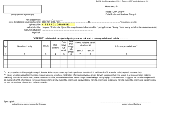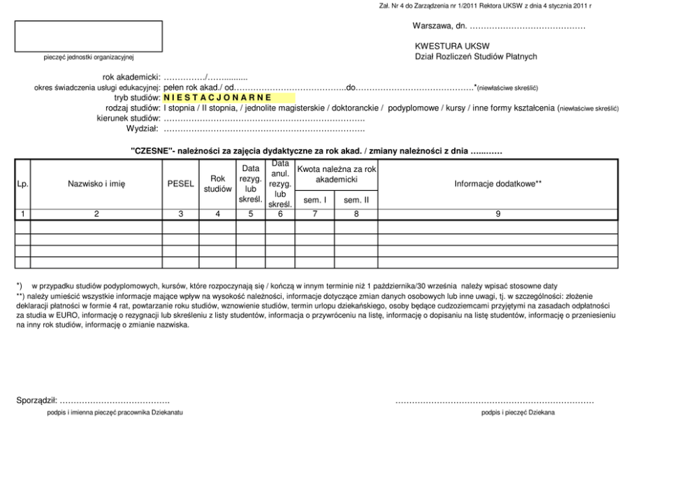 Zał. Nr 4 do Zarządzenia nr 1/2011 Rektora UKSW z dnia 4 stycznia 2011 r Warszawa, dn. …………………………………… KWESTURA UKSW Dział Rozliczeń Studiów Płatnych pieczęć jednostki organizacyjnej rok akademicki: ……………/…….......... okres świadczenia usługi edukacyjnej: pełen rok akad./ od…………………………………..do…………………………………….*(niewłaściwe skreślić) tryb studiów: rodzaj studiów: kierunek studiów: Wydział: Lp. 1 NIESTACJONARNE I stopnia / II stopnia, / jednolite magisterskie / doktoranckie / podyplomowe / kursy / inne formy kształcenia (niewłaściwe skreślić) ………………………………………………………………. ………………………………………………………………. "CZESNE"- należności za zajęcia dydaktyczne za rok akad. / zmiany należności z dnia …...…… Data Data Kwota należna za rok anul. Rok rezyg. akademicki Nazwisko i imię PESEL Informacje dodatkowe** rezyg. studiów lub lub skreśl. sem. I sem. II skreśl. 2 3 4 5 6 7 8 9 *) w przypadku studiów podyplomowych, kursów, które rozpoczynają się / kończą w innym terminie niż 1 pażdziernika/30 września należy wpisać stosowne daty **) należy umieścić wszystkie informacje mające wpływ na wysokość należności, informacje dotyczące zmian danych osobowych lub inne uwagi, tj. w szczególności: złożenie deklaracji płatności w formie 4 rat, powtarzanie roku studiów, wznowienie studiów, termin urlopu dziekańskiego, osoby będące cudzoziemcami przyjętymi na zasadach odpłatności za studia w EURO, informację o rezygnacji lub skreśleniu z listy studentów, informacja o przywróceniu na listę, informację o dopisaniu na listę studentów, informację o przeniesieniu na inny rok studiów, informację o zmianie nazwiska. Sporządził: …………………………………. podpis i imienna pieczęć pracownika Dziekanatu ……………………………………………………………… podpis i pieczęć Dziekana