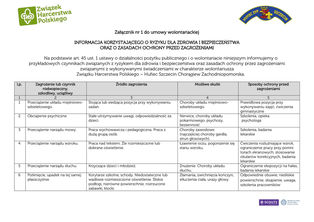 Załącznik nr 1 do umowy wolontariackiej INFORMACJA KORZYSTAJĄCEGO O RYZYKU DLA ZDROWIA I BEZPIECZEŃSTWA ORAZ O ZASADACH OCHRONY PRZED ZAGROŻENIAMI Na podstawie art. 45 ust. 1 ustawy o działalności pożytku publicznego i o wolontariacie niniejszym informujemy o przykładowych czynnikach związanych z ryzykiem dla zdrowia i bezpieczeństwa oraz zasadach ochrony przez zagrożeniami związanymi z wykonywanymi świadczeniami w charakterze wolontariusza Związku Harcerstwa Polskiego – Hufiec Szczecin Chorągiew Zachodniopomorska. Lp. 1 1 Zagrożenie lub czynnik niebezpieczny, szkodliwy, uciążliwy 2 Przeciążenie układu mięśniowoszkieletowego. Źródło zagrożenia Możliwe skutki 3 Stojąca lub siedząca pozycja przy wykonywaniu zadań. 4 Choroby układu mięśniowoszkieletowego. Nerwice, choroby układu pokarmowego, psychozy, bezsenność Choroby zawodowe (najczęściej choroby gardła, strun głosowych). Łzawienie oczu, pogorszenie się stanu wzroku. 2 Obciążenie psychiczne Stałe utrzymywanie uwagi, odpowiedzialność za dzieci 3 Przeciążenie narządu mowy. Praca wychowawcza i pedagogiczna. Praca z dużą grupą osób. 4 Przeciążenie narządu wzroku. Praca nad tekstem. Źle rozmieszczone lub dobrane oświetlenie. 5 Przeciążenie narządu słuchu. Krzyczące dzieci i młodzież. 6 Potknięcie, upadek na tej samej płaszczyźnie. Korytarze szkolne, schody. Niedostateczne lub wadliwie rozmieszczone oświetlenie. Śliskie podłogi, nierówne powierzchnie, rozrzucone zabawki, klocki Znużenie. Choroby układu słuchu. Złamania, zwichnięcia kończyn, stłuczenia ciała, urazy głowy. Sposoby ochrony przed zagrożeniami 5 Prawidłowa pozycja przy wykonywaniu zajęć, ćwiczenia gimnastyczne Szkolenia, opieka psychologa Szkolenia, badania lekarskie Ćwiczenia rozluźniające wzrok, ograniczenie pracy przy pomni torach ekranowych, stosowanie okularów korekcyjnych, badania lekarskie Ograniczenie ekspozycji na hałas, badania lekarskie Odpowiednie obuwie, nieśliskie powierzchnie, skupienie, uwaga, szkolenia pracowników 7 Upadek na niższy poziom 8 Spadające przedmioty – uderzenie, przygniecenie. 9 Kontakt z nieruchomymi elementami. 10 Uderzenie, przyciśnięcie ruchomymi elementami. Szuflady, biurka, prowadzenie zajęć ruchowych. 11 Prąd elektryczny o napięciu do 1 kV. Urządzenia i pomoce dydaktyczne zasilane energią elektryczną. 12 13 Prąd elektryczny o napięciu powyżej 1 kV Wypadek komunikacyjny Urządzenia i instalacje na terenie bazy ZHP w Miroszewie. Wycieczki, biwaki, zwiady terenowe 14 Wirus Coronavirida Gr. 2 15 Wirusy ECHO (Picomaviridae) Gr. 2 Ludzie Droga przenoszenia: Powietrzno-kropelkowa Ludzie Droga przenoszenia: Powietrzno-kropelkowa, bezpośrednia 16 Wirusy zapalenia wątroby typ A (Picomaviridae) Gr. 2 Cytomegalovirus hominis – herpesviridae Gr. 2 17 Ćwiczenia gimnastyczne na drabinkach, równoważni, zawieszanie elementów na wysokości, praca na drabinie itp. Pomoce dydaktyczne (np. książki), przechowywane w szafach, ruchome tablice i wiszące na ścianach pomoce dydaktyczne (np. plansze). Elementy wyposażenia klasy (ławki, biurka szafki), wąskie przejścia. Ludzie, ścieki Droga przenoszenia: Pokarmowa, bezpośrednia Ludzie Droga przenoszenia: Bezpośrednia, kontakt ze śliną i moczem chorego Stłuczenia, zwichnięcia, złamania kości, wstrząśnienie mózgu, śmierć Drobne urazy ciała (stłuczenia, skaleczenia) – szczególnie głowy i rąk. Utrzymanie odpowiedniej kondycji fizycznej, szkolenia, skupienie, uwaga Wzmożona uwaga Drobne urazy ciała (stłuczenia, skaleczenia) – szczególnie kończyn. Drobne urazy ciała (stłuczenia) – szczególnie rąk i palców, złąmania. Porażenie prądem elektrycznym. Śmierć. Pośrednio drobne urazy kończyn (stłuczenia). Porażenie prądem elektrycznym. Śmierć. Ciężkie uszkodzenie ciała, śmierć Wzmożona uwaga Łagodne choroby górnych dróg oddechowych Zapalenie układu oddechowego, angina, zapalenie opon mózgowych, mięśnia sercowego, wątroby i jelit, skóry, biegunki Zapalenie wątroby, jelit, żołądka Mononukleoza z gorączką, uszkodzenia płodu Wzmożona uwaga Przeglądy i badania instalacji elektrycznej, sprawny sprzęt Przeglądy i badania instalacji elektrycznej, sprawny sprzęt Przestrzegania prawa o ruchu drogowym. Wzmożona uwaga Przestrzeganie zasad higieny Przestrzeganie zasad higieny Przestrzeganie zasad higieny, szczepienia Środki ochrony indywidualnej, dezynfekcja, ochrona pracownic w ciąży 18 Ludzki wirus upośledzenia odporności typu HIV-1, HIV-2 (Retroviridae) Gr. 3 Wirus opryszczki pospolitej – herpesviridae Gr. 2 Ludzie Droga przenoszenia: Bezpośrednia (przez krew i płyny ustrojowe) 20 Herpesvirus ospy wietrznej, półpaśca Gr. 2 21 Wirusy grypy (typ A, B, C) orthomyxoviridae Gr. 2 22 Wirus Odry Paramyxoviridae Gr. 2 23 Wirus świnki (nagminne zapalenie przyusznic) Paramyxoviridae Gr. 2 Parwowirus ludzki (B19) Gr. 2 Ludzie Droga przenoszenia: Powietrznokropelkowa Ludzie Droga przenoszenia: Powietrznokropelkowa Ludzie Droga przenoszenia: Powietrzno-kropelkowa, bezpośrednia Ludzie Droga przenoszenia: Powietrzno-kropelkowa, bezpośrednia Ludzie Droga przenoszenia: Powietrzno-kropelkowa Ludzie Droga przenoszenia: Powietrzno-kropelkowa, bezpośrednia Ludzie, ścieki Droga przenoszenia: Powietrzno-kropelkowa, bezpośrednia – pokarmowa Ludzie, Droga przenoszenia: bezpośrednia Ludzie Droga przenoszenia: powietrzno-kropelkowa Ludzie Droga przenoszenia: powietrzno-kropelkowa, przyranna 19 24 25 Wirus ostrego krwotocznego zapalenia spojówek Gr. 2 26 Wirusy polio (Picomaviridae) Gr. 2 27 Wirusy Togaviridae wirus różyczki Gr. 2 Bordetella pertussis pałeczka krztuśca Gr. 2 Maczugowiec błonicy Gr. 2 28 29 Ludzie Droga przenoszenia: Bezpośrednia, przez uszkodzoną skórę, kontakt rąk AIDS (zespół nabytego obniżenia odporności), infekcje towarzyszące, śmierć, nowotwory Opryszczka, pęcherzykowe zapalenie błon śluzowych jamy ustnej, sk