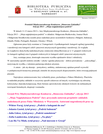 BIBLIOTEKA PUBLICZNA im. Władysława Jana Grabskiego w DZIELNICY URSUS m. st. WARSZAWY Warszawa, 13.03.2013 r. Protokół Międzynarodowego Konkursu „Słoneczna Zakładka” Edycja 2013 - „Moja najpiękniejsza podróż” W dniach 11-13 marca 2013 r. Jury Międzynarodowego Konkursu „Słoneczna Zakładka”, Edycja 2013 – „Moja najpiękniejsza podróż” w składzie: Małgorzata Bieńkowska, Joanna Olech i Małgorzata Strzałkowska oceniło prace nadesłane przez uczestników konkursu z Bułgarii, Indonezji, Irlandii, Polski, Portugalii, Rumunii, Ukrainy i Włoch. Zgłoszone prace były oceniane w 2 kategoriach i 4 podkategoriach: kategorii ogólnej (generalnej i narodowej) oraz kategorii szkół i pracowni artystycznych (generalnej i narodowej). Ze względu na wyjątkowo dużą liczbę nadesłanych prac ostatecznie sklasyfikowano je w 11 grupach wiekowych (w kategorii ogólnej) oraz 6 grupach wiekowych (w kategorii szkół i pracowni artystycznych). Jury, oceniając prace, dostrzegło znaczenie wysiłku opiekunów dzieci i młodzieży. W zauważalny sposób niektóre ośrodki / szkoły/ ogniska plastyczne – dobrze prowadzone – „uskrzydlają”, motywują do wysiłku, z talentem partnerują młodym artystom. A zatem – jak się okazuje – pomysłowy, ambitny, utalentowany opiekun potrafi wyzwolić w podopiecznych kreatywny potencjał, ośmielić do artystycznych eksperymentów, które owocują pięknymi pracami. Największe zainteresowanie Jury wzbudziły prace, pochodzące z Pałacu Młodzieży. Placówka ta nadesłała projekty zakładek w oczywisty sposób ciekawsze od innych, wyróżniające się odważną kolorystyką i dojrzałą kompozycją. Duże formaty sprowokowały młodych twórców do niebanalnych rozwiązań formalnych, ekspresji i rozmachu. Grand Prix Międzynarodowego Konkursu „Słoneczna Zakładka”, edycja 2013 - „Moja Najpiękniejsza Podróż” Jury przyznało autorom projektów zakładek nadesłanych przez Pałac Młodzieży w Warszawie. Autorami nagrodzonych prac są: - Wiktor Faraj, tytuł pracy: „Podróż z kolegami do zoo” - Jolanta Gastoł, tytuł pracy: „Podróż balonem” - Julia Gdesz, tytuł pracy: „Podróż samolotem” - Zofia Landowska, tytuł pracy: „Na plaży” - Lan Ha Vu Minh, tytuł pracy: „Nad morzem w Grecji” Biblioteka Publiczna im. W. J. Grabskiego w Dzielnicy Ursus m. st. Warszawy ul. Plutonu Torpedy 47, 02-495 Warszawa , REGON 012222665, NIP 522-24-07-294 tel/fax : + 48 / 22 882 43 00, e-mail: [email protected], http://www.bpursus.waw.pl - Katarzyna Nasiłowska, tytuł pracy: „Stadnina koni” - Milena Paszkowska, tytuł pracy: „Wycieczka w górach” - Ksymena Pawłowicz, tytuł pracy: „Krakowski Lajkonik” - Jan Siedlecki, tytuł pracy: „Na rybach” - Blanka Szczepanowska-Lay, tytuł pracy: „Lepimy bałwana” - Matylda Śledź, tytuł pracy: „Wieża Eiffla w Paryżu” - Patrycja Tomasik, tytuł pracy: „W górach” - Sylwia Wołczak, tytuł pracy: „W murzyńskiej wiosce” Instruktorami, pod których kierunkiem młodzi twórcy z Pałacu Młodzieży przygotowali nagrodzone projekty byli: Hanna Stefańska - kierownik Działu Sztuk Plastycznych oraz Saida Siczek i Bożena Szynkielewska. Ze względu na bardzo dużą ilość nadesłanych projektów Jury oceniało prace w 11 grupach wiekowych w kategorii ogólnej oraz w 6 grupach wiekowych w kategorii szkół i pracowni artystycznych. Miejsca w kategorii narodowej przyznawano jedynie w tych grupach wiekowych, w których prace zgłoszono przynajmniej z dwóch krajów. 1. Kategoria ogólna Kategoria ogólna – generalna, 5 lat (Irlandia, Polska) I miejsce ex aequo - Weronika Mickielewicz, zgłoszenie indywidualne, Warszawa, tytuł pracy: „Moje wakacje zimowe 2013” - Anna Tuptało, zgłoszenie indywidualne, Wejherowo, tytuł pracy: „20 000 mil podmorskiej żeglugi” na podstawie książki Juliusza Verne pod tym samym tytułem II miejsce ex aequo - Oskar Radziejewski, Przedszkole 164, Warszawa-Praga Płn., tytuł pracy: „Mój robot Robi” - Błażej Piekarniak, Przedszkole 275, Warszawa-Mokotów, tytuł pracy: „Remiza Strażaka Sama” - Wojciech Wiśniewski, Przedszkole, Damnica, tytuł pracy: „Moja ulubiona podróż do świata zwierząt zamieszkujących tajemnicze głębiny morskie”. III miejsce ex aequo - Klaudia Borowicz, Przedszkole 310, Warszawa-Wola, tytuł pracy: „Kosmiczna podróż” - Maciej Łotyszonok, Przedszkole 57, Warszawa-Praga Płd., tytuł pracy: „Moja najlepsza przygoda” - Antonina Kaczyńska, Przedszkole 343, Warszawa-Ursus, tytuł pracy: „Podróż na Gołąbki” - Teagan Boyle, Ard Rí Community National School, Navan, Irlandia, tytuł pracy: „Moja podróż na Biegun Północny” - Abigail Gunning, Ard Rí Community National School, Navan, Irlandia, tytuł pracy: “Moja podróż do Kerry” Kategoria ogólna – narodowa – Irlandia, 5 lat I miejsce ex aequo 2 - Teagan Boyle, Ard Rí Community National School, Navan, Irlandia, tytuł pracy: „Moja podróż na Biegun Północny” - Abigail Gunning, Ard Rí Community National School, Navan, Irlandia, tytuł pracy: „Moja podróż do Kerry” II miejsce - Jason Coyne, Ard Rí Community National School, Navan, Irlandia, tytuł pracy: „Moja podróż do Australii” III miejsce - Hayley Foster, Ard Rí Community National School, Navan, Irlandia, tytuł pracy: „Moja podróż po Wexford w Irlandii” Kategoria ogólna – narodowa – Polska, 5 lat I miejsce ex aequo - Weronika Mickielewicz, zgłoszenie indywidualne, Warszawa-Mokotów, tytuł pracy: „Moje wakacje zimowe 2013” - Anna Tuptało, zgłoszenie indywidualne, Wejherowo, tytuł pracy: „20 000 mil podmorskiej żeglugi” na podstawie książki Juliusza Verne pod tym samym tytułem II miejsce ex aequo - Oskar Radziejewski, Przedszkole 164, Warszawa-Praga Płn., tytuł pracy: „Mój robot Robi” - Błażej Piekarniak, Przedszkole 275, Warszawa-Mokotów, tytuł pracy: „Remiza S