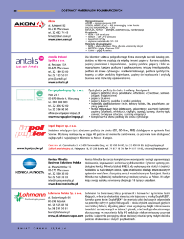 Dostawcy materiałów poligraficznych 38 Akon ul. Jutrzenki 82 02-230 Warszawa tel. 22 632 74 45 [email protected] www.akon.com.pl Antalis Poland Spółka z o.o. ul. Postępu 17A 02-676 Warszawa tel. 22 189 50 00 fax 22 189 50 01 [email protected] www.antalis.pl Europapier-Impap Sp. z o.o. Pass 20 J 05-870 Błonie k. Warszawy tel. 801 989 800 tel. 22 356 92 00 fax 22 356 92 90 [email protected] www.europapier-impap.pl Oprogramowanie: ADOBE – oprogramowanie DTP XITRON, HAMILLROAD – RIP, innowacyjny raster Auraia DIGITAL INFORMATION – CIP3 ENFOCUS, ALWAN – preflight, automatyzacja, standaryzacja Urządzenia: • AGFA – CtP termiczne • AMSKY – CtP UV i termiczne • basysPrint CtP UV • używane naświetlarki CtP i CtF Materiały eksploatacyjne: • AGFA – płyty offsetowe, filmy, chemia, atramenty ink-jet • ABEZETA – płyty offsetowe CtCP • TORAY – płyty waterless Dla klientów sektora poligraficznego firma stworzyła szeroki katalog produktów, w którym znajdują się między innymi: papiery i kartony ozdobne, papiery powlekane i niepowlekane, papiery pulchne, papiery i folie samoprzylepne, kartony graficzne i opakowaniowe, tektury introligatorskie, podłoża do druku cyfrowego i wielkoformatowego, podłoża syntetyczne, koperty, a także produkty higieniczne, papiery do kopiowania i artykuły biurowe oraz materiały opakowaniowe. Dystrybutor podłoży do druku i reklamy. Asortyment: • papiery graficzne (m.in. powlekane, offsetowe, etykietowe, samokopiujące, objętościowe) • papiery biurowe • papiery, koperty, pudełka i torebki ozdobne • materiały opakowaniowe (m.in. tektury faliste, lite, powlekane, papiery pakowe) • media reklamowe: folie (ploterowe, solwentowe, okienne); laminaty; papiery (blueback, whiteback, citylight, tapety); banery; tkaniny typu canvas; tworzywa sztuczne; systemy ekspozycji • kompleksowa oferta podłoży do druku cyfrowego Inpol Papier sp. z o.o. Jesteśmy wiodącym dystrybutorem podłoży do druku (GD, GD-liner, FBB) działającym w systemie Fast Service. Dostawy realizujemy w ciągu 48 godzin od momentu zamówienia, co pozwala nam obsługiwać najlepszych i największych Klientów w Polsce i Europie. www.inpolpapier.pl Centrala:ul. Czarnohucka 3, 42-600 Tarnowskie Góry, tel. 32 450 04 00, fax 32 450 04 99, [email protected] Zakład produkcyjny:ul. Fabryczna 18, 57-256 Bardo, tel. 74 817 19 70, fax 74 817 19 60, [email protected] Konica Minolta Business Solutions Polska ul. Muszkieterów 15 02-273 Warszawa tel. 22 560 33 00 fax 22 560 33 03 [email protected] www.konicaminolta.pl Konica Minolta dostarcza kompleksowe rozwiązania i usługi usprawniające drukowanie, kopiowanie i archiwizację dokumentów. Cyfrowe systemy produkcyjne Konica Minolta bizhub PRESS, do wykonywania niskich i średnich nakładów w najkrótszym czasie, łączą możliwości obsługi zróżnicowanych systemów workflow z korzystną ceną i wszechstronnymi funkcjami. Konica Minolta ma najbardziej rozbudowaną strukturę serwisu w Polsce. W całym kraju swoją opieką serwisową obejmuje 18 tysięcy urządzeń. Lohmann to światowej klasy producent i konwerter systemów taśm Lohmann Polska Sp. z o.o. klejących, w branży drukarskiej nierozłącznie kojarzony z marką DuploFLEX®. ul. Budowlanych 64 Szeroka gama taśm DuploFLEX® do montażu płyt drukowych odpowiada 80-298 Gdańsk na potrzeby różnych gałęzi fleksografii – druku etykiet, opakowań giętkich tel. 58 555 81 50 oraz tektury falistej. Wysokiej jakości druk uzyskujemy dzięki zróżnicowaniu fax 58 551 50 61 twardości zastosowanych w taśmach pianek, a technologia dwustronnego [email protected] elastycznego wzmocnienia folią PE redukuje niekontrolowany przyrost www.pl.lohmann-tapes.com punktu i zapewnia precyzyjny obraz drukowy również przy małym docisku podczas drukowania i dużych prędkościach. ś W I A T D R U K U 12/2 0 1 4 Dostawcy materiałówMpoligraficznych A I N T O P I C S Producent Lakierów Dyspersyjnych i UV dla Poligrafi 39 PLASTICS GROUP Sp. z o.o. ul. Kolumba 40 02-288 Warszawa tel. 22 575 08 00 fax 22 575 08 88 [email protected] www.plastics.pl Plastics Group jest czołowym dystrybutorem wysokiej klasy materiałów: płyt, folii, profili i półproduktów z tworzyw sztucznych. Branży poligraficznej oferujemy: folie PVC, PP, PET do druku offsetowego, sitowego i cyfrowego, folie ploterowe, banery laminowane i powlekane, folie magnetyczne, odblaskowe, flex i flock, a także folie i papiery transportowe. Jakość naszych produktów gwarantują znane marki, m.in. Avery Dennison, Chemica, Hexis, Politape, ATP, Klöckner, Folienwerk. Synthos S.A. 32-600 Oświęcim ul. Chemików 1 tel. 33 844 21-25 fax 33 842 42 18 [email protected] www.synthosgroup.com Spółka SYNTHOS S.A. wyrosła z firm chemicznych: Dwory S.A w Oświęcimiu oraz Kaučuk a.s.w czeskich Kralupach. Działalność SYNTHOS S.A. koncentruje się na trzech głównych grupach produktów: kauczuki syntetyczne, tworzywa styrenowe oraz produkty specjalistyczne: lateksy, dyspersje akrylowe i winylowe oraz kleje dyspersyjne do drewna oraz do papieru. Dynamiczny rozwój spółki w ostatnich latach sprawił, że stała się ona przedsiębiorstwem konkurencyjnym i przyjaznym dla środowiska, wprowadzającym na rynek nowoczesne produkty wysokiej jakości. tesa tape Sp. z o.o. Jesteśmy częścią firmy tesa SE. Dbamy, aby marka tesa była synonimem WYSOKIEJ JAKOŚCI produktów samoprzylepnych. Naszą ambicją jest wpływanie na rozwój rynku poligraficznego poprzez INNOWACYJNOŚĆ rozwiązań. Producentom z branży poligraficznej dostarczamy m.in.: • taśmy do MOCOWANIA form drukowych W DRUKU FLEKSOGRAFICZNYM • taśmy do ŁĄCZENIA WSTĘGI w procesach rolowych, np. w offsecie, roto, flekso czy przy przewijaniu papieru • taśmy używane W OPAKOWANIACH KARTONOWYCH: wzmacniające, rozrywające i zamykające • DORADZTWO TECHNICZNE i ROZWIĄZANIA SYSTEMOWE. ul. Gnieźnieńska 32 61-021 Poznań tel. 61 874