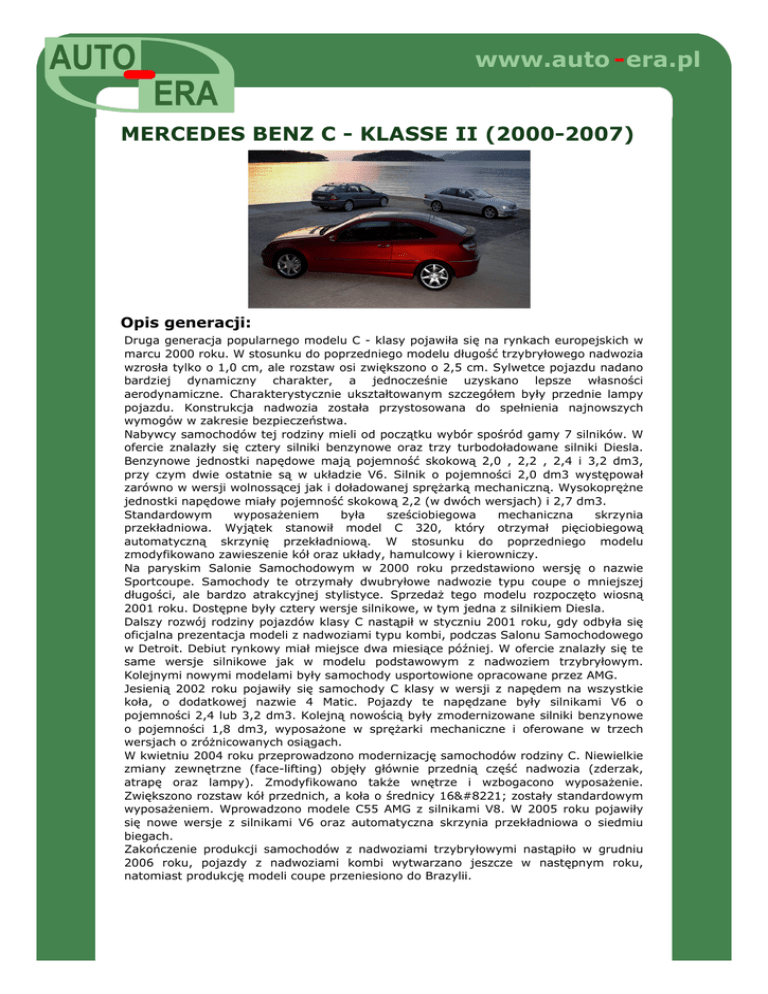 www.auto - era.pl MERCEDES BENZ C - KLASSE II (2000-2007) Opis generacji: Druga generacja popularnego modelu C - klasy pojawiła się na rynkach europejskich w marcu 2000 roku. W stosunku do poprzedniego modelu długość trzybryłowego nadwozia wzrosła tylko o 1,0 cm, ale rozstaw osi zwiększono o 2,5 cm. Sylwetce pojazdu nadano bardziej dynamiczny charakter, a jednocześnie uzyskano lepsze własności aerodynamiczne. Charakterystycznie ukształtowanym szczegółem były przednie lampy pojazdu. Konstrukcja nadwozia została przystosowana do spełnienia najnowszych wymogów w zakresie bezpieczeństwa. Nabywcy samochodów tej rodziny mieli od początku wybór spośród gamy 7 silników. W ofercie znalazły się cztery silniki benzynowe oraz trzy turbodoładowane silniki Diesla. Benzynowe jednostki napędowe mają pojemność skokową 2,0 , 2,2 , 2,4 i 3,2 dm3, przy czym dwie ostatnie są w układzie V6. Silnik o pojemności 2,0 dm3 występował zarówno w wersji wolnossącej jak i doładowanej sprężarką mechaniczną. Wysokoprężne jednostki napędowe miały pojemność skokową 2,2 (w dwóch wersjach) i 2,7 dm3. Standardowym wyposażeniem była sześciobiegowa mechaniczna skrzynia przekładniowa. Wyjątek stanowił model C 320, który otrzymał pięciobiegową automatyczną skrzynię przekładniową. W stosunku do poprzedniego modelu zmodyfikowano zawieszenie kół oraz układy, hamulcowy i kierowniczy. Na paryskim Salonie Samochodowym w 2000 roku przedstawiono wersję o nazwie Sportcoupe. Samochody te otrzymały dwubryłowe nadwozie typu coupe o mniejszej długości, ale bardzo atrakcyjnej stylistyce. Sprzedaż tego modelu rozpoczęto wiosną 2001 roku. Dostępne były cztery wersje silnikowe, w tym jedna z silnikiem Diesla. Dalszy rozwój rodziny pojazdów klasy C nastąpił w styczniu 2001 roku, gdy odbyła się oficjalna prezentacja modeli z nadwoziami typu kombi, podczas Salonu Samochodowego w Detroit. Debiut rynkowy miał miejsce dwa miesiące później. W ofercie znalazły się te same wersje silnikowe jak w modelu podstawowym z nadwoziem trzybryłowym. Kolejnymi nowymi modelami były samochody usportowione opracowane przez AMG. Jesienią 2002 roku pojawiły się samochody C klasy w wersji z napędem na wszystkie koła, o dodatkowej nazwie 4 Matic. Pojazdy te napędzane były silnikami V6 o pojemności 2,4 lub 3,2 dm3. Kolejną nowością były zmodernizowane silniki benzynowe o pojemności 1,8 dm3, wyposażone w sprężarki mechaniczne i oferowane w trzech wersjach o zróżnicowanych osiągach. W kwietniu 2004 roku przeprowadzono modernizację samochodów rodziny C. Niewielkie zmiany zewnętrzne (face-lifting) objęły głównie przednią część nadwozia (zderzak, atrapę oraz lampy). Zmodyfikowano także wnętrze i wzbogacono wyposażenie. Zwiększono rozstaw kół przednich, a koła o średnicy 16” zostały standardowym wyposażeniem. Wprowadzono modele C55 AMG z silnikami V8. W 2005 roku pojawiły się nowe wersje z silnikami V6 oraz automatyczna skrzynia przekładniowa o siedmiu biegach. Zakończenie produkcji samochodów z nadwoziami trzybryłowymi nastąpiło w grudniu 2006 roku, pojazdy z nadwoziami kombi wytwarzano jeszcze w następnym roku, natomiast produkcję modeli coupe przeniesiono do Brazylii.