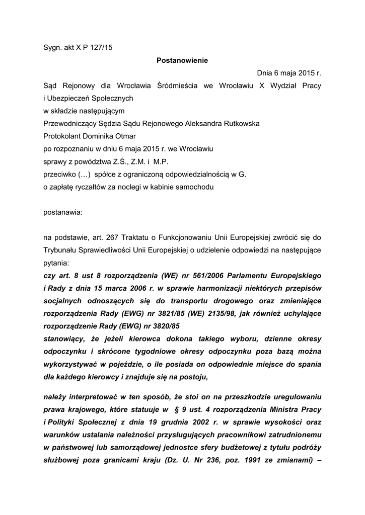 Sygn. akt X P 127/15 Postanowienie Dnia 6 maja 2015 r. Sąd Rejonowy dla Wrocławia Śródmieścia we Wrocławiu X Wydział Pracy i Ubezpieczeń Społecznych w składzie następującym Przewodniczący Sędzia Sądu Rejonowego Aleksandra Rutkowska Protokolant Dominika Otmar po rozpoznaniu w dniu 6 maja 2015 r. we Wrocławiu sprawy z powództwa Z.Ś., Z.M. i M.P. przeciwko (…) spółce z ograniczoną odpowiedzialnością w G. o zapłatę ryczałtów za noclegi w kabinie samochodu postanawia: na podstawie, art. 267 Traktatu o Funkcjonowaniu Unii Europejskiej zwrócić się do Trybunału Sprawiedliwości Unii Europejskiej o udzielenie odpowiedzi na następujące pytania: czy art. 8 ust 8 rozporządzenia (WE) nr 561/2006 Parlamentu Europejskiego i Rady z dnia 15 marca 2006 r. w sprawie harmonizacji niektórych przepisów socjalnych odnoszących się do transportu drogowego oraz zmieniające rozporządzenia Rady (EWG) nr 3821/85 (WE) 2135/98, jak również uchylające rozporządzenie Rady (EWG) nr 3820/85 stanowiący, że jeżeli kierowca dokona takiego wyboru, dzienne okresy odpoczynku i skrócone tygodniowe okresy odpoczynku poza bazą można wykorzystywać w pojeździe, o ile posiada on odpowiednie miejsce do spania dla każdego kierowcy i znajduje się na postoju, należy interpretować w ten sposób, że stoi on na przeszkodzie uregulowaniu prawa krajowego, które statuuje w § 9 ust. 4 rozporządzenia Ministra Pracy i Polityki Społecznej z dnia 19 grudnia 2002 r. w sprawie wysokości oraz warunków ustalania należności przysługujących pracownikowi zatrudnionemu w państwowej lub samorządowej jednostce sfery budżetowej z tytułu podróży służbowej poza granicami kraju (Dz. U. Nr 236, poz. 1991 ze zmianami) – obowiązującego do dnia 28 lutego 2013 r. oraz w § 16 ust 4 rozporządzenia Ministra Pracy i Polityki Społecznej z dnia 29 stycznia 2013 r. w sprawie należności przysługujących pracownikowi zatrudnionemu w państwowej lub samorządowej jednostce sfery budżetowej z tytułu podróży służbowej (Dz. 2013 Nr 167) – obowiązującego od dnia 1 marca 2013 r., co powoduje, że pracownikowi przysługuje zwrot kosztów noclegu na warunkach określonych w § 9 ust 1-3 rozporządzenia z dnia 19 grudnia 2002 oraz w § 16 ust 1-3 rozporządzenia z dnia 29 stycznia 2013 r. albo na korzystniejszych warunkach i wysokości, określonych w umowie o pracę, układzie zbiorowym pracy lub innych przepisach prawa pracy w przypadku, gdy pracodawca (przewoźnik) zapewnił pracownikowi (kierowcy) bezpłatne miejsce do spania w kabinie samochodu. UZASADNIENIE Powodowie Z.Ś., Z.M. oraz M.P. w pozwie skierowanym przeciwko byłemu pracodawcy (…) spółce z ograniczoną odpowiedzialnością w G., wnieśli o zasądzenie na ich rzecz kwot (bliżej określonych w pozwie) z tytułu ryczałtu za noclegi spędzane przez nich w kabinie pojazdu, w czasie wykonywania przez nich pracy kierowcy poza granicami kraju. Powodowie byli zatrudnieni u pozwanego pracodawcy odpowiednio każdy z nich w latach 2011-2013, na stanowiskach kierowców samochodów ciężarowych powyżej 12 ton w transporcie międzynarodowym. Zgodnie z umową o pracę, powodom przysługiwało wynagrodzenie zasadnicze, ryczałtowe wynagrodzenie za pracę w godzinach nocnych oraz ryczałtowe wynagrodzenie za pracę w godzinach nadliczbowych. Przez cały okres zatrudnienia, powodowie w trakcie wykonywania pracy poza granicami kraju nocowali w pojeździe mechanicznym w przystosowanej do tego kabinie przystosowanej przez producenta do odbywania w niej noclegów przez kierowców. W okresie zatrudnienia, pracodawca nigdy nie wypłacił powodom ryczałtów za nocleg w pojeździe mechanicznym, uzasadniając to faktem zapewnienia pracownikom (kierowcom) bezpłatnego noclegu w kabinie pojazdu samochodowego. Uzasadnienie złożenia wniosku o wydanie orzeczenia w trybie prejudycjalnym. Wydanie orzeczenia w trybie prejudycjalnym ma kluczowe znaczenie w rozwiązaniu zagadnienia dotyczącego pojęcia zapewnienia bezpłatnego miejsca do spania w odpowiednio dostosowanym do tego miejsca w samochodzie przez pracodawcę-przewoźnika, okresu czasu, w którym kierowca może spędzać w kabinie samochodu oraz w samochodzie ustalenia, czy pomimo – kierowcy, pracownikowi zapewnienia miejsca należy za się to do spania odpowiednia rekompensata pieniężna. W orzecznictwie krajowym oraz doktrynie powyższe zagadnienie jest przedmiotem dużej rozbieżności w kwestii uznawania za zapewnienie kierowcom zatrudnionym w transporcie międzynarodowym bezpłatnego noclegu, stworzonych przez pracodawcę możliwości spędzenia odpoczynku nocnego w kabinach samochodowych w trakcie odbywania zagranicznych podróży służbowych. Według dominującej linii orzeczniczej Sądu Najwyższego ( wyroki Sądu Najwyższego z dnia 19 marca 2008 r. I PK 230/07, OSNP 2009 nr 13-14, poz. 176; z dnia 1 kwietnia 2011 r., II PK 234/10, OSNP 2012 nr 9-10 poz. 119; oraz z dnia 10 wrzenia 2013 r. I PK 71/13 niepublikowane), stworzenie kierowcy przez pracodawcę możliwości spędzania nocy w kabinie samochodu nie oznacza zapewnienia pracownikowi bezpłatnego noclegu w rozumieniu paragrafu 9 ust 4 rozporządzenia z 2002 roku ( obecnie § 16 ust 4 rozporządzenia Ministra Pracy i Polityki Społecznej z dnia 29 stycznia 2013), gdyż „trudno sobie wyobrazić, aby w XXI wieku pracodawca mógł wywodzić korzystne skutki prawne z faktu zapewnienia pracownikowi centrum życiowego w kabinie samochodu”. Sąd Najwyższy wskazał, że przy ocenie stanu uznawanego za równoznaczny z zapewnieniem przez pracodawcę bezpłatnego noclegu nie można bowiem pomijać rosnących wymagań i oczekiwań wynikających z postępu cywilizacyjnego, jak również tego, że przebywanie kierowcy przez noc w samochodzie wzmacnia stopień zabezpieczenia tego samochodu i jego ładunku przed wszelkimi zagrożeniami. W ocenie Sądu Najwyższego, nie można również stracić z pola widzenia faktu, że w dniu 15 ma