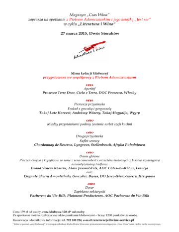 Magazyn „Czas Wina” zaprasza na spotkanie z Piotrem Adamczewskim i jego książką „Jest ser” w cyklu „Literatura i Wino” 27 marca 2015, Dwór Sieraków Menu kolacji klubowej przygotowane we współpracy z Piotrem Adamczewskiem Aperitif Prosecco Terre Deor, Cielo e Terra, DOC Prosecco, Włochy Pierwsza przystawka Fenkuł z gruszką i gorgonzolą Tokaj Late Harvest, Andrássy Winery, Tokaj-Hegyalja, Węgry Między przystawkami podany zostanie sorbet szefa kuchni Druga przystawka Suflet serowy Chardonnay de Reserva, Lyngrove, Stellenbosch, Afryka Południowa Danie główne Pieczeń cielęca z kopytkami w sosie z sera camembert i orzechów laskowych z fasolką szparagową aromatyzowaną truflami Grand Veneur Réserve, Alain Jaume&Fils, AOC Côtes-du-Rhône, Francja oraz Elegante Sherry Amontillado, González Byass, DO Jerez-Xérez-Sherry, Hiszpania Deser Zapiekane nektarynki Pacherenc du Vic-Bilh, Plaimont Producteurs, AOC Pacherenc du Vic-Bilh Cena 159 zł od osoby, cena klubowa 120 zł* od osoby. Za spotkanie można rozliczyć się także punktami klubowymi – licząc 1200 punktów za osobę. Rezerwacja i dodatkowe informacje: tel. 722 100 224, e-mail [email protected] * Rabat w postaci „ceny klubowej” przysługuje członkom Klubu Domu Wina oraz prenumeratorom magazynu „Czas Wina” wraz z jedną osobą towarzyszącą.