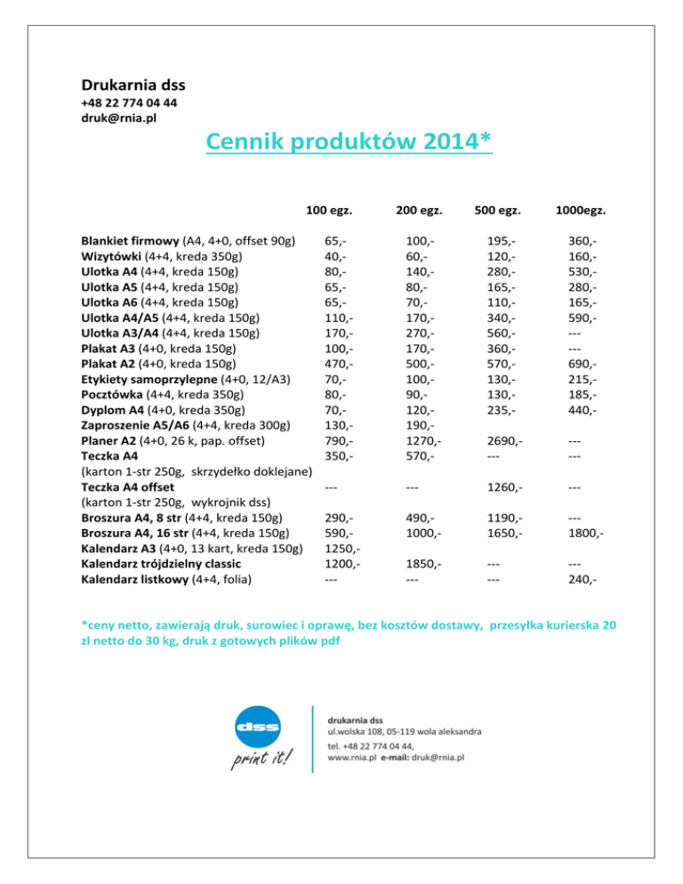 Drukarnia dss +48 22 774 04 44 [email protected] Cennik produktów 2014* 100 egz. 200 egz. 500 egz. 1000egz. Blankiet firmowy (A4, 4+0, offset 90g) 65,‐ 100,‐ 195,‐ 360,‐ Wizytówki (4+4, kreda 350g) 40,‐ 60,‐ 120,‐ 160,‐ Ulotka A4 (4+4, kreda 150g) 80,‐ 140,‐ 280,‐ 530,‐ Ulotka A5 (4+4, kreda 150g) 65,‐ 80,‐ 165,‐ 280,‐ 70,‐ 110,‐ 165,‐ Ulotka A6 (4+4, kreda 150g) 65,‐ Ulotka A4/A5 (4+4, kreda 150g) 110,‐ 170,‐ 340,‐ 590,‐ Ulotka A3/A4 (4+4, kreda 150g) 170,‐ 270,‐ 560,‐ ‐‐‐ Plakat A3 (4+0, kreda 150g) 100,‐ 170,‐ 360,‐ ‐‐‐ Plakat A2 (4+0, kreda 150g) 470,‐ 500,‐ 570,‐ 690,‐ Etykiety samoprzylepne (4+0, 12/A3) 70,‐ 100,‐ 130,‐ 215,‐ Pocztówka (4+4, kreda 350g) 80,‐ 90,‐ 130,‐ 185,‐ Dyplom A4 (4+0, kreda 350g) 70,‐ 120,‐ 235,‐ 440,‐ Zaproszenie A5/A6 (4+4, kreda 300g) 130,‐ 190,‐ Planer A2 (4+0, 26 k, pap. offset) 790,‐ 1270,‐ 2690,‐ ‐‐‐ Teczka A4 350,‐ 570,‐ ‐‐‐ ‐‐‐ (karton 1‐str 250g, skrzydełko doklejane) Teczka A4 offset ‐‐‐ ‐‐‐ 1260,‐ ‐‐‐ (karton 1‐str 250g, wykrojnik dss) Broszura A4, 8 str (4+4, kreda 150g) 290,‐ 490,‐ 1190,‐ ‐‐‐ Broszura A4, 16 str (4+4, kreda 150g) 590,‐ 1000,‐ 1650,‐ 1800,‐ Kalendarz A3 (4+0, 13 kart, kreda 150g) 1250,‐ Kalendarz trójdzielny classic 1200,‐ 1850,‐ ‐‐‐ ‐‐‐ Kalendarz listkowy (4+4, folia) ‐‐‐ ‐‐‐ ‐‐‐ 240,‐ *ceny netto, zawierają druk, surowiec i oprawę, bez kosztów dostawy, przesyłka kurierska 20 zl netto do 30 kg, druk z gotowych plików pdf Cennik druk cyfrowy kolor arkusze plano* nakład/ gramatura 1‐10 11‐25 26‐50 51‐75 76‐100 101‐125 126‐150 151‐175 176‐200 201‐225 226‐250 251‐275 276‐300 301‐325 326‐350 351‐375 376‐400 401‐425 426‐450 451‐475 476‐500 4+0 / 90‐ 170g 40 50 60 80 100 115 135 150 170 180 195 205 220 235 250 265 280 300 320 340 360 4+4/ 90‐ 170g 50 65 80 110 140 165 190 215 240 260 280 300 320 345 370 395 420 440 460 495 530 4+0/ 200‐ 300g 40 55 70 95 120 140 160 180 200 215 235 250 270 290 315 270 360 375 390 415 440 4+4/ 200‐ 300g 60 80 100 130 160 185 215 240 270 295 320 345 370 400 430 460 490 515 540 575 610 Bigowanie do 500 egz. + 30 zł Folia minimalka + 120 zł Sztancowanie minimum + 150 zł + koszt wykrojnika Uv wybiórczy minimalka + 300 zł Zmiana gramatury papieru na 350g + 15% *ceny netto, zawierają druk i surowiec, arkusze plano bez kosztów dostawy, przesyłka kurierska 20 zl netto do 30 kg, druk z gotowych plików pdf
