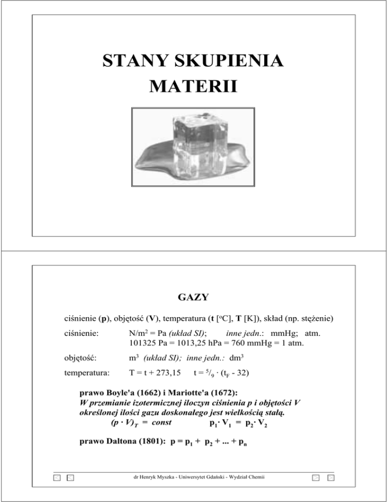STANY SKUPIENIA MATERII GAZY ciśnienie (p), objętość (V), temperatura (t [oC], T [K]), skład (np. stężenie) ciśnienie: N/m2 = Pa (układ SI); inne jedn.: mmHg; atm. 101325 Pa = 1013,25 hPa = 760 mmHg = 1 atm. objętość: m3 (układ SI); inne jedn.: dm3 temperatura: T = t + 273,15 t = 5/9 · (tF - 32) prawo Boyle'a (1662) i Mariotte'a (1672): W przemianie izotermicznej iloczyn ciśnienia p i objętości V określonej ilości gazu doskonałego jest wielkością stałą. p1· V1 = p2· V2 (p · V)T = const prawo Daltona (1801): p = p1 + p2 + ... + pn dr Henryk Myszka - Uniwersytet Gdański - Wydział Chemii równanie stanu gazu doskonałego: p ⋅V p ⋅V p⋅V = const lub 1 1 = 2 2 T1 T2 T równanie Clapeyrona: dla 1 mola gazu: p ⋅ V po ⋅ Vo 101325 N/m2 ⋅ 0,022415 m 3 /mol = = = 8,31 J/mol ⋅ K = R T To 273,15 K dla n moli gazu: p·V =n·R·T uwzględniając prawa Daltona, Avogadra i Clapeyrona można wykazać, że: ni V ⋅ p = i ⋅ p = xi ⋅ p nc Vc xi - ułamek molowy pi = dyfuzja − samorzutne rozprzestrzenianie się cząstek substancji przez daną fazę (stałą, ciekłą lub gazową) dr Henryk Myszka - Uniwersytet Gdański - Wydział Chemii M Vo m n ⋅ Mx Mx = gęstość względna gazu Dwz: Dwz = x = m wz n ⋅ M wz M wz M gęstość względem wodoru: DH 2 = x 2 M gęstość względem powietrza: Dpow. = x 29 3 średnia energia kinetyczna cząsteczki gazu: Ek = ⋅ k ⋅ T 2 k - stała Boltzmana, k = R = 1,38 · 10-23 J/K NA Średnie prędkości cząsteczek popularnych gazów w temperaturze 25oC gęstość gazu: d = m V lub d= Gaz H2 prędkość (m/s) 1921 Gaz N2 prędkość (m/s) 515 He CH4 1363 681 O2 CO2 482 412 dr Henryk Myszka - Uniwersytet Gdański - Wydział Chemii CIECZE 1/ właściwości cieczy • są praktycznie nieściśliwe, • brak określonego kształtu (kształt naczynia), • dyfundują powoli, • parują z otwartych zbiorników; 2/ gęstość cieczy - zależy od temperatury, gdyż zmiany m d= temperatury powodują zmiany V objętości cieczy; 3/ ciśnienie pary nasyconej - ciśnienie wywierane przez parę znajdu(prężność pary nasyconej) jacą się w stanie równowagi z cieczą; 4/ temperatura wrzenia - temperatura, w której prężność pary cieczy jest równa ciśnieniu zewnętrznemu; dr Henryk Myszka - Uniwersytet Gdański - Wydział Chemii zmianę prężności pary nasyconej nad cieczą od temperatury ujmuje równanie Clausiusa-Clapeyrona: log p2 ΔH ⎛ 1 1 ⎞ ⎜ − ⎟ =− p1 2,303 ⋅ R ⎜⎝ T2 T1 ⎟⎠ Ciśnienie (mmHg) 3000 2711 2500 2000 1489 1500 1000 355,1 500 4,58 17,55 0 0 20 55,32 40 148,1 60 80 760 100 120 140 o Temperatura ( C) Zależność temperatury wrzenia wody od ciśnienia dr Henryk Myszka - Uniwersytet Gdański - Wydział Chemii 5/ napięcie powierzchniowe - naturalna skłonność powierzchni cieczy do kurczenia się, spowodowana siłami wciągającymi cząsteczki powierzchniowe do wnętrza fazy; Napięcie powierzchniowe cieczy jest to praca potrzebna do zmiany powierzchni cieczy o 1 m2. Napięcie powierzchniowe (γ) wybranych cieczy Ciecz γ · 10−3 [J/m2] Etanol 22,0 CCl4 26,2 Benzen 28,2 Gliceryna 62,5 Woda 71,98 Rtęć 473,5 dr Henryk Myszka - Uniwersytet Gdański - Wydział Chemii siły kapilarne - siły powodujące wznoszenie się cieczy w wąskich rurkach (tzw. kapilarach); siły adhezji - siły wiążące substancję z powierzchnią; siły kohezji - siły wiążące ze sobą cząsteczki substancji z utworzeniem zwartego materiału; menisk cieczy - zakrzywiona powierzchnia utworzona przez ciecz w wąskiej rurce; Gdy siły adhezji między cieczą a szkłem są większe od sił kohezji w cieczy, ciecz tworzy menisk wklęsły (woda). Gdy siły kohezji są większe od sił adhezji, menisk jest wypukły (rtęć) Jaki menisk tworzy woda w rurce z tworzywa sztucznego ? woda rtęć dr Henryk Myszka - Uniwersytet Gdański - Wydział Chemii 6/ lepkość - właściwość cieczy charakteryzująca jej opór wobec płynięcia; „tarcie wewnętrzne”; przepływ płynu: laminarny - warstwy przesuwają się równolegle względem siebie; burzliwy - cząsteczki mieszają się podczas ruchu; Lepkość (η) wybranych cieczy Ciecz η · 10−3 [Pa · s] Gliceryna 945 Rtęć 1,52 Etanol 1,08 CCl4 0,90 Woda 0,89 Toluen 0,55 Aceton 0,30 Im większa jest lepkość cieczy, tym wolniejszy jest jej przepływ. Lepkość zwykle maleje ze wzrostem temperatury. dr Henryk Myszka - Uniwersytet Gdański - Wydział Chemii 7/ wiązanie wodorowe - oddziaływanie między kowalencyjnie związanym atomem wodoru i należącym najczęściej do innej cząstki atomem silnie elektroujemnym, dysponującym wolną parą elektronową; ta forma wiązania występuje pomiędzy cząsteczkami tego samego rodzaju (wiązanie wodorowe międzycząsteczkowe) lub wewnątrz tej samej cząsteczki (wiązanie wodorowe wewnątrzcząsteczkowe) X ... H – Y atomy X i Y to najczęściej: N, O, F, Cl energia wiązania: siły van der Waalsa 2 – 30 kJ/mol wiązanie wodorowe wiązanie atomowe i jonowe 10 – 40 kJ/mol powyżej 100 kJ/mol (oddziaływania międzycząsteczkowe, np. dipol-dipol) długość mostka wodorowego: X ... H – Y dr Henryk Myszka - Uniwersytet Gdański - Wydział Chemii 2,5 – 3,2 Å występowanie (m.in.): woda (trzy stany skupienia), NH3, HF, alkohole, aminy, amidy, kwasy nieorganiczne i organiczne, biopolimery Lód Struktura lodu H O ...H O ... H O .. .H O ... H H. H. H. .. . . . . . .. H O ...H O ... H O .. .H O ... H .. . H. .. H CH3 O ...H N H H. .. . .. H O ...H O ...H H. .. H. .. H .. . N H. .. CH3 H. .. metyloamina w wodzie woda dr Henryk Myszka - Uniwersytet Gdański - Wydział Chemii O CH3 C O . .. H O O H . . .O C CH3 H... O N O O H... O C OH kwas octowy (dimer) o-nitrofenol wpływ wiązania wodorowego na właściwości fizyczne: • wzrost temperatury wrzenia i topnienia • wzrost lepkości • wzrost momentu dipolowego cząsteczki • wzrost entalpii i entropii parowania • wzrost przenikalności elektrycznej dr Henryk Myszka - Uniw