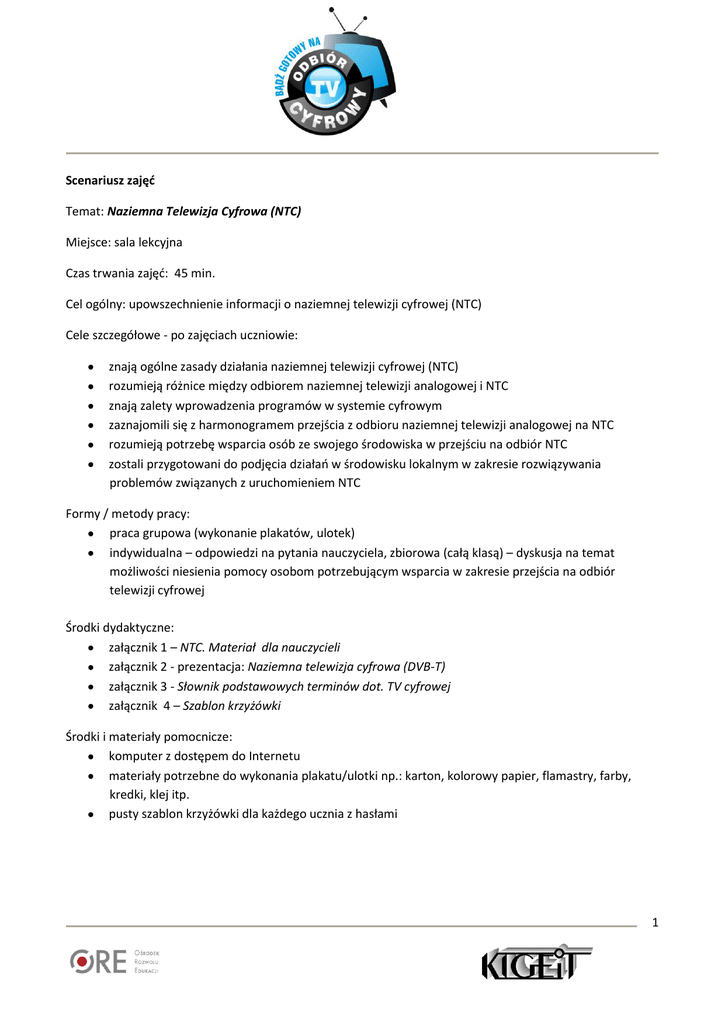 Scenariusz zajęć Temat: Naziemna Telewizja Cyfrowa (NTC) Miejsce: sala lekcyjna Czas trwania zajęd: 45 min. Cel ogólny: upowszechnienie informacji o naziemnej telewizji cyfrowej (NTC) Cele szczegółowe - po zajęciach uczniowie: znają ogólne zasady działania naziemnej telewizji cyfrowej (NTC) rozumieją różnice między odbiorem naziemnej telewizji analogowej i NTC znają zalety wprowadzenia programów w systemie cyfrowym zaznajomili się z harmonogramem przejścia z odbioru naziemnej telewizji analogowej na NTC rozumieją potrzebę wsparcia osób ze swojego środowiska w przejściu na odbiór NTC zostali przygotowani do podjęcia działao w środowisku lokalnym w zakresie rozwiązywania problemów związanych z uruchomieniem NTC Formy / metody pracy: praca grupowa (wykonanie plakatów, ulotek) indywidualna – odpowiedzi na pytania nauczyciela, zbiorowa (całą klasą) – dyskusja na temat możliwości niesienia pomocy osobom potrzebującym wsparcia w zakresie przejścia na odbiór telewizji cyfrowej Środki dydaktyczne: załącznik 1 – NTC. Materiał dla nauczycieli załącznik 2 - prezentacja: Naziemna telewizja cyfrowa (DVB-T) załącznik 3 - Słownik podstawowych terminów dot. TV cyfrowej załącznik 4 – Szablon krzyżówki Środki i materiały pomocnicze: komputer z dostępem do Internetu materiały potrzebne do wykonania plakatu/ulotki np.: karton, kolorowy papier, flamastry, farby, kredki, klej itp. pusty szablon krzyżówki dla każdego ucznia z hasłami 1 Tok lekcji: 1. Nauczyciel (na podstawie załącznika 1 - NTC. Materiał dla nauczycieli) -przedstawia uczniom temat zajęd, nawiązując do dwóch wątków: a. Rok 2012 – Rok Solidarności Międzypokoleniowej; b. zbliżający się czas przejścia z odbioru naziemnej telewizji analogowej na odbiór naziemnej telewizji cyfrowej. 2. Nauczyciel omawiając temat wykorzystuje prezentację Naziemna telewizja cyfrowa (DVB-T) (załącznik 2). W wyjaśnieniu pojęd związanych z NTC pomocny będzie słownik podstawowych terminów dot. TV cyfrowej (załącznik 3). 3. Uczniowie na podstawie przekazanych przez nauczyciela informacji ilustrowanych prezentacją odpowiadają na pytania: dlaczego należy przejśd na odbiór naziemnej telewizji cyfrowej? kto nie straci odbioru programów telewizyjnych wraz z wyłączeniem naziemnej telewizji analogowej? kiedy nastąpi wyłączenie naziemnej telewizji analogowej w ich miejscowości? (wykorzystując mapę dostępną pod adresem http://cyfryzacja.gov.pl/Mapa,zasiegu,30.html) jakie programy są dostępne w NTC? jakie działania trzeba podjąd w celu uzyskania dostępu do naziemnej telewizji cyfrowej? jakie są koszty naziemnej telewizji cyfrowej? 4. Nauczyciel w trakcie omawiania tematu zwraca uwagę uczniów na: a. koniecznośd wymiany sprzętu do odbioru telewizji cyfrowej: właściwy dobór anteny i jej odpowiednie ustawienie, telewizor, dekoder, b. obowiązki sprzedawcy w zakresie doboru właściwego sprzętu, c. możliwośd bieżącej oceny przydatności aktualnie posiadanego sprzętu poprzez ocenę jakości odbioru TVP2, a zwłaszcza teletekstu - strona 791. 5. Nauczyciel proponuje uczniom wykonanie plakatu/ulotki, gdzie znajdą się podstawowe informacje o wprowadzeniu telewizji cyfrowej w ich miejscowości. Prace zostaną wyeksponowane w szkole i zaniesione do sąsiadów, dziadków czy innych osób, które z różnych przyczyn mogą potrzebowad wsparcia w sytuacji przejścia na odbiór naziemnej telewizji cyfrowej. 6. Uczniowie prezentują wykonane plakaty, a nauczyciel podsumowuje krótko lekcję i w dyskusji z uczniami zwraca uwagę, że nabytymi wiadomościami powinni podzielid się z osobami, które potrzebują pomocy w zakresie przejścia na odbiór naziemnej telewizji cyfrowej. 7. Praca domowa: Rozwiąż krzyżówkę z hasłem (załącznik 4). 2 KRZYŻÓWKA 1. 2. 3. 4. 5. 6. 7. 1) W Y Ł C T E L E W Ą Y W A I C F I N Z O Z R A T O D E K O D E R B N A W O N I I N A M A O E A R O Ś N I C I K Ł ………………………….. telewizyjny – urządzenie techniczne dostosowane do odbioru programu i przekazów z nim związanych 2) 7 listopada nastąpi pierwsze ………………………………………. naziemnej telewizji analogowej 3) Dzięki technice cyfrowej można w nim zmieścid nie jeden ale kilka programów TV 4) Naziemna telewizja ………….umożliwia odbiór większej liczby programów niż naziemna telewizja analogowa 5) Program informacyjny TVP1, nadawany codziennie o godz. 19.30 6) Pokojowa lub zaokienna - odbiera fale radiowe 7) Np.: kineskopowy lub plazmowy 3
