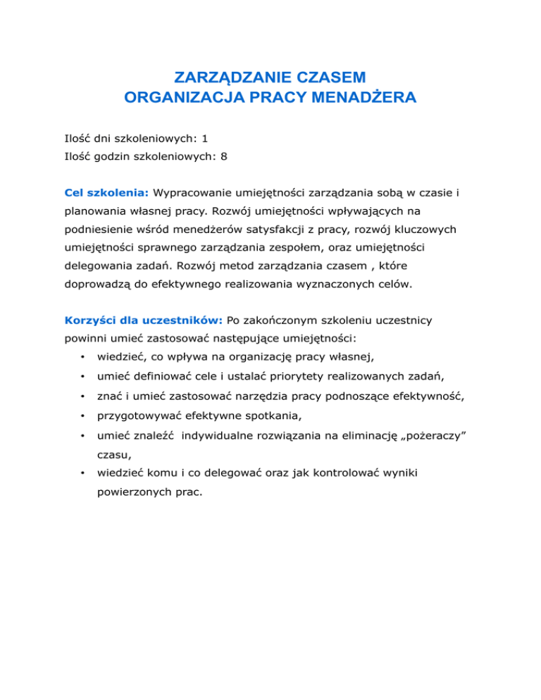 ZARZĄDZANIE CZASEM ORGANIZACJA PRACY MENADŻERA Ilość dni szkoleniowych: 1 Ilość godzin szkoleniowych: 8 Cel szkolenia: Wypracowanie umiejętności zarządzania sobą w czasie i planowania własnej pracy. Rozwój umiejętności wpływających na podniesienie wśród menedżerów satysfakcji z pracy, rozwój kluczowych umiejętności sprawnego zarządzania zespołem, oraz umiejętności delegowania zadań. Rozwój metod zarządzania czasem , które doprowadzą do efektywnego realizowania wyznaczonych celów. Korzyści dla uczestników: Po zakończonym szkoleniu uczestnicy powinni umieć zastosować następujące umiejętności: • wiedzieć, co wpływa na organizację pracy własnej, • umieć definiować cele i ustalać priorytety realizowanych zadań, • znać i umieć zastosować narzędzia pracy podnoszące efektywność, • przygotowywać efektywne spotkania, • umieć znaleźć indywidualne rozwiązania na eliminację „pożeraczy” czasu, • wiedzieć komu i co delegować oraz jak kontrolować wyniki powierzonych prac. RAMOWY PLAN SZKOLENIA 1 DZIEŃ (8 GODZIN) 1. Poznajemy się, oczekiwania słuchaczy w odniesieniu do szkolenia 2. Kontrakt między prowadzącym szkolenie a uczestnikami (zapisanie zasad panujących na szkoleniu) I. KRÓTKA ANALIZA GOSPODAROWANIA CZASEM PRACY a) Jak gospodarujemy czasem w pracy? b) Identyfikacja „pożeraczy czasu” w poszczególnych działach c) Wyznaczanie zasad czynnego podejścia do wykonywanych zadań II. WYZNACZANIE CELÓW - czy to konieczne? a) Jak skutecznie formułować cele ? ( zasada SMART) b) O naturze zasad c) Planowanie dnia d) Czy twoje biuro pomaga efektywnie wykorzystać czas? e) Bez kawy Bez papierosa Bez sensu…- czy w pracy nie ma szans na krótką przerwę? III. SZTUKA DELEGOWANIA ZADAŃ a) Na czym polega trudność delegowania? b) Sprawy, które można oddelegować c) Czego nie można oddelegować ? d) Sposoby rozwijania umiejętności zlecania zadań IV. 10 KROKÓW KU LEPSZEJ ORGANIZACJI CZASU a) Zawodowa Lista Spraw Niedokończonych b) Naturalny model planowania c) Lista planowanych projektów d) Czwartek- najważniejszy dzień tygodnia PODSUMOWANIE SZKOLENIA WNIOSKI, ZAKOŃCZENIE.
