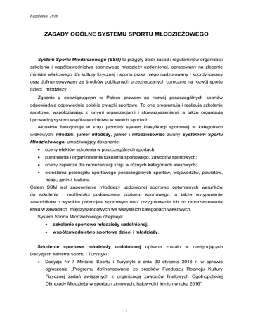 Regulamin 2016 ZASADY OGÓLNE SYSTEMU SPORTU MŁODZIEŻOWEGO System Sportu Młodzieżowego (SSM) to przyjęty zbiór zasad i regulaminów organizacji szkolenia i współzawodnictwa sportowego młodzieży uzdolnionej, opracowany na zlecenie ministra właściwego d/s kultury fizycznej i sportu przez niego nadzorowany i koordynowany oraz dofinansowywany ze środków publicznych przeznaczanych corocznie na rozwój sportu dzieci i młodzieży. Zgodnie z obowiązującym w Polsce prawem za rozwój poszczególnych sportów odpowiadają odpowiednie polskie związki sportowe. To one programują i realizują szkolenie sportowe, współdziałając z innymi organizacjami i stowarzyszeniami, a także organizują i prowadzą system współzawodnictwa w swoich sportach. Aktualnie funkcjonuje w kraju jednolity system klasyfikacji sportowej w kategoriach wiekowych: młodzik, junior młodszy, junior i młodzieżowiec zwany Systemem Sportu Młodzieżowego, umożliwiający dokonanie: oceny efektów szkolenia w poszczególnych sportach; planowania i organizowania szkolenia sportowego, zawodów sportowych; oceny zaplecza dla reprezentacji kraju w różnych kategoriach wiekowych; określenia potencjału sportowego poszczególnych sportów, województw, powiatów, miast, gmin i klubów. Celem SSM jest zapewnienie młodzieży uzdolnionej sportowo optymalnych warunków do szkolenia i możliwości podnoszenia poziomu sportowego, a także wytypowanie zawodników o wysokim potencjale sportowym oraz przygotowanie ich do reprezentowania kraju w zawodach międzynarodowych we wszystkich kategoriach wiekowych. System Sportu Młodzieżowego obejmuje: szkolenie sportowe młodzieży uzdolnionej; współzawodnictwo sportowe dzieci i młodzieży. Szkolenie sportowe młodzieży uzdolnionej opisane zostało w następujących Decyzjach Ministra Sportu i Turystyki : Decyzja Nr 7 Ministra Sportu i Turystyki z dnia 20 stycznia 2016 r. w sprawie ogłoszenia „Programu dofinansowania ze środków Funduszu Rozwoju Kultury Fizycznej zadań związanych z organizacją zawodów finałowych Ogólnopolskiej Olimpiady Młodzieży w sportach zimowych, halowych i letnich w roku 2016” 1 Regulamin 2016 Decyzja Nr 8 Ministra Sportu i Turystyki z dnia 20 stycznia 2016 r. w sprawie ogłoszenia „Programu dofinansowania ze środków Funduszu Rozwoju Kultury Fizycznej w roku 2016 zadań z obszaru wspierania szkolenia sportowego i współzawodnictwa młodzieży związanych ze szkoleniem zawodników w młodzieżowych kategoriach wiekowych oraz ze współzawodnictwem młodzieży poprzez udział w zawodach międzynarodowych w sportach olimpijskich” Decyzja Nr 9 Ministra Sportu i Turystyki z dnia 26 stycznia 2016 r. w sprawie ogłoszenia „Programu dofinansowania ze środków Funduszu Rozwoju Kultury Fizycznej w roku 2016 zadania z obszaru wspierania szkolenia sportowego i współzawodnictwa młodzieży związanego ze szkoleniem i współzawodnictwem zawodników kadry wojewódzkiej młodzików i juniorów młodszych” Szkolenie kadr wojewódzkich młodzika i juniora młodszego /KW/ realizują wojewódzkie interdyscyplinarne stowarzyszenia sportowe /WISS/, a szkolenie w pozostałych kategoriach wiekowych polskie związki sportowe /pzs/ lub ogólnokrajowe stowarzyszenia i związki stowarzyszeń prowadzące działalność w zakresie sportu wyczynowego. Szkolenie sportowe w kategoriach młodzieżowych, podporządkowane jest celom perspektywicznym, ukierunkowane na identyfikację utalentowanych zawodników, którzy w trakcie zaplanowanego wieloletniego procesu szkolenia rozwijać będą swoje indywidualne predyspozycje, tak by poprzez kolejne etapy treningu walczyć o czołowe lokaty na najważniejszych międzynarodowych zawodach mistrzowskich w kategorii seniorów. Współzawodnictwo sportowe dzieci i młodzieży obejmuje krajowe zawody mistrzowskie w następujących kategoriach wiekowych: młodzika, Juniora młodszego, Juniora, Młodzieżowca. Współzawodnictwo młodzieży uzdolnionej zostało ujęte w system punktacji. Zawody SSM przeprowadzone są zgodnie z regulaminami opracowanymi przez pzs i Zespół Sportu Młodzieżowego oraz zatwierdzonymi przez Departament Sportu Wyczynowego Ministerstwa Sportu i Turystyki 2
