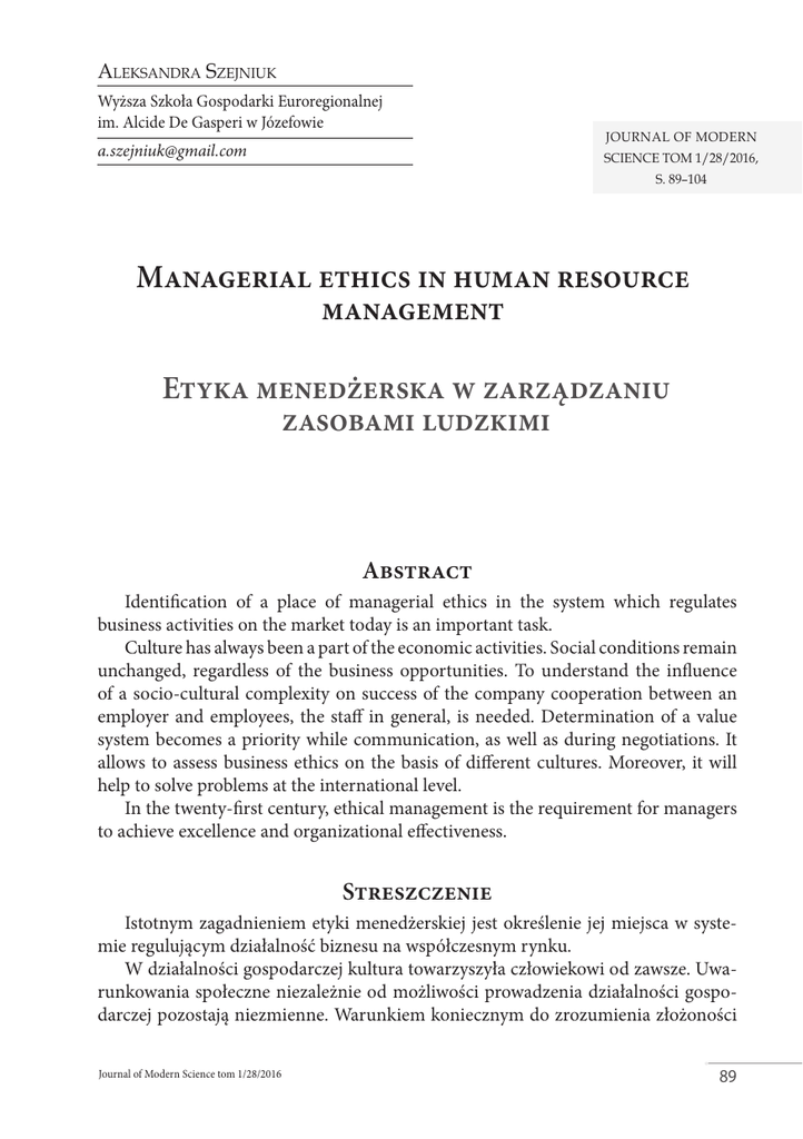 Aleksandra Szejniuk Wyższa Szkoła Gospodarki Euroregionalnej im. Alcide De Gasperi w Józefowie [email protected] Journal of Modern Science tom 1/28/2016, s. 89–104 Managerial ethics in human resource management Etyka menedżerska w zarządzaniu zasobami ludzkimi Abstract Identification of a place of managerial ethics in the system which regulates business activities on the market today is an important task. Culture has always been a part of the economic activities. Social conditions remain unchanged, regardless of the business opportunities. To understand the influence of a socio-cultural complexity on success of the company cooperation between an employer and employees, the staff in general, is needed. Determination of a value system becomes a priority while communication, as well as during negotiations. It allows to assess business ethics on the basis of different cultures. Moreover, it will help to solve problems at the international level. In the twenty-first century, ethical management is the requirement for managers to achieve excellence and organizational effectiveness. Streszczenie Istotnym zagadnieniem etyki menedżerskiej jest określenie jej miejsca w systemie regulującym działalność biznesu na współczesnym rynku. W działalności gospodarczej kultura towarzyszyła człowiekowi od zawsze. Uwarunkowania społeczne niezależnie od możliwości prowadzenia działalności gospodarczej pozostają niezmienne. Warunkiem koniecznym do zrozumienia złożoności Journal of Modern Science tom 1/28/2016 89 Aleksandra Szejniuk społeczno-kulturowej dla osiągnięcia sukcesu firmy jest konieczność współpracy pomiędzy pracodawcą i pracownikami, a także zespołami ludzkimi. Określenie systemu wartości staje się priorytetem podczas komunikowania się, a także w trakcie negocjacji. Pozwala na ocenę etyki biznesu na podstawie różnych kultur, a ponadto przyczyni się do rozwiązywania problemów w skali międzynarodowej. W XXI w. zarządzanie etyczne jest wymogiem stawianym menedżerom dla osiągnięcia doskonałości i efektywności organizacji. Keywords: ethics, culture, international business, managerial ethics, ethical management Słowa kluczowe: etyka, kultura, międzynarodowy biznes, etyka menedżera, zarządzanie etyczne Wprowadzenie Etyka biznesu to dziedzina rozważań zarówno ekonomistów, jak i filozofów. Jest racjonalnym uzasadnieniem wartości i norm obowiązujących każdego człowieka. Ma fundamentalne znacznie dla działania oraz egzystencji ludzkości. Określa stan człowieka, a jej celem jest pomyślność osoby ludzkiej. Tworzenie etyki zawodowej wymaga współpracy zarówno filozofii, jak i reprezentantów danego zawodu. Konieczne jest bowiem określenie wartości i norm moralnych, a także struktury i mechanizmów działania w danym zawodzie. Aktywność człowieka zarówno w sferze prywatnej, jak i publicznej jest uzupełnieniem bezkonfliktowego wpisania się w porządek społeczny, który tworzą systemy normatywne wszystkich aspektów naszego życia, takich jak prawo, moralność i zwyczaje społeczeństwa. Rosnąca rola gospodarki, w tym biznesu, ma realny wpływ na każdego człowieka. Mechanizmy rynkowe, a także ekonomia i jej zasady są elementami, które kształtują życie gospodarcze. Jedną z podstawowych koncepcji zarządzania zasobami ludzkimi jest etyka menedżerska traktowana jako najważniejszy element kształtowania systemu organizacji na rynku. Prowadzenie polityki opartej na zasadach ładu korporacyjnego jest rezultatem etyki biznesu. Wyzwania, przed jakimi stają korporacje, dotyczą powiązań działań etycznych z oczekiwaniami różnorodnych kulturowo kontrahentów. 90 Journal of Modern Science tom 1/28/2016 Etyka menedżerska w zarządzaniu zasobami ludzkimi Funkcje zarządzania – etyczny poziom zarządzających Obecnie przedsiębiorstwa, które chcą funkcjonować i odnosić sukcesy na konkurencyjnym rynku, muszą wykorzystywać najlepszych menedżerów. Ich wiedza z zakresu zarządzania zasobami ludzkimi jest fundamentem rozwoju organizacji. Na poziom etyczny zarządzających wpływa (Kietliński, Reyes, Oleksyn, 2005, s. 166): treść roli organizacyjnej kierownika, wyznaczone cele, sposób osiągania celów, intencje zarządzającego. Bezkrytyczne przyjmowanie roli kierowniczej może być również nieetyczne. Dlatego konieczna jest analiza, jaką postawę ma przyjąć menedżer dla osiągania celów zarządzania organizacją. Jedną z funkcji zarządzania jest planowanie, którego podstawowym zadaniem jest wyznaczenie misji organizacji. Określenie celów i zadań, a także ustalenie programów i ich optymalizowanie. Kolejną istotną funkcją jest organizowanie poprzez kształtowanie procesów, struktur oraz systemów. Ponadto organizowanie zasobów materialnych i niematerialnych. Tworzenie zespołów oraz kształtowanie relacji i współpracy pomiędzy nimi. Ważną funkcją zarządzania jest kierowanie ludźmi polegające na przewodzeniu, inspirowaniu i motywowaniu, a także kształtowaniu etyki i morale wszystkich pracowników organizacji. Ostatnią ważną funkcją zarządzania jest kontrolowanie, które wymaga określenia obszarów i kryteriów kontroli, a także standardów wykorzystywanych w tej funkcji zarządzania w celu podjęcia najlepszej decyzji. Zadaniem kierowników powinno być odpowiednie realizowanie wszystkich funkcji zarządzania. Dotyczy to nie tylko efektywności i skuteczności, ale przede wszystkim etycznego postępowania. To czy ktoś jest kierownikiem etycznym, można stwierdzić jedynie, obserwując jego działania, to, jak wypełnia funkcje kierownicze i jak odgrywa powierzone role organizacyjne. Etyka kierowania nie może bowiem istnieć poza zarządzaniem i związanym z nim działaniem (Kostera, Koźmiński, 2002, s. 192). Kierowanie personelem stanowi nieodłączną część zarządzania zasobami ludzkimi, które charakteryzują następujące cechy (Pocztowski, 2008, s. 178): Journal o