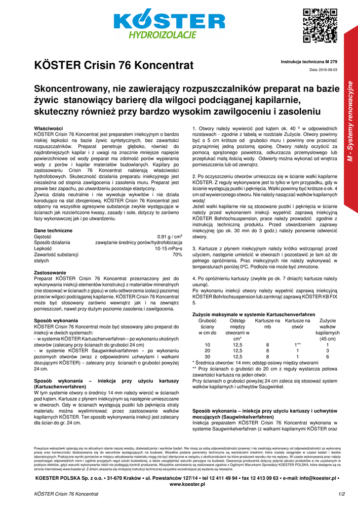 Instrukcja techniczna M 279 Data: 2016-08-03 Skoncentrowany, nie zawierający rozpuszczalników preparat na bazie żywic stanowiący barierę dla wilgoci podciąganej kapilarnie, skuteczny również przy bardzo wysokim zawilgoceniu i zasoleniu Właściwości KÖSTER Crisin 76 Koncentrat jest preparatem iniekcyjnym o bardzo niskiej lepkości na bazie żywic syntetycznych, bez zawartości rozpuszczalników. Preparat penetruje głęboko, również do najdrobniejszych kapilar i z uwagi na znacznie mniejsze napięcie powierzchniowe od wody preparat ma zdolność porów wypierania wody z porów i kapilar materiałów budowlanych. Kapilary po zastosowaniu Crisin 76 Koncentrat nabierają właściwości hydrofobowych. Skuteczność działania preparatu iniekcyjnego jest niezależna od stopnia zawilgocenia i zasolenia muru. Preparat jest prawie bez zapachu, po utwardzeniu pozostaje elastyczny. Żywica działa neutralnie i nie wywołuje wykwitów i nie działa korodująco na stal zbrojeniową. KÖSTER Crisin 76 Koncentrat jest odporny na wszystkie agresywne substancje zwykle występujące w ścianach jak rozcieńczone kwasy, zasady i sole, dotyczy to zarówno fazy wykonawczej jak i po utwardzeniu. Dane techniczne Gęstość Sposób działania Lepkość Zawartość substancji stałych 0.91 g / cm³ zawężanie średnicy porów/hydrofobizacja 10-15 mPa•s 70% Zastosowanie Preparat KÖSTER Crisin 76 Koncentrat przeznaczony jest do wykonywania iniekcji elementów konstrukcji z materiałów mineralnych (nie stosować w ścianach z gipsu) w celu odtworzenia izolacji poziomej przeciw wilgoci podciąganej kapilarnie. KÖSTER Crisin 76 Koncentrat może być stosowany zarówno wewnątrz jak i na zewnątrz pomieszczeń, nawet przy dużym poziomie zasolenia i zawilgocenia. Sposób wykonania KÖSTER Crisin 76 Koncentrat może być stosowany jako preparat do iniekcji w dwóch systemach: - w systemie KÖSTER Kartuschenverfahren – po wykonaniu ukośnych otworów (zalecany przy ścianach do grubości 24 cm) - w systemie KÖSTER Saugwinkelvarfahnren – po wykonaniu poziomych otworów (wraz z odpowiednimi uchwytami i wałkami dozującymi KÖSTER) – zalecany przy ścianach o grubości powyżej 24 cm. Sposób wykonania – iniekcja przy użyciu kartuszy (Kartuschenverfahren) W tym systemie otwory o średnicy 14 mm należy wiercić w ścianach pod kątem. Kartusze z płynem iniekcyjnym są następnie umieszczane w otworach. Gdy w ścianach występują pustki lub pęknięcia straty materiału można wyeliminować przez zastosowanie wałków kapilarnych KÖSTER. Ten sposób wykonywania iniekcji jest zalecany dla ścian do gr. 24 cm. 1. Otwory należy wywiercić pod kątem ok. 40 º w odpowiednich rozstawach - zgodnie z tabelą w rozdziale Zużycie. Otwory powinny być o 5 cm krótsze od grubości muru i powinny one przecinać przynajmniej jedną poziomą spoinę. Otwory należy oczyścić za pomocą sprężonego powietrza, odkurzacza przemysłowego lub przepłukać małą ilością wody. Odwierty można wykonać od wnętrza pomieszczenia lub od zewnątrz. 2. Po oczyszczeniu otworów umieszcza się w ścianie wałki kapilarne KÖSTER. Z reguły wykonywane jest to tylko w tym przypadku, gdy w ścianie występują pustki i pęknięcia. Wałki powinny być krótsze o ok. 4 cm od wywierconego otworu. Nie należy nasączać wałków kapilarnych wodą! Jeżeli wałki kapilarne nie są stosowane pustki i pęknięcia w ścianie należy przed wykonaniem iniekcji wypełnić zaprawą iniekcyjną KÖSTER Bohrlochsuspension, prace należy prowadzić zgodnie z instrukcją techniczną produktu. Przed utwardzeniem zaprawy iniekcyjnej (po ok. 30 min do 3 godz.) należy ponownie odwiercić otwory. 3. Kartusze z płynem iniekcyjnym należy krótko wstrząsnąć przed użyciem, następnie umieścić w otworach i pozostawić je tam aż do pełnego opróżnienia. Prac iniekcyjnych nie należy wykonywać w temperaturach poniżej 0ºC. Podłoże nie może być zmrożone. 4. Po opróżnieniu kartuszy (zwykle po ok. 7 dniach) kartusze należy usunąć. Po wykonaniu iniekcji otwory należy wypełnić zaprawą iniekcyjną KÖSTER Bohrlochsuspension lub zamknąć zaprawą KÖSTER KB FIX 5. Zużycie maksymale w systemie Kartuschenverfahren Grubość Odstęp Kartusze na Kartusze na Zużycie ściany między mb otwór wałków w cm do otworami w kapilarnych cm* (45 cm) 10 12,5 8 1** 1 20 12,5 8 1 3 30 12,5 8 1 6 * Średnica otworów: 14 mm; odstęp osiowy między otworami ** Przy ścianach o grubości do 20 cm z reguły wystarcza połowa zawartości kartusza na jeden otwór. Przy ścianach o grubości powyżej 24 cm zaleca się stosować system wałków kapilarnych i uchwytów Saugwinkel. Sposób wykonania – iniekcja przy użyciu kartuszy i uchwytów mocujących (Saugwinkelverfahren) Iniekcja preparatem KÖSTER Crisin 76 Koncentrat wykonana w systemie Saugwinkelverfahren (z wałkami kapilarnymi KÖSTER oraz Powyższe wskazówki opierają się na aktualnym stanie naszej wiedzy, doświadczenia i wyników badań. Nie niosą za sobą odpowiedzialności prawnej i nie zwalniają wykonawcy od odpowiedzialności za wykonaną pracę oraz konieczności dostosowania się do warunków występujących na budowie. Wszelkie podane parametry techniczne są wartościami średnimi, które zostały osiągnięte w czasie badań i testów laboratoryjnych. Praktyczne wyniki pomiarów w miejscu wbudowania materiału mogą nie być identyczne w związku z okolicznościami na które producent wyrobu nie ma wpływu. W czasie wykonywania prac należy przestrzegać odpowiednich norm i ogólnie przyjętych reguł sztuki budowlanej, a także uwzględniać warunki panujące na budowie. Gwarancja producenta dotyczy jedynie jakości produktów a nie uzyskanych w praktyce efektów, gdyż warunki wykonywania robót nie podlegają kontroli producenta. Wszystkie zamówienia są realizowane zgodnie z Ogólnymi Warunkami Sprzedaży KOESTER POLSKA, które dostępne są na stronie intern