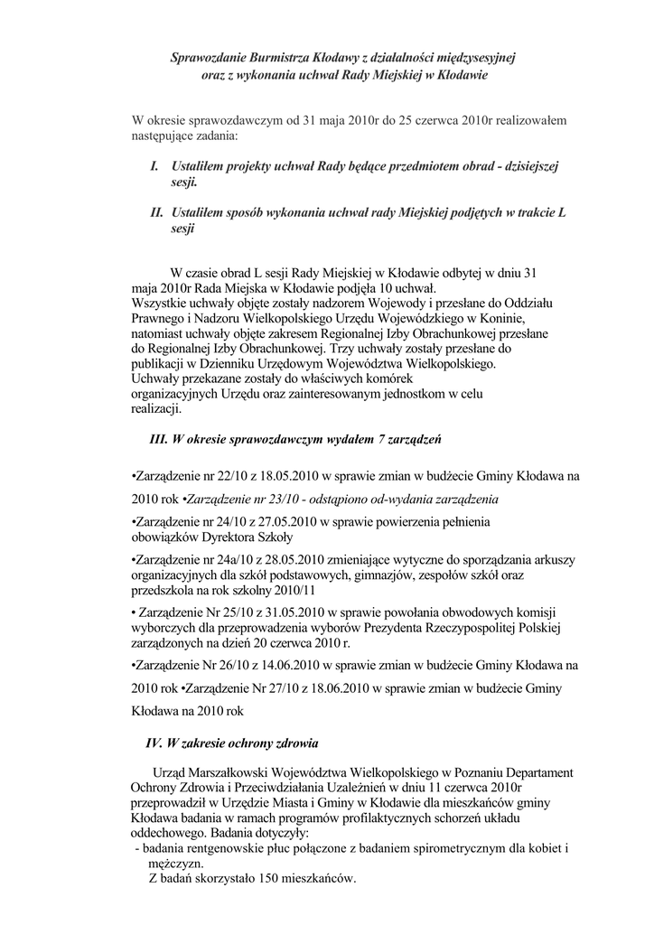 Sprawozdanie Burmistrza Kłodawy z działalności międzysesyjnej oraz z wykonania uchwał Rady Miejskiej w Kłodawie W okresie sprawozdawczym od 31 maja 2010r do 25 czerwca 2010r realizowałem następujące zadania: I. Ustaliłem projekty uchwał Rady będące przedmiotem obrad - dzisiejszej sesji. II. Ustaliłem sposób wykonania uchwał rady Miejskiej podjętych w trakcie L sesji W czasie obrad L sesji Rady Miejskiej w Kłodawie odbytej w dniu 31 maja 2010r Rada Miejska w Kłodawie podjęła 10 uchwał. Wszystkie uchwały objęte zostały nadzorem Wojewody i przesłane do Oddziału Prawnego i Nadzoru Wielkopolskiego Urzędu Wojewódzkiego w Koninie, natomiast uchwały objęte zakresem Regionalnej Izby Obrachunkowej przesłane do Regionalnej Izby Obrachunkowej. Trzy uchwały zostały przesłane do publikacji w Dzienniku Urzędowym Województwa Wielkopolskiego. Uchwały przekazane zostały do właściwych komórek organizacyjnych Urzędu oraz zainteresowanym jednostkom w celu realizacji. III. W okresie sprawozdawczym wydałem 7 zarządzeń •Zarządzenie nr 22/10 z 18.05.2010 w sprawie zmian w budżecie Gminy Kłodawa na 2010 rok •Zarządzenie nr 23/10 - odstąpiono od-wydania zarządzenia •Zarządzenie nr 24/10 z 27.05.2010 w sprawie powierzenia pełnienia obowiązków Dyrektora Szkoły •Zarządzenie nr 24a/10 z 28.05.2010 zmieniające wytyczne do sporządzania arkuszy organizacyjnych dla szkół podstawowych, gimnazjów, zespołów szkół oraz przedszkola na rok szkolny 2010/11 • Zarządzenie Nr 25/10 z 31.05.2010 w sprawie powołania obwodowych komisji wyborczych dla przeprowadzenia wyborów Prezydenta Rzeczypospolitej Polskiej zarządzonych na dzień 20 czerwca 2010 r. •Zarządzenie Nr 26/10 z 14.06.2010 w sprawie zmian w budżecie Gminy Kłodawa na 2010 rok •Zarządzenie Nr 27/10 z 18.06.2010 w sprawie zmian w budżecie Gminy Kłodawa na 2010 rok IV. W zakresie ochrony zdrowia Urząd Marszałkowski Województwa Wielkopolskiego w Poznaniu Departament Ochrony Zdrowia i Przeciwdziałania Uzależnień w dniu 11 czerwca 2010r przeprowadził w Urzędzie Miasta i Gminy w Kłodawie dla mieszkańców gminy Kłodawa badania w ramach programów profilaktycznych schorzeń układu oddechowego. Badania dotyczyły: - badania rentgenowskie płuc połączone z badaniem spirometrycznym dla kobiet i mężczyzn. Z badań skorzystało 150 mieszkańców. V. W zakresie spraw mieszkaniowych Sprawy lokalowe W wykonaniu Uchwały Rady Miejskiej w Kłodawie Nr 94/07 z dnia 20 września 2007.r. zgodnie z Zarządzeniem Burmistrza Kłodawy Nr 3/201 Or z dnia 27 stycznia 2010r. został sprzedany w drodze pierwszego ustnego przetargu nieograniczonego lokal mieszkalny przy ul. J. Grzymskiego 2/29 o pow. 24,79 m2 za cenę 42.687,00 zł + podatek vat stawka zw, wraz z oddaniem we współużytkowanie wieczyste ułamkowej części gruntu , pierwsza opłata za oddanie nieruchomości we współużytkowanie wieczyste wyniosła 258,60 zł + podatek vat stawka zw Burmistrz Kłodawy przy udziale Komisji Mieszkaniowej przydzielił lokal mieszkalny w Kłodawie przy ul. Dąbskiej 30 - rodzinie 3- osobowej . Rodzina była umieszczona na liście osób zakwalifikowanych do wynajmu lokalu mieszkalnego na rok 2010r. Dodatki mieszkaniowe W miesiącu czerwcu 201 Or. wypłacono 200 dodatków na kwotę 25.386,06 zł. VI. W zakresie ochrony środowiska Trwają prace związane z opracowaniem aktualizacji „Programu Ochrony Środowiska dla Miasta i Gminy Kłodawa" wraz z prognozą oddziaływania na środowisko. Powyższe opracowanie wykonuje firma Abrys Sp. z o. o. ul. Daleka 33 60-124 Poznań. W związku z powyższym w miesiącu lipcu bieżącego roku planowane jest przeprowadzenie konsultacji społecznych odnośnie wyżej wymienionych dokumentów. Projekty powyższych opracowań zostaną udostępnione do wglądu w siedzibie Urzędu Miasta i Gminy w Kłodawie ul. Dąbska 17, pokój nr 13 oraz zostaną zamieszczone na stronie Biuletynu Informacji Publicznej Urzędu Miasta i Gminy w Kłodawie pod adresem: www.bip.klodawa.wlkp.pl VII. W zakresie kultury 11, 12 i 13 czerwca odbyło się Kłodawskie Święto Soli w Kłodawie organizowany przez Urząd Miasta i Gminy Kłodawa wraz z Kopalnią Soli „Kłodawa", 11 czerwca 2010r. o godzinie 16.00 odbył się otwarty Turniej Piłki Nożnej z okazji Kłodawskiego Święta Soli na boisku „Moje Boisko Orlik 2012 przy ulicy Cegielnianej w Kłodawie. Również w tym dniu o godzinie 17.00 odbył się „Wieczór z Chopinem" - montaż słowno-muzyczny w Bibliotece Publicznej w Kłodawie. W sobotę 12 czerwca 2010r. o godzinie 10.00 w Urzędzie Miasta i Gminy w Kłodawie odbyła się I sesja Młodzieżowej Rady Gminy Kłodawa w której udział wzięli Radni Młodzieżowej Rady Gminy Kłodawa, Radni Rady Miejskiej w Kłodawie, Radny Powiatu Zdzisław Domański, Dyrektorzy i Kierownicy jednostek budżetowych, Gminna Komisja Wyborcza powołana dla przeprowadzenia wyborów do Młodzieżowej Rady Gminy oraz mieszkańcy Miasta i Gminy Kłodawa. W czasie obrad I sesji Radni Młodzieżowej Rady złożyli ślubowanie oraz dokonali wyboru prezydium Młodzieżowej Rady Gminy. W skład prezydium weszli Wojciech Krzysiek przewodniczący - uczeń Zespołu Szkół Ponadgimnazjalnych w Kłodawie, Julia Kołodziejska wiceprzewodnicząca - uczennica Zespołu Szkół Nr 2 w Kłodawie, Magdalena Pierzgalska sekretarz - uczennica z Zespołu Szkół Ponadgimnazjalnych w Kłodawie. Ponadto powołano 3 komisje: Komisja Oświatowa, Komisja Sportu i Turystyki oraz Komisja Spraw Społecznych. Po obradach sesji młodzi radni przejechali paradnie ulicami miasta autami cabrio z Cabrio Klub Polska. 0 godzinie 10.00 odbył się również Turniej Strzelecko Drużyny „Lok" na strzelnicy w Parku Górnika. Od godziny 14.00 na Stadionie Sportowym w Kłodawie odbył się mecz piłki nożnej pomiędzy Ochotniczą Strażą Pożarną a, Policją wygraną drużna dla Policji. Po meczu Burmistrz Kłodawy Józef Chudy oraz człon