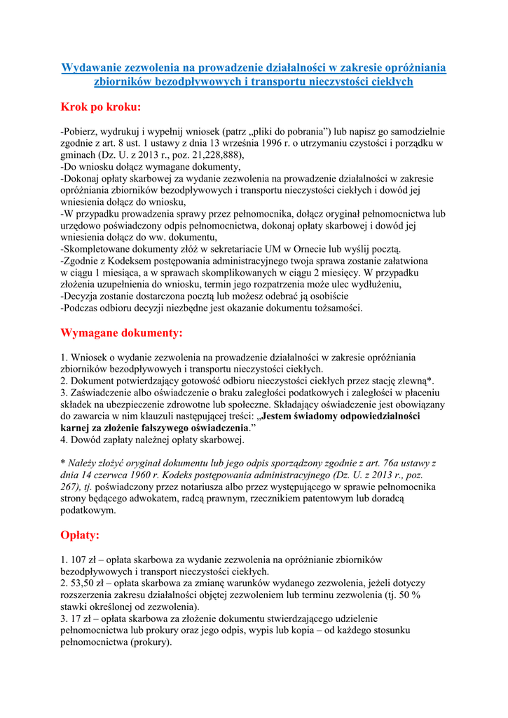 Wydawanie zezwolenia na prowadzenie działalności w zakresie opróżniania zbiorników bezodpływowych i transportu nieczystości ciekłych Krok po kroku: -Pobierz, wydrukuj i wypełnij wniosek (patrz „pliki do pobrania”) lub napisz go samodzielnie zgodnie z art. 8 ust. 1 ustawy z dnia 13 września 1996 r. o utrzymaniu czystości i porządku w gminach (Dz. U. z 2013 r., poz. 21,228,888), -Do wniosku dołącz wymagane dokumenty, -Dokonaj opłaty skarbowej za wydanie zezwolenia na prowadzenie działalności w zakresie opróżniania zbiorników bezodpływowych i transportu nieczystości ciekłych i dowód jej wniesienia dołącz do wniosku, -W przypadku prowadzenia sprawy przez pełnomocnika, dołącz oryginał pełnomocnictwa lub urzędowo poświadczony odpis pełnomocnictwa, dokonaj opłaty skarbowej i dowód jej wniesienia dołącz do ww. dokumentu, -Skompletowane dokumenty złóż w sekretariacie UM w Ornecie lub wyślij pocztą. -Zgodnie z Kodeksem postępowania administracyjnego twoja sprawa zostanie załatwiona w ciągu 1 miesiąca, a w sprawach skomplikowanych w ciągu 2 miesięcy. W przypadku złożenia uzupełnienia do wniosku, termin jego rozpatrzenia może ulec wydłużeniu, -Decyzja zostanie dostarczona pocztą lub możesz odebrać ją osobiście -Podczas odbioru decyzji niezbędne jest okazanie dokumentu tożsamości. Wymagane dokumenty: 1. Wniosek o wydanie zezwolenia na prowadzenie działalności w zakresie opróżniania zbiorników bezodpływowych i transportu nieczystości ciekłych. 2. Dokument potwierdzający gotowość odbioru nieczystości ciekłych przez stację zlewną*. 3. Zaświadczenie albo oświadczenie o braku zaległości podatkowych i zaległości w płaceniu składek na ubezpieczenie zdrowotne lub społeczne. Składający oświadczenie jest obowiązany do zawarcia w nim klauzuli następującej treści: „Jestem świadomy odpowiedzialności karnej za złożenie fałszywego oświadczenia.” 4. Dowód zapłaty należnej opłaty skarbowej. * Należy złożyć oryginał dokumentu lub jego odpis sporządzony zgodnie z art. 76a ustawy z dnia 14 czerwca 1960 r. Kodeks postępowania administracyjnego (Dz. U. z 2013 r., poz. 267), tj. poświadczony przez notariusza albo przez występującego w sprawie pełnomocnika strony będącego adwokatem, radcą prawnym, rzecznikiem patentowym lub doradcą podatkowym. Opłaty: 1. 107 zł – opłata skarbowa za wydanie zezwolenia na opróżnianie zbiorników bezodpływowych i transport nieczystości ciekłych. 2. 53,50 zł – opłata skarbowa za zmianę warunków wydanego zezwolenia, jeżeli dotyczy rozszerzenia zakresu działalności objętej zezwoleniem lub terminu zezwolenia (tj. 50 % stawki określonej od zezwolenia). 3. 17 zł – opłata skarbowa za złożenie dokumentu stwierdzającego udzielenie pełnomocnictwa lub prokury oraz jego odpis, wypis lub kopia – od każdego stosunku pełnomocnictwa (prokury). 4. 24 zł – opłata skarbowa za wydanie duplikatu zezwolenia. 5. Zapłaty opłaty skarbowej można dokonać: -przelewem lub przekazem na rachunek bankowy UM w Ornecie -bezpośrednio w kasie Urzędu, 6. Opłata skarbowa podlega zwrotowi, jeżeli mimo zapłacenia opłaty nie wydano zezwolenia. Zwrot opłaty skarbowej następuje na pisemny wniosek. 7. Zwolnione z opłaty skarbowej są: a. jednostki budżetowe, b. jednostki samorządu terytorialnego, c. organizacje pożytku publicznego, jeżeli składają wniosek o dokonanie czynności urzędowej wyłącznie w związku z nieodpłatną działalnością pożytku publicznego w rozumieniu przepisów o działalności pożytku publicznego i wolontariacie, d. osoby, które składając wniosek o dokonanie czynności urzędowej, albo składając dokument stwierdzający udzielenie pełnomocnictwa lub prokury, albo jego odpis, wypis lub kopię przedstawią zaświadczenie o korzystaniu ze świadczeń pomocy społecznej z powodu ubóstwa. Miejsce złożenia i odbioru: MIEJSCE ZŁOŻENIA WNIOSKU: Urząd Miejski w Ornecie Ul. Plac Wolności 26 11-130 Orneta MIEJSCE ODBIORU: -osobiście w Referacie ochrony środowiska, gospodarki komunalnej i drogownictwa – po uzgodnieniu z pracownikiem prowadzącym sprawę; -za pośrednictwem poczty. MIEJSCE ODBIORU ZEZWOLENIA: -za pośrednictwem poczty; -osobiście w Referacie ochrony środowiska, gospodarki komunalnej i drogownictwa– po uzgodnieniu z pracownikiem prowadzącym sprawę. Termin odpowiedzi: Zgodnie z Kodeksem postępowania administracyjnego: 1. do 1 miesiąca. 2. do 2 miesięcy w sprawach szczególnie skomplikowanych. 3. W przypadku stwierdzenia konieczności uzupełnienia wniosku termin rozpatrzenia wniosku biegnie od dnia wpływu uzupełnionego wniosku (art. 11 ust. 5 ustawy o swobodzie działalności gospodarczej) Tryb odwoławczy: Do Samorządowego Kolegium Odwoławczego za pośrednictwem organu, który wydał decyzję w terminie 14 dni od daty jej otrzymania.