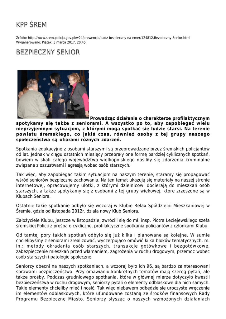 KPP ŚREM Źródło: http://www.srem.policja.gov.pl/w24/prewencja/badz-bezpieczny-na-emer/124812,Bezpieczny-Senior.html Wygenerowano: Piątek, 3 marca 2017, 20:45 BEZPIECZNY SENIOR Prowadząc działania o charakterze profilaktycznym spotykamy się także z seniorami. A wszystko po to, aby zapobiegać wielu nieprzyjemnym sytuacjom, z którymi mogą spotkać się ludzie starsi. Na terenie powiatu śremskiego, co jakiś czas, również osoby z tej grupy naszego społeczeństwa są ofiarami różnych zdarzeń. Spotkania edukacyjne z osobami starszymi są przeprowadzane przez śremskich policjantów od lat. Jednak w ciągu ostatnich miesięcy przebrały one formę bardziej cyklicznych spotkań, bowiem w skali całego województwa wielkopolskiego nasiliły się zdarzenia kryminalne związane z oszustwami i agresją wobec osób starszych. Tak więc, aby zapobiegać takim sytuacjom na naszym terenie, staramy się propagować wśród seniorów bezpieczne zachowania. Na ten temat ukazują się materiały na naszej stronie internetowej, opracowujemy ulotki, z którymi dzielnicowi docierają do mieszkań osób starszych, a także spotykamy się z osobami z tej grupy wiekowej, które zrzeszone są w Klubach Seniora. Ostatnie takie spotkanie odbyło się wczoraj w Klubie Relax Spółdzielni Mieszkaniowej w Śremie, gdzie od listopada 2012r. działa nowy Klub Seniora. Założyciele Klubu, jeszcze w listopadzie, zwrócili się do mł. insp. Piotra Leciejewskiego szefa śremskiej Policji z prośbą o cykliczne, profilaktyczne spotkania policjantów z członkami Klubu. Od tamtej pory takich spotkań odbyło się już kilka i planowane są kolejne. W sumie chcielibyśmy z seniorami zrealizować, wyczerpująco omówić kilka bloków tematycznych, m. in.: metody okradania osób starszych, transakcje gotówkowe i bezgotówkowe, zabezpieczenie mieszkań przed włamaniem, zagrożenia w ruchu drogowym, przemoc wobec osób starszych i patologie społeczne. Seniorzy obecni na naszych spotkaniach, a wczoraj było ich 96, są bardzo zainteresowani sprawami bezpieczeństwa. Przy omawianiu konkretnych tematów mają szereg pytań, ale także prośby. Podczas grudniowego spotkania, które w głównej mierze dotyczyło kwestii bezpieczeństwa w ruchu drogowym, seniorzy pytali o elementy odblaskowe dla nich samych. Takie elementy chcieliby mieć i nosić. Tak więc niebawem odbędzie się uroczyste wręczenie im elementów odblaskowych, które ufundowane zostaną ze środków finansowych Rady Programu Bezpieczne Miasto. Seniorzy słysząc o naszych wzmożonych działaniach prowadzonych na rzecz bezpieczeństwa w ruchu drogowym pytali także, czy mogliby zobaczyć i dowiedzieć się, jak działają nasze urządzenia do pomiaru stanu trzeźwości. Taka prezentacja urządzeń odbyła się wczoraj, a seniorzy przyjęli ją z bardzo dużym zainteresowaniem. Poniżej kilka zdjęć z wczorajszego spotkania. Fot. Elżbieta Kowalak - Klub Relax Spółdzielni Mieszkaniowej w Śremie. Ocena: 0/5 (0) Tweetnij