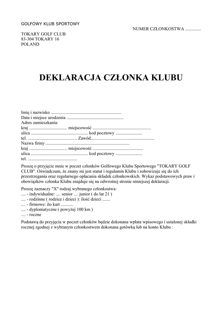 GOLFOWY KLUB SPORTOWY NUMER CZŁONKOSTWA .............. TOKARY GOLF CLUB 83-304 TOKARY 16 POLAND DEKLARACJA CZŁONKA KLUBU Imię i nazwisko ............................................................... Data i miejsce urodzenia ................................................... Adres zamieszkania: kraj .................................. miejscowość .................................................... ulica ................................................... kod pocztowy ........................ tel. ............................................ Zawód......................................................... Nazwa firmy ........................................................................... kraj .................................. miejscowość ............................................. ulica ................................................... kod pocztowy ........................ tel. ............................................ Proszę o przyjęcie mnie w poczet członków Golfowego Klubu Sportowego "TOKARY GOLF CLUB". Oświadczam, że znany mi jest statut i regulamin Klubu i zobowizuje się do ich przestrzegania oraz regularnego opłacania składek członkowskich. Wykaz podstawowych praw i obowiązków członka Klubu znajduje się na odwrotnej stronie niniejszej deklaracji. Proszę zaznaczy "X" rodzaj wybranego członkostwa: .... - indywidualne: .... senior .... junior ( do lat 21 ) .... - rodzinne ( rodzice i dzieci ): ilość dzieci ....... .... - firmowe: ilo kart ........... .... - dyplomatyczne ( powyżej 100 km ) .... - roczne Podstawą do przyjęcia w poczet członków będzie dokonana wpłata wpisowego i ustalonej składki rocznej zgodnej z wybranym członkostwem dokonana gotówką lub na konto Klubu : Bank PEKAO S.A. II O/Gdynia Nr 12 1240 3510 1111 0000 4320 7208 Podpis deklarującego .......................................... Tokary, dnia.....................200.... Imiona i nazwiska członków rekomendujących: 1. ..................................................................... 2. ..................................................................... Adnotacja Prezesa Zarządu Klubu dotycząca przyjęcia czołnkostwa: ......................................................................... podpis Prezesa Klubu .................................. Informuję, iż należę do nastpujących klubów golfowych: ......................................................................... ......................................................................... Moim klubem macierzystym jest: ......................................................................... W przypadku przyjęcia mojej deklaracji wyrażam zgodę na przetwarzanie moich danych osobowych w celach marketingowych i sportowych, dotyczących działalności statutowej Klubu. Podpis ..............................