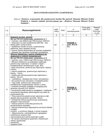 Nr sprawy: RZP-II-WI/35DZP-1/2012 Załącznik Nr 5 do SIWZ ZESTAWIENIE KOSZTÓW ZAMÓWIENIA dotyczy: Dostawa wyposażenia dla pomieszczeń kuchni dla potrzeb Muzeum Historii Żydów Polskich w ramach zadania inwestycyjnego pn.: „Budowa Muzeum Historii Żydów Polskich“. L.p. Wyszczególnienie Jedn. miary 1 2 Segment na tace, sztućce Na rys.TG-210 restauracja, oznaczony nr 1. • wymiary: szer.800mmxgł.700mmxwys.1505mm; • wykonane ze stali nierdzewnej AISI 304 - bez dolnej półki i tylnej ścianki; • dodatkowo wózek na tace z podnoszoną platformą, który wjeżdża od tyłu; • wymiar wózka dostosować do wymiaru podajnika; • dostawa bez obudowy frontowej i prowadnicy; Witryna chłodnicza z wanną chłodniczą do ekspozycji w niskich temperaturach Na rys.TG-210 restauracja, oznaczona nr 2. • wymiary: szer.1320mmxgł.700mmxwys.1600mm; • Witryna chłodnicza na podstawie szafkowej powinna być wykonana w całości z blach i kształtowników nierdzewnych w gat. 304; • płyta wierzchnia powinna być wykonana z blachy 2.0mm; • wanna chłodnicza powinna być wykonana z blachy 1,5mm; • szafka pod witrynę powinna być wykonana z blachy 0,8 mm; • oświetlenie ; dostawa bez frontu i prowadnicy; • dno powinno być zlicowane z krawędzią boku; • nogi szafki powinny być wykonane z kształtownika kwadratowego 40x40 x1,2mm; • prześwit pomiędzy podłogą a krawędzią dna powinien wynosić min.160mm; • konstrukcja szafki powinna uwzględnić możliwość mocowania zabudowy dekoracyjnej oraz półki do przesuwania tac; • Płyta wierzchnia powinna być wykonana w taki sposób aby jej grubość wynosiła 40mm; • Chłodzenie witryny powinno być realizowane obiegiem wymuszonym; • witryna powinna mieć dwa poziomy do prezentowania wyrobów; • witryna powinna być wyposażona od strony klienta w klapki uchylne , a od strony obsługi w drzwi suwane; • Maszynownia z zainstalowanym agregatem chłodniczym powinna być zamocowana pod wanną wewnątrz szafki; • W ramach sterowania systemem chłodniczym należy zastosować sterowniki; zasilanie 230V 3 4 szt. 1 POZIOM 0 pom. R.0.16 Bar szt. 1 POZIOM 0 pom. R.0.16 Bar 1. 2. Ilość nr pomieszczenia 5 Cena jedn. netto PLN 6 Wartość netto PLN (kol. 4 x 6) 7 1 Nr sprawy: RZP-II-WI/35DZP-1/2012 3. 4. 5. Segment neutralny Na rys.TG-210 restauracja, oznaczony nr 3. • wymiary: szer.1800mmxgł.700mmxwys.850mm; • stanowisko neutralne szafkowe otwarte ze stali nierdzewnej; • bez półki; • długość: 50 - 150cm; • szerokość:70cm; • wysokość: 85cm -Segment neutralny powinien być wykonany z blach i kształtowników nierdzewnych w gat. 304; • płyta wierzchnia powinna być wykonana z blachy . 2.0mm; • korpus segmentu powinien być wykonany z blachy .0.8mm; • w celu uzyskania poprawnej sztywności konstrukcja powinna być spawana; • prześwit pomiędzy podłogą a krawędzią dna powinien wynosić 160mm; • konstrukcja segmentu powinna uwzględnić możliwość mocowania zabudowy dekoracyjnej oraz półki do przesuwania tac; • segment neutralny powinien być wyposażony w stopki regulowane • Płyta wierzchnia powinna być wykonana w taki sposób aby jej grubość wynosiła 40mm; • na powierzchni płyty powinny być przewiązane otwory ø 60mm umożliwiające przeprowadzanie przewodów zasilających do urządzeń stawianych na płycie; • dostawa bez obudowy frontowej i prowadnicy; Lada bemarowa 4x1/1GN Na rys.TG-210 restauracja, oznaczona nr 4 • wymiary:szer.1543mmxgł.700mmxwys.850mm; • pojemność wanny 4x1/1 GN h = 200mm;-bez zabudowy i prowadnicy; • w standardzie dwie niezależne instalacje wodne : odpływowa i dopływowa; • Wykonane ze stali nierdzewnej AISI 304; • Grubość płyty 50mm; • Łączenie krawędzi blach spawane oszlifowane; • Dno komory wyprofilowane w sposób zapewniający całkowite odprowadzenie wody; • Wszystkie połączenia ścian i dna powinny być wykonane po łuku co ułatwia utrzymanie mebla w czystości; • Zakres regulacji temp. w wannie bemarowej 3095°C; • Automatyczne napełnianie wodą ; • sterowanie indywidualne dla każdej komory w podstawie szafka z drzwiami przesuwanymi • moc grzałek w bemarze powinna zagwarantować utrzymywanie temperatury czynnika (wody) w zakresie 30 -95°C; • w szafce powinien być zainstalowany wymuszony system nagrzewania; Zasilanie 230 V Nadstawka do lady bemarowej Na rys.TG-210 restauracja, oznaczona nr 4a. • wymiary:szer.1543mmxgł.480mmxwys.480mm; Załącznik Nr 5 do SIWZ szt. 1 POZIOM 0 pom. R.0.16 Bar kpl. 1 POZIOM 0 pom. R.0.16 Bar szt. 1 POZIOM 0 pom. R.0.16 Bar 2 Nr sprawy: RZP-II-WI/35DZP-1/2012 6. 7. 8. • z oświetleniem halogenowym; • Wykonane ze stali nierdzewnej AISI 304; • Nadstawka powinna być wykonana z blach i rur nierdzewnych w gat. 304 półka nadstawki powinna być wykonana z blachy 1.0mm; • do mocowania nogi nadstawki należy zastosować ekspanderów rozprężnych z tworzywa sztucznego; • szyba w nadstawce powinna być wykonana ze szkła bezpiecznego 6.0mm; • wszystkie rury nadstawki powinny być zabezpieczone zaślepkami z tworzywa; Zasilanie 230 V Nadstawka do lady chłodniczej Na rys.TG-210 restauracja, oznaczona nr 6a. • wymiary: szer.1204mmxgł.480mmxwys.480mm; • z oświetleniem halogenowym; UWAGA : nadstawka nad elementem nr 6a bez szyby (lada do samoobsługi); • wykonana ze stali nierdzewnej AISI 304; • nadstawka powinna być wykonana z blach i rur nierdzewnych w gat.304, półka nadstawki powinna być wykonana z blachy 1.0mm; • do mocowania nogi nadstawki należy zastosować ekspanderów rozprężnych z tworzywa sztucznego; • szyba w nadstawce powinna być wykonana ze szkła bezpiecznego 6.0mm; • wszystkie rury nadstawki powinny być zabezpieczone zaślepkami z tworzywa; Zasilenia 230V Lada chłodnicza Na rys.TG-210 restauracja, oznaczona nr 6. • wymiary:szer.1204mmxgł.700mmxwys.850mm; • zakres regulacji temperatury 0 .- + 10°C; dostawa bez zabudo