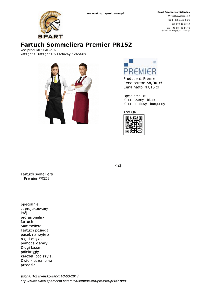 www.sklep.spart.com.pl Spart Przemysław Szlendak Wyczółkowskiego 57 65-140 Zielona Góra tel. 697 17 33 17 fax. +48 68 422 11 78 e-mail: [email protected] Fartuch Sommeliera Premier PR152 kod produktu: FAR-502 kategoria: Kategorie > Fartuchy / Zapaski Producent: Premier Cena brutto: 58,00 zł Cena netto: 47,15 zł Opcje produktu: Kolor: czarny - black Kolor: bordowy - burgundy Kod QR: Krój Fartuch somelliera Premier PR152 Specjalnie zaprojektowany krój profesjonalny fartuch Sommeliera. Fartuch posiada pasek na szyję z regulacją za pomocą klamry. Długi fason, półokrągły karczek pod szyją. Dwie kieszenie na przodzie. strona: 1/2 wydrukowano: 03-03-2017 http://www.sklep.spart.com.pl/fartuch-sommeliera-premier-pr152.html Skład materiału: Produkowany w 3 kolorach: czarny, bordo, zielony butelkowy 35% Bawełna 65% Poli Właściwości materiału: wymiary: 86 strona: 2/2 wydrukowano: 03-03-2017 http://www.sklep.spart.com.pl/fartuch-sommeliera-premier-pr152.html