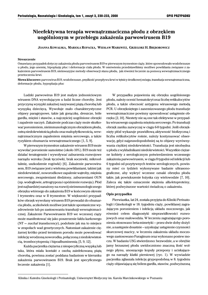Perinatologia, Neonatologia i Ginekologia, tom 1, zeszyt 3, 230-233, 2008 OPIS PRZYPADKU Nieefektywna terapia wewnątrzmaciczna płodu z obrzękiem uogólnionym w przebiegu zakażenia parwowirusem B19 JOANNA KOWALSKA, MARIOLA ROPACKA, WIESŁAW MARKWITZ, GRZEGORZ H. BRĘBOROWICZ Streszczenie Omawiany przypadek dotyczy zakażenia płodu parvowirusem B19 w pierwszym trymestrze ciąży, które spowodowało wodobrzusze u płodu, jego anemię, hipoplazję płuc i deformacje ciała płodu. W omówieniu przedstawiliśmy możliwe powikłania związane z zakażeniem parvowirusem B19, nieinwazyjne metody obserwacji stanu płodu, jak również leczenie za pomocą wewnątrzmacicznego przetoczenia krwi. Słowa kluczowe: parvowirus B19, wodobrzusze, prędkość przepływu krwi w tętnicy środkowej mózgu, transfuzja wewnątrzmaciczna, deformacje płodu, hypoplazja płuc Ludzki parwowirus B19 jest małym jednoniciowym wirusem DNA wywołującym u ludzi liczne choroby. Jest przyczyną wysypki zakaźnej nazywanej piątą chorobą lub wysypką dziecięcą. Wywołuje mało charakterystyczne objawy paragrypowe, takie jak gorączkę, dreszcze, bóle gardła, mięśni i stawów, a najczęściej uogólnione obrzęki i zapalenie naczyń. Zakażenie podczas ciąży może skutkować poronieniem, nieimmunologicznym obrzękiem płodu, ostrą niedokrwistością płodu oraz małopłytkowością, wewnątrzmacicznym zapaleniem mięśnia sercowego, a także ryzykiem obumarcia wewnątrzmacicznego [1, 5, 9]. W pierwszym trymestrze zakażenie wirusem B19 może wywołać poronienie samoistne (około 10%). B19 może też działać teratogennie i wywoływać zaburzenia rozwojowe narządu wzroku (brak tęczówki, brak soczewki, mikrooftalmię, uszkodzenie rogówki) [6]. Zakażenie parwowirusem, B19 związane jest z wieloma powikłaniami, takimi jak niedokrwistość, noworodkowe zapalenie wątroby, mięśnia sercowego, zwapnieniami śledziony, zaburzeniami OUN (np. wodogłowie, artrogrypoza i opóźnienie rozwoju). Płód jest najbardziej narażony na rozwój nieimmunologicznego obrzęku wtórnego do zakażenia B19 w końcowym okresie I trymestru oraz w II trymestrze. W większości przypadków obrzęk wywołany wirusem B19 prowadzi do obumarcia płodu, aczkolwiek możliwe jest także spontaniczne wyzdrowienie lub po zastosowaniu transfuzji wewnątrzmacicznej. Zakażenie Parwowirusem B19 we wczesnej ciąży może manifestować się jako poszerzenie fałdu karkowego (NT — nuchal translucency), podobnie jak ma to miejsce w zespołach wad genetycznych. Natomiast zakażenie ciężarnej krótko przed terminem porodu może powodować infekcję wrodzoną noworodka, połączoną z niedokrwistością, trombocytopenią i hipoalbuminemią [5, 9, 12]. Każda pacjentka ciężarna z niespecyficzną wsypką lub taka, która miała kontakt z osobą zainfekowaną piątą chorobą, powinna zostać poddana badaniom w kierunku zakażenia parwowirusem B19. Brak jest specyficznego leczenie zakażenia [1]. W przypadku pojawienia się obrzęku uogólnionego płodu, należy ocenić hematokryt oraz liczbę retikulocytów płodu, a także obecność antygenu wirusowego metodą PCR. U obrzękniętego i zanemizowanego płodu transfuzje wewnątrzmaciczne powinny spowodować ustąpienie obrzęku [2, 10]. Niestety nie są one tak efektywne w przypadku wirusowego zapalenia mięśnia sercowego. Po transfuzji obrzęk zanika zazwyczaj w ciągu 6-8 tygodni. Jeśli obrzęknięty płód wykazuje prawidłową aktywność biofizyczną i liczba retikulocytów rośnie, należy kontynuować obserwację, gdyż najprawdopodobniej są to objawy wyrównywania ciężkiej niedokrwistości. Transfuzja jest niezbędna u płodu z wykładnikami niedokrwistości. Wszystkie ciężarne kobiety z serologicznym potwierdzeniem wczesnego zakażenia parwowirusem, w ciągu 8 tygodni od infekcji lub 6 tygodni od pozytywnych testów serologicznych, powinny mieć co tydzień wykonywane badanie ultrasonograficzne, aby wykryć wczesne oznaki obrzęku płodu takie, jak powiększenie łożyska czy wielowodzie [7, 10]. Zaleca się także oznaczenie stężenia alfa-fetoproteiny, której podwyższone wartości świadczą o zakażeniu. Opis przypadku Pierwiastka, lat 24, została przyjęta do Kliniki Perinatologii i Ginekologii w 18. tygodniu ciąży, powikłanej zagrażającym poronieniem i infekcją układu moczowego, jak również celem diagnostyki nieprawidłowości rozwojowych oraz małowodzia. W leczeniu zagrażającego poronienia stosowano beta-mimetyki – przez dwie doby dożylnie, a następnie doustnie – uzyskując ustąpienie czynności skurczowej macicy, w leczeniu zakażenia układu moczowego zastosowano Furaginum oraz wykonano posiew moczu. W badaniu USG stwierdzono: bezwodzie, a w obrębie jamy brzusznej płodu uwidoczniono znaczną ilość wolnego płynu, unoszącego kopuły przepony i uciskającego na narządy klatki piersiowej (ryc. 1). W wywiadzie pacjentka zgłaszała infekcję grypopodobną w 8. tygodniu ciąży objawiającą się bólem gardła, stawów, podwyższoną Klinika i Katedra Ginekologii i Perinatologii, Uniwersytet Medyczny im. Karola Marcinkowskiego w Poznaniu Nieefektywna terapia płodu z obrzękiem uogólnionym w przebiegu zakażenia parwowirusem B19 temperaturą i ogólnym osłabieniem jak również dolegliwości ze strony układu moczowego – stwierdzono kamicę nerkową i zakażenie moczu Klebsiellą pneumoniae. W trakcie diagnostyki stwierdzanych nieprawidłowości wykonano następujące badania dodatkowe: posiewy krwi (ujemne), grupa krwi (0 Rh dodatni), posiewy moczu (ujemne), przeciwciała przeciw antygenowi toksoplazmozy, wirusowi różyczki, opryszczki, CMV (ujemne w klasach IgG i IgM), VDRL (ujemne). W 20. tygodniu ciąży wykonano kordocentezę diagnostyczną i odbarczenie płynu z jamy brzusznej płodu, w ilości 350 ml. Kariotyp płodu był prawidłowy (46XY), natomiast morfologia płodu wskazywała na rozpoczynającą się niedokrwistość i mało