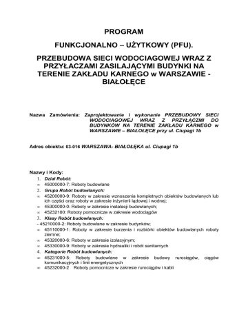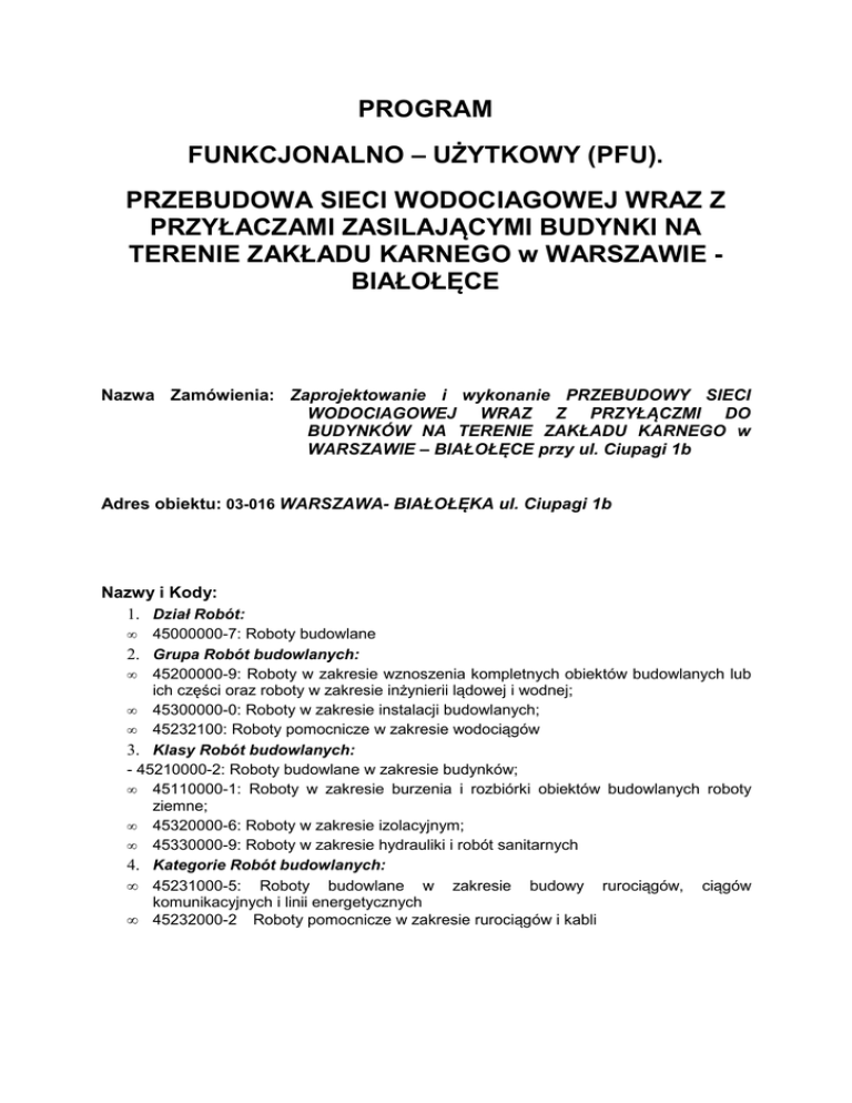 PROGRAM FUNKCJONALNO – UŻYTKOWY (PFU). PRZEBUDOWA SIECI WODOCIAGOWEJ WRAZ Z PRZYŁACZAMI ZASILAJĄCYMI BUDYNKI NA TERENIE ZAKŁADU KARNEGO w WARSZAWIE BIAŁOŁĘCE Nazwa Zamówienia: Zaprojektowanie i wykonanie PRZEBUDOWY SIECI WODOCIAGOWEJ WRAZ Z PRZYŁĄCZMI DO BUDYNKÓW NA TERENIE ZAKŁADU KARNEGO w WARSZAWIE – BIAŁOŁĘCE przy ul. Ciupagi 1b Adres obiektu: 03-016 WARSZAWA- BIAŁOŁĘKA ul. Ciupagi 1b Nazwy i Kody: 1. Dział Robót: • 45000000-7: Roboty budowlane 2. Grupa Robót budowlanych: • 45200000-9: Roboty w zakresie wznoszenia kompletnych obiektów budowlanych lub ich części oraz roboty w zakresie inżynierii lądowej i wodnej; • 45300000-0: Roboty w zakresie instalacji budowlanych; • 45232100: Roboty pomocnicze w zakresie wodociągów 3. Klasy Robót budowlanych: - 45210000-2: Roboty budowlane w zakresie budynków; • 45110000-1: Roboty w zakresie burzenia i rozbiórki obiektów budowlanych roboty ziemne; • 45320000-6: Roboty w zakresie izolacyjnym; • 45330000-9: Roboty w zakresie hydrauliki i robót sanitarnych 4. Kategorie Robót budowlanych: • 45231000-5: Roboty budowlane w zakresie budowy rurociągów, ciągów komunikacyjnych i linii energetycznych • 45232000-2 Roboty pomocnicze w zakresie rurociągów i kabli Nazwa Zamawiającego: ZAKŁAD KARNY w WARSZAWIE – BIAŁOŁĘCE przy ul. Ciupagi 1b Zawartość Programu Funkcjonalno – Użytkowego: I. Część opisowa: 1. Opis ogólny przedmiotu zamówienia 2. Opis wymagań Zamawiającego w stosunku do przedmiotu zamówienia II. Specyfikacja Techniczna Wykonania i Odbioru Robót Budowlanych. III. Część informacyjna programu funkcjonalno - użytkowego I. CZĘŚĆ OPISOWA 1. OPIS PRZEDMIOTU ZAMÓWIENIA 1.1. Zakres przedmiotu zamówienia Przedmiotem zamówienia jest wykonanie przez Wykonawcę prac projektowych wraz z niezbędnymi pozwoleniami, uzgodnieniami i opiniami, a następnie prac budowlanomontażowych związanych z PRZEBUDWĄ SIECI WODOCIAGOWEJ WRAZ Z PRZYŁĄCZMI DO BUDYNKÓW NA TERENIE ZAKŁADU KARNEGO w WARSZAWIE – BIAŁOŁĘCE przy ul. Ciupagi 1b. Niniejszy Program funkcjonalno-użytkowy obejmuje opis przedmiotowego zadania budowlanego zgodnie z wymogami prawa zamówień publicznych, w szczególności podaje przeznaczenie ukończonych robót budowlanych oraz stawiane im wymagania techniczne, ekonomiczne, materiałowe i funkcjonalne. Przedmiotowe zadanie inwestycyjne będzie finansowane ze środków z budżetu Inwestora. Wykonawca winien zrealizować powierzone zadanie z najwyższą starannością i terminowo. 1.3. Gwarancje W ramach niniejszej umowy ustala się następujący Wykaz Gwarancji. Parametr Okres Zgłaszania Wad Wartość/ Termin Odstępstwa Jednostka Gwarancji /Tolerancja miesiące 12 - Gwarancja na urządzenia miesiące 36 - serwisu lata 10 - części lata 10 - na reakcję godziny maks. 24 - Czas od wezwania na usunięcie godziny maks. 72 - miesiące 2 - Okres dostępności pogwarancyjnego Okres dostępności zamiennych i materiałów eksploatacyjnych Czas od wezwania serwisową wady lub usterki Roboty budowlane 1.4. Zakres przedmiotu zamówienia. 1.4.1. Prace projektowe Nr Zakres Robót Elementów Robót 1 DOKUMENTACJA PROJEKTOWA 1.1 Projekt budowlany 1.2 Dokumentacja powykonawcza Wykonawca opracuje Dokumenty Wykonawcy obejmujące, co najmniej: • Założenia przedprojektowe, • Projekt budowlany wraz z niezbędnymi pozwoleniami, opiniami i uzgodnieniami dla celów realizacji inwestycji. Zaakceptowany przez inwestora projekt budowlany stanowić będzie podstawę dla potrzeb wykonawstwa PFU, • Przedmiar Robót umożliwiający etapowe rozliczanie inwestycji, • Dokumentację powykonawczą z naniesionymi w sposób czytelny wszelkimi zmianami wprowadzonymi w trakcie budowy wraz z inwentaryzacją geodezyjną wykonanych sieci i obiektów, • Instrukcje eksploatacji: sieci, instalacji, itp. oraz pozostałe wymagane prawem dokumenty eksploatacyjne, • Raport porealizacyjny opracowany po Okresie Usuwania Wad, w którym Wykonawca przedstawi wyniki w zakresie pozwalającym na sprawdzenie (a) Wykazu Gwarancji, (b) wskaźników eksploatacyjnych, • Badania i analizy uzupełniające. Przed rozpoczęciem prac Wykonawca zweryfikuje dane wyjściowe do projektowania przygotowane przez Zamawiającego, wykona na własny koszt wszystkie badania i analizy uzupełniające niezbędne dla prawidłowego wykonania Dokumentów Wykonawcy, a w szczególności Projektu Budowlanego, sporządzi mapę do celów projektowych i przeprowadzi procedurę ZUD z naniesieniem tras projektowanej sieci wraz z przyłączami. Jednocześnie nadmieniamy, iż za punkt włączenia sieci należy uznać istniejąca studnię wodomierzową na terenie Aresztu Śledczego, której brak na ewidencji geodezyjnej, łącznie z istniejącym do niej przyłączem. Kwestie te należy uwzględnić do inwentaryzacji w opracowywanej dokumentacji projektowej. Wyjaśnienia wymaga również sposób zasilenia istniejących budynków. W zamyśle inwestora powinno być to zrealizowane na zasadzie jeden budynek = jedno przyłącze. W przypadku braku możliwości uzyskania takiego stanu, instalacje wewnętrzna w budynkach należy przebudować w odpowiedni sposób. Prace te powinny być zawarte w dokumentacji projektowej sporządzonej przez wykonawcę. Informujemy również że na chwilę obecna na terenie ZAKŁADU KARNEGO trwają prace związane z budowa sieci cieplnej niskoparametrowej zasilającej istniejące budynki. Weryfikacja i sprawdzanie Dokumentacji Projektowej. Jeżeli prawo lub względy praktyczne wymagają, aby niektóre Dokumenty Wykonawcy były poddane weryfikacji przez osoby uprawnione lub uzgodnieniu przez odpowiednie władze, to przeprowadzenie weryfikacji i/lub uzyskanie uzgodnień będzie przeprowadzone przez Wykonawcę na jego koszt, po wcześniejszym wewnętrznym skoordynowaniu dokumentacji przez projektantów branżowych (z ich zapisem potwierdzającym powyższe czynności) i przed przedłożeniem tej dokumentacji do zatw