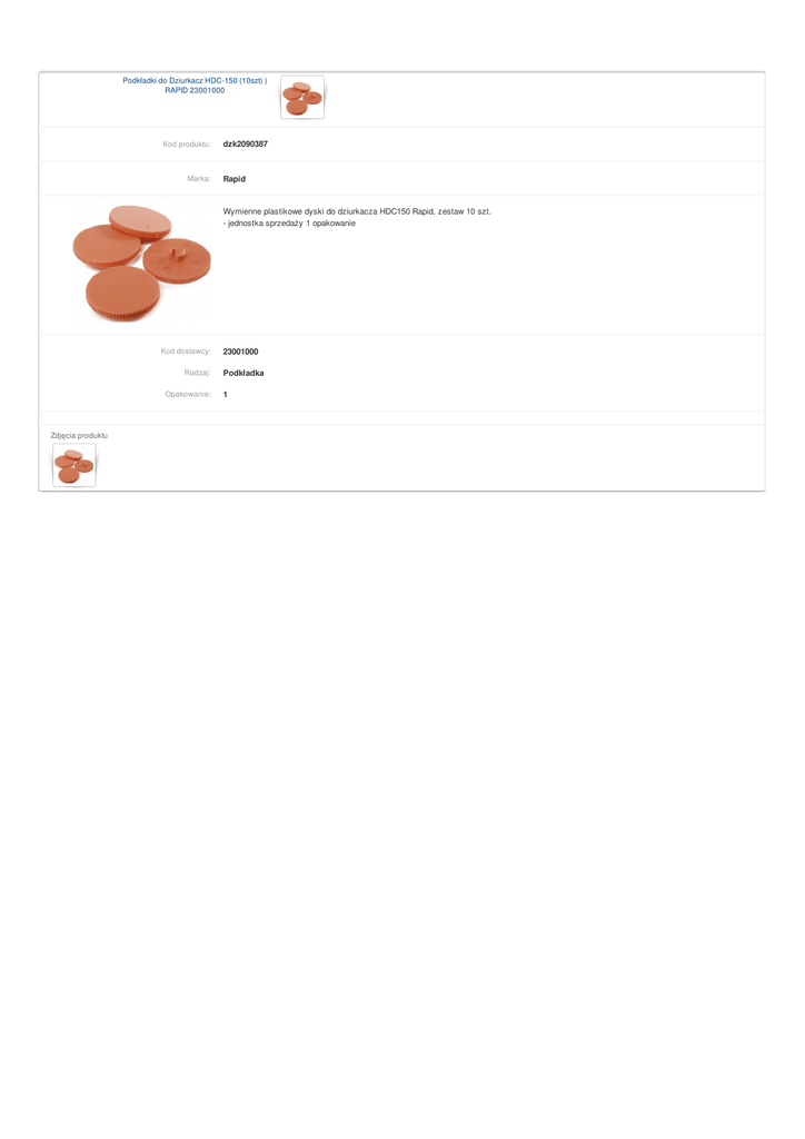 Podkładki do Dziurkacz HDC-150 (10szt) ) RAPID 23001000 Kod produktu: Marka: dzk2090387 Rapid Wymienne plastikowe dyski do dziurkacza HDC150 Rapid, zestaw 10 szt. - jednostka sprzedaży 1 opakowanie Kod dostawcy: Rodzaj: Opakowanie: Zdjęcia produktu 23001000 Podkładka 1