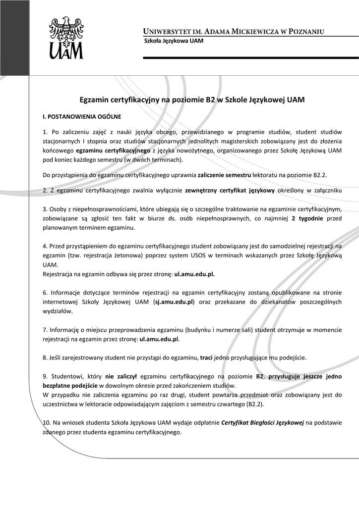Szkoła Językowa UAM Egzamin certyfikacyjny na poziomie B2 w Szkole Językowej UAM I. POSTANOWIENIA OGÓLNE 1. Po zaliczeniu zajęć z nauki języka obcego, przewidzianego w programie studiów, student studiów stacjonarnych I stopnia oraz studiów stacjonarnych jednolitych magisterskich zobowiązany jest do złożenia końcowego egzaminu certyfikacyjnego z języka nowożytnego, organizowanego przez Szkołę Językową UAM pod koniec każdego semestru (w dwóch terminach). Do przystąpienia do egzaminu certyfikacyjnego uprawnia zaliczenie semestru lektoratu na poziomie B2.2. 2. Z egzaminu certyfikacyjnego zwalnia wyłącznie zewnętrzny certyfikat językowy określony w załączniku 3. Osoby z niepełnosprawnościami, które ubiegają się o szczególne traktowanie na egzaminie certyfikacyjnym, zobowiązane są zgłosić ten fakt w biurze ds. osób niepełnosprawnych, co najmniej 2 tygodnie przed planowanym terminem egzaminu. 4. Przed przystąpieniem do egzaminu certyfikacyjnego student zobowiązany jest do samodzielnej rejestracji na egzamin (tzw. rejestracja żetonowa) poprzez system USOS w terminach wskazanych przez Szkołę Językową UAM. Rejestracja na egzamin odbywa się przez stronę: ul.amu.edu.pl. 6. Informacje dotyczące terminów rejestracji na egzamin certyfikacyjny zostaną opublikowane na stronie internetowej Szkoły Językowej UAM (sj.amu.edu.pl) oraz przekazane do dziekanatów poszczególnych wydziałów. 7. Informację o miejscu przeprowadzenia egzaminu (budynku i numerze sali) student otrzymuje w momencie rejestracji na egzamin przez stronę: ul.amu.edu.pl. 8. Jeśli zarejestrowany student nie przystąpi do egzaminu, traci jedno przysługujące mu podejście. 9. Studentowi, który nie zaliczył egzaminu certyfikacyjnego na poziomie B2, przysługuje jeszcze jedno bezpłatne podejście w dowolnym okresie przed zakończeniem studiów. W przypadku nie zaliczenia egzaminu po raz drugi, student powtarza przedmiot oraz zobowiązany jest do uczestnictwa w lektoracie odpowiadającym zajęciom z semestru czwartego (B2.2). 10. Na wniosek studenta Szkoła Językowa UAM wydaje odpłatnie Certyfikat Biegłości Językowej na podstawie zdanego przez studenta egzaminu certyfikacyjnego. Szkoła Językowa UAM 11. Wysokość opłaty za Certyfikat Biegłości Językowej reguluje Zarządzenie Nr 325/2013/2014 Rektora Uniwersytetu im. Adama Mickiewicza w Poznaniu z dnia 12 sierpnia 2014. 12. Wyniki końcowe egzaminu zostaną opublikowane w systemie USOS w ciągu dwóch tygodni od daty egzaminu. 13. W przypadku uzyskania pozytywnego wyniku końcowego z całości egzaminu, student nie ma możliwości ponownego podejścia do egzaminu. 14. Egzamin jest przeprowadzany komisyjnie, w skład komisji wchodzą lektorzy SJ UAM. II. OPIS EGZAMINU CERYTFIKACYJNEGO Egzamin certyfikacyjny z języka obcego na poziomie B2 obejmuje dwie części: pisemną oraz ustną. Za cały egzamin można uzyskać 200 punktów (egzamin pisemny 160 punktów + egzamin ustny 40 punktów) Czas trwania części pisemnej: 150 min. Na egzamin pisemny należy stawić się punktualnie (najlepiej ok. 30 minut przed jego rozpoczęciem) oraz zabrać ze sobą dowód osobisty. W przypadku spóźnienia się na egzamin, egzaminator ma prawo niedopuszczenia studenta do egzaminu (tym samym student traci jedno podejście). W przypadku nie dokonania rejestracji na egzamin w terminie wytyczonym przez SJ UAM, egzaminator ma prawo niedopuszczenia studenta do egzaminu w danym terminie. Student może mieć przy sobie wyłącznie przybory do pisania. Odzież wierzchnia (płaszcze, kurtki), torby, plecaki muszą zostać pozostawione w szatni lub w wytyczonym przez prowadzących egzamin miejscu. Na egzaminie obowiązuje całkowity zakaz używania telefonów komórkowych oraz innych urządzeń mobilnych. Niestosowanie się do tego punktu regulaminu spowoduje natychmiastowe usunięcie studenta z sali egzaminacyjnej. Podczas egzaminu student nie może korzystać z żadnych dodatkowych materiałów tj. słowników lub podręczników. Szkoła Językowa UAM 1. Egzamin pisemny Egzamin pisemny składa się z 4 części. Są to: Czytanie ze zrozumieniem Test gramatyczno - leksykalny Rozumienie ze słuchu Wypowiedź pisemna Typy zadań w obrębie testowania poszczególnych sprawności: Czytanie ze zrozumieniem: dwa teksty do czytania Możliwe typy zadań sprawdzających sprawność czytania ze zrozumieniem: zadania sprawdzające globalne lub selektywne rozumienie tekstu czytanego: prawda/fałsz (w których student stwierdza zgodność (lub niezgodność) zdań zawartych w zadaniu z treścią przeczytanego tekstu); test wielokrotnego wyboru (w którym student wybiera poprawną odpowiedź spośród kilku podanych propozycji); zadania na dobieranie (w których student łączy ze sobą lub przyporządkowuje do siebie odpowiednie elementy np. fragmenty tekstu). Rozumienie ze słuchu: dwa teksty do słuchania (np. monolog, dialog) Możliwe typy zadań sprawdzających sprawność rozumienie ze słuchu: prawda/fałsz (w których student stwierdza zgodność lub niezgodność zdań zawartych w zadaniu z treścią wysłuchanego tekstu); test wielokrotnego wyboru (w którym student wybiera poprawną odpowiedź spośród kilku podanych propozycji); zadania z luką (w których student wstawia odpowiednie słowo, wyrażenie, liczbę jako uzupełnienie zwrotu, zdania, fragmentu tekstu). Szkoła Językowa UAM Test gramatyczno - leksykalny Możliwe typy zadań sprawdzających znajomość gramatyki i leksyki: test wielokrotnego wyboru (w którym student wybiera poprawną odpowiedź spośród kilku podanych propozycji); zadania na dobieranie (w których student łączy ze sobą lub przyporządkowuje do siebie odpowiednie elementy (np. słowa, wyrażenia); zadania z luką (w których student wstawia odpowiednie słowo, wyrażenie, etc. jako uzupełnienie zwrotu, zdania, fragmentu tekstu); substytucja (zadanie polegające na zastąpieniu słowa lub wyrażenia synonimem/ frazą -