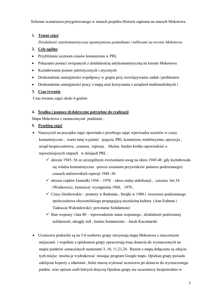 Schemat scenariusza przygotowanego w ramach projektu Historia zapisana na murach Mokotowa 1. Temat zajęć Działalność antykomunistyczna upamiętniona pomnikami i tablicami na terenie Mokotowa 2. Cele ogólne Przybliżenie uczniom czasów komunizmu w PRL Pokazanie postaci związanych z działalnością antykomunistyczną na terenie Mokotowa Kształtowanie postaw patriotycznych i etycznych Doskonalenie umiejętności współpracy w grupie przy rozwiązywaniu zadań i problemów Doskonalenie umiejętności pracy z mapą oraz korzystania z urządzeń multimedialnych i 3. Czas trwania Czas trwania zajęć około 4 godzin 4. Środku i pomoce dydaktyczne potrzebne do realizacji Mapa Mokotowa z zaznaczonymi punktami , 5. Przebieg zajęć Nauczyciel na początku zajęć opowiada o przebiegu zajęć wprowadza uczniów w czasy komunistyczne , warto tutaj wyjaśnić pojęcia; PRL komunizm, totalitaryzmu, opozycja , urząd bezpieczeństwa , cenzura, represje . Można bardzo krótko opowiedzieć o najważniejszych etapach w dziejach PRL : okresie 1945- 56 ze szczególnym zwróceniem uwag na okres 1945-48 gdy kształtowała się władza komunistyczna -proces szesnastu przywódców państwa podziemnego) czasach stalinowskich represji 1948 -56 okresie rządów Gomułki 1956 – 1970 - okres małej stabilizacji , cenzura list 34 (Wańkowicz, Jasienica) wystąpienia 1968, 1970 , Czasy Gierkowskie – protesty w Radomiu , Strajki w 1980 i tworzenie podziemnego społeczeństwa obywatelskiego propagującą niezależną kulturę (Ann Erdman i Tadeusza Walendowski) powstanie Solidarności Stan wojenny i lata 80 – wprowadzenie stanu wojennego , działalność podziemnej solidarność, okrągły stół , koniec komunizmu – Jacek Kaczmarski Uczniowie podzielni są na 5-6 osobowe grupy otrzymują mapę Mokotowa z znaczonymi miejscami i wspólnie z opiekunem grupy opracowują trasę dotarcia do wyznaczonych na mapie punktów oznaczonych numerami 3, 10, 11,21,24. Razem z mapą dołączone są zdejcia tych miejsc można je wydrukować stosując program Google maps. Opiekun grupy posiada zaklejone koperty z zdaniami , które muszą wykonać uczniowie po dotarciu do wyznaczonego punktu oraz opisem osób których dotyczą Opiekun grupy nie uczestniczy bezpośrednio w 1 realizowaniu zadań a pełni rolę obserwatora i może przyznawać punkty za zachowanie w czasie trwania gry i współpracę grupy. Grupa po zgłoszeniu gotowości rozpoczyna realizację zadań, warto pamiętać aby wszystkie grupy nie rozpoczęły wykonywania w tym samym czasie dlatego należy zachować odstęp ok. 15-20 minut pomiędzy grupami . Można także wprowadzić limit czasowy ok. 2,5 godzin na wykonie całej trasy i przyznawać punkty ujemne za spóźnienie grupy. Po dotarciu na wyznaczone na mapie punkty opiekun grupy odczytuje lub opowiada informację o osobie, której poświęcona jest tablica a następnie uczniowie wykonują zadania. Kolejność dotarcia do punktów jest ustalana przez grupę Poniżej podajemy przykładowe zadania jakie można wykorzystać przy poszczególnych punktach Punkt 3 Jacek Kaczmarski - Uczniowie interpretują tekst piosenki Kaczmarskiego „Mury” Tekst pieśni jest ogólnodostępny , można także odtworzyć piosenkę korzystając z jakiegoś urządzenie multimedialnego. Proponowane pytania potrzebne do interpretacji : o czym opowiada tekst piosenki , co symbolizuje motyw muru który pojawia się w piosence, nadajcie własny tytuł pieśni Kaczmarskiego Punkt 10 Melchior Wańkowicz – Melchior Wańkowicz za napisanie tekstu do radia Wolna Europa za co został aresztowany 5 października 1964 roku w mieszkaniu przed budynkiem którego się obecnie znajdujecie. Spędził w areszcie 5 tygodni . Wyrokiem sądu PRL został skazany na 3 lata więzieni a. Ostatecznie władze nie zdecydowały się na wykonanie wyroku . Napiszcie list otwarty do ówczesnego I sekretarza PZPR Władysława Gomółki w którym będziecie domagać się uwolnienia aresztowanego pisarza Punkt 11- W 1964 Paweł Jasienica był jednym z 34 polskich pisarzy którzy podpisali list protestacyjny przeciwka ograniczaniu wolności słowa (cenzurze). Napiszcie podobny list w którym uzasadnicie dlaczego nie warto ograniczać wolności słowa Punkty 21 oraz 22 – punkt 21 Tablica na murze upamiętniająca wymordowanie 283 więźniów politycznych przez komunistów po roku 1945 w Areszcie Śledczym bezpieki. oraz tablica 22 upamiętniająca Kazimierza Pużaka, Sekretarza Generalnego Polskiej Partii Socjalistycznej, przewodniczącego Rady Jedności Narodowej, jednego ze skazanych w pokazowym procesie szesnastu, umęczonego na śmierć w więzieniu w Rawiczu Uczniowie przygotowują ulotkę zapraszającą na manifestację domagającą się uwolnienia przetrzymywanych w areszcie więźniów politycznych Punkt 24 Tablica poświęcona opozycyjnemu salonowi literackiemu prowadzonego przez wnuczkę Wańkowicza wraz z mężem. Napis brzmi: "W tym domu w latach 1976-1979 działał opozycyjny salon literacki prowadzony przez Annę Erdman i Tadeusza Walendowskiego, propagujący niezależną kulturę – podpis :bywalcy i przyjaciele." Uczniowie przygotowują zaproszenia do udziału w literackim spotkaniu poświęconemu literaturze . 2 Po powrocie wszystkich dobywa się podsumowanie a po obejrzeniu wyników prac grup ogłoszenie wyników gry miejskiej. 3