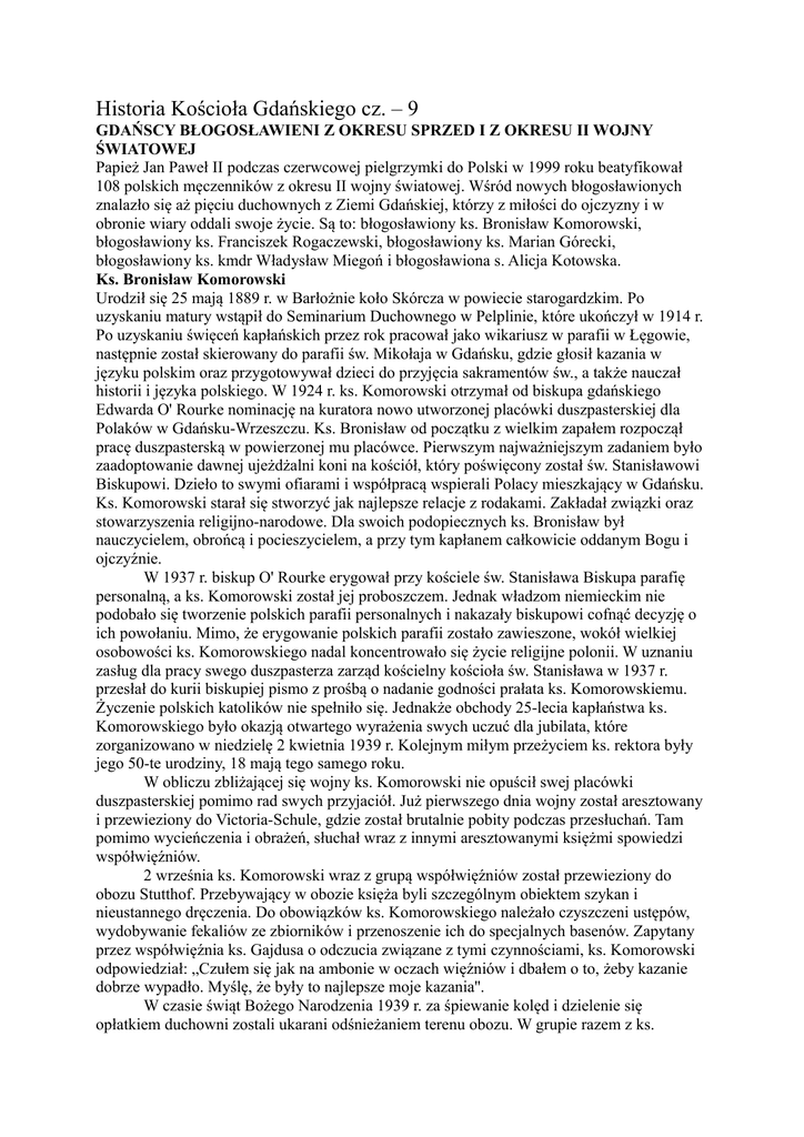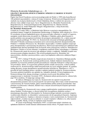 Historia Kościoła Gdańskiego cz. – 9 GDAŃSCY BŁOGOSŁAWIENI Z OKRESU SPRZED I Z OKRESU II WOJNY ŚWIATOWEJ Papież Jan Paweł II podczas czerwcowej pielgrzymki do Polski w 1999 roku beatyfikował 108 polskich męczenników z okresu II wojny światowej. Wśród nowych błogosławionych znalazło się aż pięciu duchownych z Ziemi Gdańskiej, którzy z miłości do ojczyzny i w obronie wiary oddali swoje życie. Są to: błogosławiony ks. Bronisław Komorowski, błogosławiony ks. Franciszek Rogaczewski, błogosławiony ks. Marian Górecki, błogosławiony ks. kmdr Władysław Miegoń i błogosławiona s. Alicja Kotowska. Ks. Bronisław Komorowski Urodził się 25 mają 1889 r. w Barłożnie koło Skórcza w powiecie starogardzkim. Po uzyskaniu matury wstąpił do Seminarium Duchownego w Pelplinie, które ukończył w 1914 r. Po uzyskaniu święceń kapłańskich przez rok pracował jako wikariusz w parafii w Łęgowie, następnie został skierowany do parafii św. Mikołaja w Gdańsku, gdzie głosił kazania w języku polskim oraz przygotowywał dzieci do przyjęcia sakramentów św., a także nauczał historii i języka polskiego. W 1924 r. ks. Komorowski otrzymał od biskupa gdańskiego Edwarda O' Rourke nominację na kuratora nowo utworzonej placówki duszpasterskiej dla Polaków w Gdańsku-Wrzeszczu. Ks. Bronisław od początku z wielkim zapałem rozpoczął pracę duszpasterską w powierzonej mu placówce. Pierwszym najważniejszym zadaniem było zaadoptowanie dawnej ujeżdżalni koni na kościół, który poświęcony został św. Stanisławowi Biskupowi. Dzieło to swymi ofiarami i współpracą wspierali Polacy mieszkający w Gdańsku. Ks. Komorowski starał się stworzyć jak najlepsze relacje z rodakami. Zakładał związki oraz stowarzyszenia religijno-narodowe. Dla swoich podopiecznych ks. Bronisław był nauczycielem, obrońcą i pocieszycielem, a przy tym kapłanem całkowicie oddanym Bogu i ojczyźnie. W 1937 r. biskup O' Rourke erygował przy kościele św. Stanisława Biskupa parafię personalną, a ks. Komorowski został jej proboszczem. Jednak władzom niemieckim nie podobało się tworzenie polskich parafii personalnych i nakazały biskupowi cofnąć decyzję o ich powołaniu. Mimo, że erygowanie polskich parafii zostało zawieszone, wokół wielkiej osobowości ks. Komorowskiego nadal koncentrowało się życie religijne polonii. W uznaniu zasług dla pracy swego duszpasterza zarząd kościelny kościoła św. Stanisława w 1937 r. przesłał do kurii biskupiej pismo z prośbą o nadanie godności prałata ks. Komorowskiemu. Życzenie polskich katolików nie spełniło się. Jednakże obchody 25-lecia kapłaństwa ks. Komorowskiego było okazją otwartego wyrażenia swych uczuć dla jubilata, które zorganizowano w niedzielę 2 kwietnia 1939 r. Kolejnym miłym przeżyciem ks. rektora były jego 50-te urodziny, 18 mają tego samego roku. W obliczu zbliżającej się wojny ks. Komorowski nie opuścił swej placówki duszpasterskiej pomimo rad swych przyjaciół. Już pierwszego dnia wojny został aresztowany i przewieziony do Victoria-Schule, gdzie został brutalnie pobity podczas przesłuchań. Tam pomimo wycieńczenia i obrażeń, słuchał wraz z innymi aresztowanymi księżmi spowiedzi współwięźniów. 2 września ks. Komorowski wraz z grupą współwięźniów został przewieziony do obozu Stutthof. Przebywający w obozie księża byli szczególnym obiektem szykan i nieustannego dręczenia. Do obowiązków ks. Komorowskiego należało czyszczeni ustępów, wydobywanie fekaliów ze zbiorników i przenoszenie ich do specjalnych basenów. Zapytany przez współwięźnia ks. Gajdusa o odczucia związane z tymi czynnościami, ks. Komorowski odpowiedział: „Czułem się jak na ambonie w oczach więźniów i dbałem o to, żeby kazanie dobrze wypadło. Myślę, że były to najlepsze moje kazania''. W czasie świąt Bożego Narodzenia 1939 r. za śpiewanie kolęd i dzielenie się opłatkiem duchowni zostali ukarani odśnieżaniem terenu obozu. W grupie razem z ks. Komorowskim byli również: ks. Rogaczewski, ks. Górecki i ks. Wiecki. Na początku marca 1940 r. kapłanów przewieziono do miejscowości Grenzdorf, gdzie przez kilka dni pracowali w miejscowych kamieniołomach. Tam też księża i aresztowani przedstawiciele inteligencji byli przesłuchiwani do 17 marca 1940 r. Po zakończonych przesłuchaniach została utworzona kompania karna – SK (Strafkompanie), liczącej 45 przedstawicieli gdańskiej polonii. Członkom kompani nie było wolno chodzić, a wszystkie zadania musieli wykonywać biegnąc. W tej grupie byli ks. Komorowski i ks. Górecki, którzy całkowicie opadli z sił po trzech dniach wyczerpujących prac. Wielki Czwartek 21 marca 1940 r. stał się dla więźniów szczególnym dniem, gdyż wtedy w baraku numer 5 odprawiono pierwszą w obozie Mszę św. Uczestniczyli w niej także ks. Komorowski i ks. Górecki, którzy w tej szczególnej Eucharystii przyjęli Komunię św. 22 marca 1940 r. w pobliskim lesie rozstrzelano 65 osób. Męczeńską śmierć ponieśli wówczas między innymi księża Komorowski i Górecki, których ciała ekshumowano i pochowano w 1947 r. na cmentarzu na gdańskiej Zaspie. Tuż po wojnie ukazało się wiele przekazów ustnych, mówiących o męczeństwie tych wielkich kapłanów, bardzo związanych z Gdańskiem. Od 1939 r. kościół św. Stanisława Biskupa, został zamieniony na warsztaty. Po 1972 r., został ponownie przekazany Kościołowi gdańskiemu. W 1974 r. z okazji 50-lecia poświęcenia kościoła na jego ścianie umieszczono tablicę pamiątkową poświęconą ks. Bronisławowi Komorowskiemu. Jego imieniem nazwano plac u zbiegu ulic Chrobrego, Legionów i Mickiewicza we Wrzeszczu, na którym postawiono pomnik tego wielkiego kapłana. Ks. Franciszek Rogaczewski Urodził się 23 grudnia 1892 r we wsi Lipinki. Po ukończeniu szkoły średniej w 1913 r. wstąpił do pelplińskiego Seminarium Duchownego. Ś