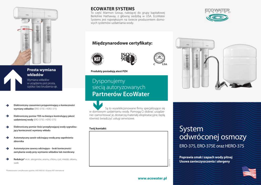 ECOWATER SYSTEMS To część Marmon Group, należącej do grupy kapitałowej Berkshire Hathaway, z główną siedzibą w USA. EcoWater Systems jest największym na świecie producentem domowych systemów uzdatniania wody. Międzynarodowe certyfikaty: Prosta wymiana wkładów Wymiana wkładów w urządzeniu jest prosta, szybka i bez brudzenia rąk. Produkty posiadają atest PZH Dysponujemy siecią autoryzowanych Partnerów EcoWater Elektroniczny czasomierz przypominający o konieczności wymiany wkładów (ERO-375E i HERO-375) Elektroniczny pomiar TDS na bieżąco kontrolujący jakość uzdatnionej wody (ERO-375E i HERO-375) Elektroniczny pomiar ilości przepływającej wody sygnalizujący konieczność wymiany wkładu Są to wyselekcjonowane firmy specjalizujące się w domowym uzdatnianiu wody. Pomogą Ci dobrać urządzenie i zamontować je, dostarczą materiały eksploatacyjne, będą również świadczyć usługi serwisowe. System odwróconej osmozy Twój kontakt: Automatyczny zawór odcinający wodę przy zapełnieniu zbiornika ERO-375, ERO-375E oraz HERO-375 Redukcja* m.in.: alergenów, arsenu, chloru, cyst, miedzi, ołowiu, siarki *Przetestowane i certyfikowane zgodnie z NSF/ANSI 42 i 58 przez NSF International DW1/5/15 Automatyczne zawory odcinające – brak konieczności zamykania wody przy wymianie wkładów lub membrany Poprawia smak i zapach wody pitnej Usuwa zanieczyszczenia i alergeny DLACZEGO WODA OCZYSZCZONA ODWRÓCONĄ OSMOZĄ JEST LEPSZA? System odwróconej osmozy zapewni Ci wysokiej jakości, smaczną wodę do picia oraz gotowania prosto z kranu. Urządzenie usunie zanieczyszczenia, osady, alergeny i związki, które wpływają na pogorszenie smaku i zapachu wody. Bogata gama dodatkowych akcesoriów: Pierścień monitorujący LED wskazujący konieczność wymiany wkładu lub membrany (możliwość dokupienia w ERO-375E oraz HERO-375) Moduł wifi Hydrolink® – możliwość zdalnego przesyłania danych dotyczących efektywności filtrów na panel sterowniczy (HERO-375) Możliwość rozbudowy systemu o dodatkowe filtry (np. do usuwania osadów lub lotnych związków organicznych VOC) Dodatkowy kranik w dwóch wersjach kolorystycznych: chrom oraz mat (możliwość dokupienia w ERO-375, ERO-375E oraz HERO-375) HIGIENICZNA CZYSTOŚĆ System zaprojektowany w USA jest maksymalnie zintegrowany, zajmuje niewiele miejsca i łatwo utrzymać go w czystości. PIJ SMACZNIEJSZĄ I ZDROWSZĄ WODĘ Pijąc wodę oczyszczoną przez odwróconą osmozę masz pewność, że dostarczasz sobie i najbliższym najlepszej jakości wodę – bez osadów, zanieczyszczeń, alergenów i przykrych zapachów. System odwróconej osmozy – funkcjonalne i nowoczesne uzdatnianie wody pitnej: Prosta, higieniczna wymiana filtrów i membrany Stały monitoring jakości wody z kranu dzięki pierścieniowi LED Bieżący dostęp do czystej, smacznej wody Czysta i zdrowa woda prosto z kranu Eliminacja alergenów System odwróconej osmozy usuwa z wody alergeny odpowiedzialne za problemy pokarmowe oraz podrażnienia skóry, zwłaszcza wśród dzieci.