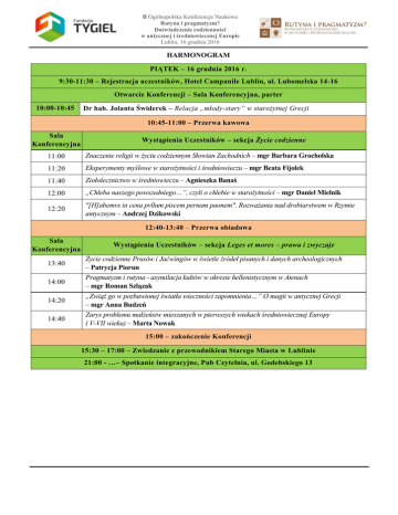 II Ogólnopolska Konferencja Naukowa Rutyna i pragmatyzm? Doświadczenie codzienności w antycznej i średniowiecznej Europie Lublin, 16 grudnia 2016 HARMONOGRAM PIĄTEK – 16 grudnia 2016 r. 9:30-11:30 – Rejestracja uczestników, Hotel Campanile Lublin, ul. Lubomelska 14-16 Otwarcie Konferencji – Sala Konferencyjna, parter 10:00-10:45 Dr hab. Jolanta Świderek – Relacja „młody-stary” w starożytnej Grecji 10:45-11:00 – Przerwa kawowa Sala Konferencyjna Wystąpienia Uczestników – sekcja Życie codzienne 11:00 Znaczenie religii w życiu codziennym Słowian Zachodnich – mgr Barbara Grocholska 11:20 Eksperymenty myślowe w starożytności i średniowieczu – mgr Beata Fijołek 11:40 Ziołolecznictwo w średniowieczu – Agnieszka Banaś 12:00 „Chleba naszego powszedniego…”, czyli o chlebie w starożytności – mgr Daniel Mielnik 12:20 "[H]abemvs in cena pvllum piscem pernam paonem". Rozważania nad drobiarstwem w Rzymie antycznym – Andrzej Dzikowski 12:40-13:40 – Przerwa obiadowa Sala Konferencyjna 13:40 14:00 14:20 14:40 Wystąpienia Uczestników – sekcja Leges et mores – prawa i zwyczaje Życie codzienne Prusów i Jaćwingów w świetle źródeł pisanych i danych archeologicznych – Patrycja Piorun Pragmatyzm i rutyna - asymilacja kultów w okresie hellenistycznym w Atenach – mgr Roman Szlązak „Zwiąż go w pozbawionej światła wieczności zapomnienia…” O magii w antycznej Grecji – mgr Anna Budzeń Zarys problemu małżeństw mieszanych w pierwszych wiekach średniowiecznej Europy ( V-VII wieku) – Marta Nowak 15:00 – zakończenie Konferencji 15:30 – 17:00 – Zwiedzanie z przewodnikiem Starego Miasta w Lublinie 21:00 - …– Spotkanie integracyjne, Pub Czytelnia, ul. Godebskiego 13
