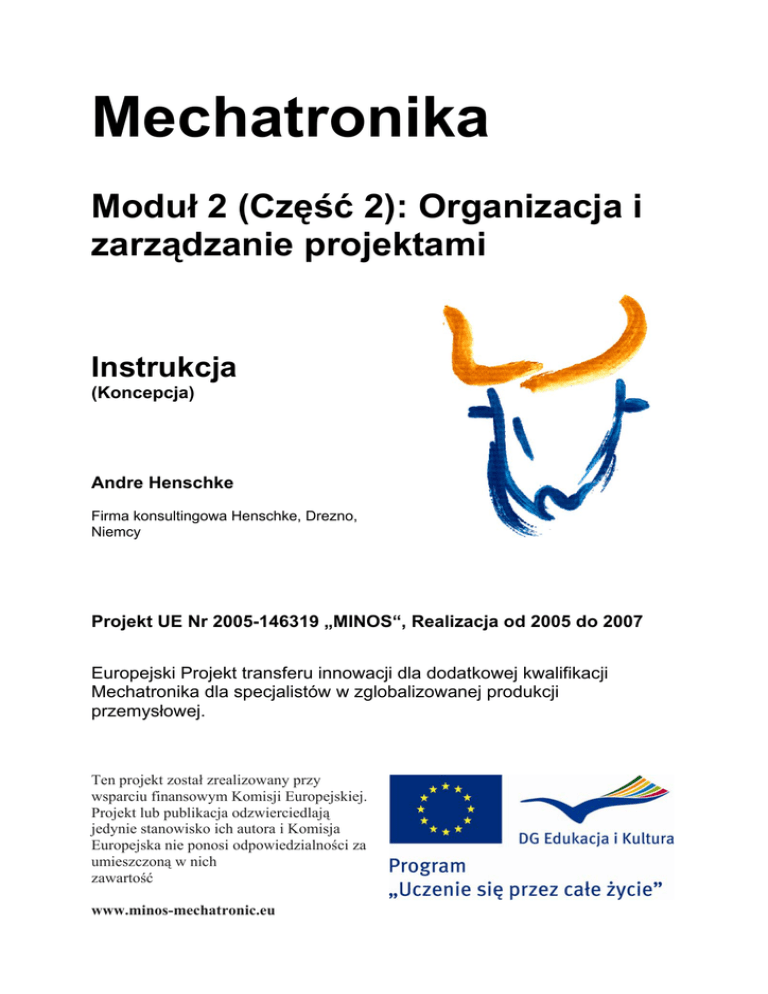 Mechatronika Moduł 2 (Część 2): Organizacja i zarządzanie projektami Instrukcja (Koncepcja) Andre Henschke Firma konsultingowa Henschke, Drezno, Niemcy Projekt UE Nr 2005-146319 „MINOS“, Realizacja od 2005 do 2007 Europejski Projekt transferu innowacji dla dodatkowej kwalifikacji Mechatronika dla specjalistów w zglobalizowanej produkcji przemysłowej. Ten projekt został zrealizowany przy wsparciu finansowym Komisji Europejskiej. Projekt lub publikacja odzwierciedlają jedynie stanowisko ich autora i Komisja Europejska nie ponosi odpowiedzialności za umieszczoną w nich zawartość www.minos-mechatronic.eu Partners for the creation, evaluation and dissemination of the MINOS and the MINOS** project. - Chemnitz University of Technology, Institute for Machine Tools and Production Processes, Germany - np – neugebauer und partner OhG, Germany - Henschke Consulting, Germany - Corvinus University of Budapest, Hungary - Wroclaw University of Technology, Poland - IMH, Machine Tool Institute, Spain - Brno University of Technology, Czech Republic - CICmargune, Spain - University of Naples Federico II, Italy - Unis a.s. company, Czech Republic - Blumenbecker Prag s.r.o., Czech Republic - Tower Automotive Sud S.r.l., Italy - Bildungs-Werkstatt Chemnitz gGmbH, Germany - Verbundinitiative Maschinenbau Sachsen VEMAS, Germany - Euroregionala IHK, Poland - Korff Isomatic sp.z.o.o. Wroclaw, Polen - Euroregionale Industrie- und Handelskammer Jelenia Gora, Poland - Dunaferr Metallwerke Dunajvaros, Hungary - Knorr-Bremse Kft. Kecskemet, Hungary - Nationales Institut für berufliche Bildung Budapest, Hungary - Christian Stöhr Unternehmensberatung, Germany - Universität Stockholm, Institut für Soziologie, Sweden Zawartość Szkolenia Minos: moduły 1 – 8 (podręczniki, ćwiczenia i rozwiązania do ćwiczeń dla): Podstawy/ Kompetencje międzykulturowe, zarządzenie projektem/ Fluidyka / Napędy Elektryczne i Sterowanie / Elementy Mechatroniki/ Systemy i Funkcje Mechatroniki/ Logistyka, Teleserwis, Bezpieczeństwo/ Zdalne Zarządzanie, Diagnostyka Minos **: moduły 9 – 12 (podręczniki, ćwiczenia i rozwiązania do ćwiczeń dla): Szybkie Prototypowanie / Robotyka/ Migracja/ Interfejsy Wszystkie moduły dostępne są w następujących językach: Polski, Angielski, Hiszpański, Włoski, Czeski, Węgierski i Niemiecki W celu uzyskania dodatkowych informacji proszę się skontaktować z Chemnitz University of Technology Dr.-Ing. Andreas Hirsch Reichenhainer Straße 70, 09107 Chemnitz phone: + 49(0)371 531-23500 fax: + 49(0)371 531-23509 e-mail: [email protected] www.tu-chemnitz.de/mb/WerkzMasch or www.minos-mechatronic.eu Organizacja i zarządzanie projektami - Instrukcja Minos Spis treści: Opis seminarium / klasyfikacja sektora przemysłu – specyficzny podział...................................... 5 Ogólne referencje i filozofia modułu Organizacji i Zarządzania Projektem .................................... 6 1 Tendencje w projektach ................................................................................................... 7 1.1 – 1.3 Praca nad projektem w przeszłości................................................................................. 7 1.4 Dziewięć obszarów wiedzy zarządzania projektem.......................................................... 8 2 Projekt – warunki i cechy.................................................................................................. 9 3 3.4 3.5 3.5.3 Rodzaje projektów.......................................................................................................... 10 Model faz projektu .......................................................................................................... 10 Charakterystyka zarządzania projektem międzynarodowym ......................................... 11 Wpływy socjologii na zarządzanie projektem międzynarodowym .................................. 11 4 Planowanie i horyzonty celów, zarządzania projektami ................................................. 15 5 5.10 Projekt i jego fazy ........................................................................................................... 16 Grupy procesów zarządzania projektami ....................................................................... 16 6 Organizacja projektu ...................................................................................................... 17 7 Zarządzanie projektem................................................................................................... 20 8 8.1 8.6 Planowanie projektu ....................................................................................................... 22 Planowanie celów........................................................................................................... 22 Metoda ścieżki krytycznej............................................................................................... 23 9 Kroki zapewniające powodzenie projektu ...................................................................... 24 10 Zarządzanie ryzykiem .................................................................................................... 26 Ćwiczenia grupowe ...................................................................................................................... 28 Ćwiczenie grupy 1 .......................................................................................................... 28 Ćwiczenie grupy 2 .......................................................................................................... 29 Ćwiczenie grupy 3 .......................................................................................................... 29 Ćwiczenie grupy 4 .......................................................................................................... 30 Ćwiczenie grupy 5 .......................................................................................................... 32 Ćwiczenie grupy 6 