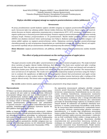 Kamil WILCZYŃSKI1), Zbigniew KOBUS1), Anna KRAWCZUK2), Rafał NADULSKI1) 1) Katedra Inżynierii i Maszyn Spożywczych, 2) Katedra Eksploatacji Maszyn i Zarządzania Procesami Produkcyjnymi, Uniwersytet Przyrodniczy w Lublinie .pl ARTYKUŁ RECENZOWANY lin Wpływ obróbki wstępnej miazgi na napięcie powierzchniowe soków jabłkowych Streszczenie .w m. tu. ko sza W pracy przedstawiono wyniki badania wpływu obróbki wstępnej na napięcie powierzchniowe soków jabłkowych. Surowcem były trzy odmiany jabłek: Idared, Golden Delicious, Red Delicious. Owoce umyto i po rozdrobnieniu tłoczono na świeżo, upłynniano enzymatycznie w temperaturze 20°C i 45°C, mrożono i rozmrażano a następnie wytłoczono w koszowej prasie laboratoryjnej. Pomiaru napięcia powierzchniowego dokonywano metodą wiszącej kropli. Pomiary przeprowadzono w 10 powtórzeniach. Wyniki badań poddano analizie wariancji ANOVA oraz zbadano istotność różnic wykorzystując test Tukey’a. Badania wykazały, że obróbka wstępna i odmiana jabłek wpływa na napięcie powierzchniowe soków. Najwyższą wartością napięcia powierzchniowego charakteryzowały się soki otrzymywane bezpośrednio po rozdrobnieniu miazgi dla odmiany Idared, zaś najniższą wartość uzyskały soki po zastosowaniu obróbki enzymatycznej dla odmiany Golden Delicious. Słowa kluczowe: napięcie powierzchniowe, sok jabłkowy, obróbka wstępna, osiowosymetryczna analiza kształtu kropli The effect of pulp pretreatment on the surface tension of apple juices Summary w. ips The paper presents results of the effect of pretreatment on the surface tension of apple juices. The study included three varieties of apples: Idared, Golden Delicious, Red Delicious. The fruits were washed and after crushing freshly pressed. Then the pulp was enzymatically liquefied at 20 and 45°C, frozen and thawed and extruded at laboratory basket press The surface tension was measured using the pendent drop method. The measurements were carried out at 10 replicates. The results were statistically analysed by analysis of variance using the Tukey’s test to evaluate the significance of differences. The investigation showed that pretreatment and apple variety have an influence on juice surface tension. The highest value of surface tension had juices after crushing of the pulp for Idared variety. The lowest value was obtained for juice enzymatic pretreatment for Golden Delicious variety. ww Key words: surface tension, apple juice, pretreatment, axisymmetric drop shape analysis Wprowadzenie bra no z W Polsce i na świecie odnotowuje się wzrost produkcji jabłek, lecz spożycie ich jest nadal na niskim poziomie. Głównymi przyczynami takiego stanu jest m.in. konkurencyjność owoców południowych, nadmiar jabłek słabej jakości oraz brak promocji ich spożywania (Makosz, 2013). Obecnie obserwuje się rosnący trend w kierunku soków naturalnych o niskim stopniu przetworzenia. Lubelszczyzna jest potentatem w uprawie owoców i wraz z trzema województwami (mazowieckim, świętokrzyskim i łódzkim) wytwarza łącznie ok. 85% jabłek w skali kraju (GUS, 2015). po Jabłka są bogatym źródłem substancji odżywczych i dobrze znoszą nowoczesne warunki przechowywania w kontrolowanej atmosferze ochronnej, pozwalając na zachowanie wysokich walorów jakościowych (Gasik i in., 2012). Problematyka utrwalania otrzymywanych soków owocowych dotyczy minimalizacji wpływu parametrów obróbki wstępnej oraz warunków prowadzonego procesu na ich właściwości fizyczne oraz wartość odżywczą (Zadernowski i Oszmiański, 1994). 28 Do najczęściej stosowanych zabiegów obróbki wstępnej owoców przed tłoczeniem należy obróbka mechaniczna, termiczna i enzymatyczna. Rozdrabnianie ma na celu zniszczenie struktury komórkowej, zmniejszenie wymiarów cząstek oraz zwiększenie otrzymanej powierzchni umożliwiając łatwiejsze wydobycie soku z miazgi (Strzałkowska i in., 2011). Zarówno obróbka termiczna, jak i zamrażanie prowadzi do destruktywnego wpływu na strukturę zamrażanych tkanek. W zależności od szybkości obniżania temperatury w wyniku wymrażania kryształków wody dochodzi do rozrywania błon komórkowych, rozdzielania komórek, wzrostu ciśnienia osmotycznego płynów wewnątrzkomórkowych, a w wyniku tego zwiększenia otrzymanej frakcji ciekłej (Pijanowski i in., 2004). Nadulski i in. (2012) wykazali znaczący wpływ procesu zamrażania i rozmrażania na ilość wydobytej frakcji ciekłej z miazgi podczas tłoczenia soku z buraka ćwikłowego. Stosowanie obróbki enzymatycznej jest powszechnie stosowaną metodą pozwalającą na rozkład zawartych w jabłkach pektyn oraz częściowe niszczenie ścian komórkowych. Dzięki zmniejszeniu lepkości i napięcia powierzchniowego spowodowaInżynieria Przetwórstwa Spożywczego 1/4–2016(17) Kamil WILCZYŃSKI, Zbigniew KOBUS, Anna KRAWCZUK, Rafał NADULSKI nego rozkładem rozpuszczalnych pektyn uzyskuje się zwiększone wydobycie soku (Oszmiański, 2002). Proces ten powoduje także ogólną poprawę jakości soku, lecz skutkuje spadkiem zawartości polifenoli (Cliff i in., 1991) oraz wzrostem zawartości kwasów i garbników. Cel badań Napięcie powierzchniowe jest miarą oddziaływań międzycząsteczkowych. Ma ono istotny wpływ na procesy katalizy, adsorpcji, destylacji oraz ekstrakcji (Singh, 2011). Materiał i metoda .pl lin Badania przeprowadzono na trzech odmianach jabłek: Idared, Golden Delicious i Red Delicious pochodzących ze zbiorów z 2014 roku. Jabłka zostały zakupione z chłodni gdzie były przechowywane w kontrolowanej atmosferze ochronnej w temperaturze 2 – 4°C przez okres czterech miesięcy. Surowiec po umyciu został rozdrobniony przy użyciu maszyny rozdrabniającej MKJ250 produkcji Spomasz z wykorzystaniem standardowej tarczy rozdrabniającej z otworkami o średnicy 8 mm. Prędkość obrotowa tarczy wynosiła 170 obrmin-1. Następnie surowiec tłoczono na koszowej prasie laboratoryjnej p
