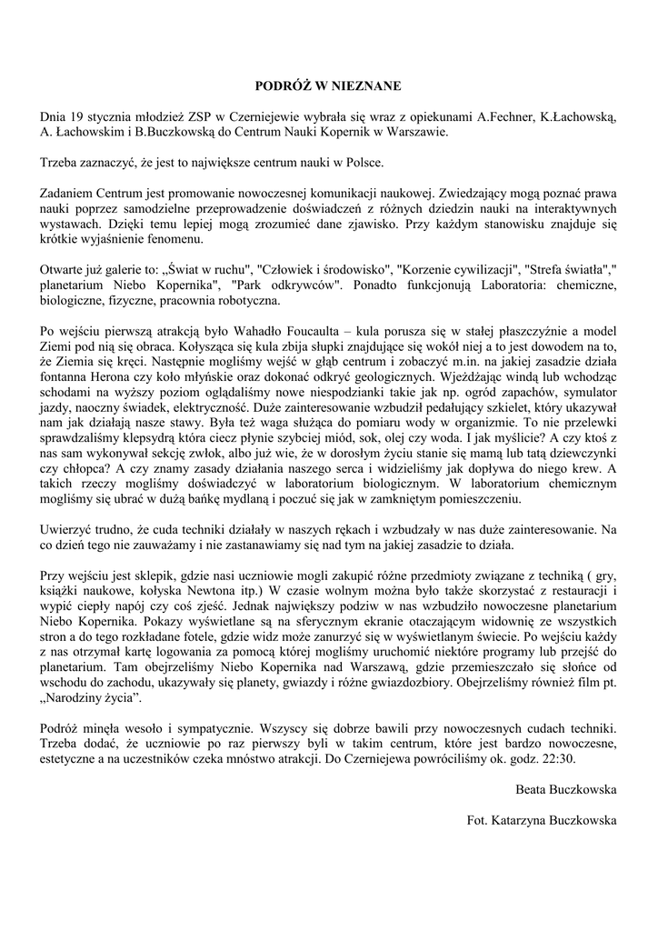 PODRÓś W NIEZNANE Dnia 19 stycznia młodzieŜ ZSP w Czerniejewie wybrała się wraz z opiekunami A.Fechner, K.Łachowską, A. Łachowskim i B.Buczkowską do Centrum Nauki Kopernik w Warszawie. Trzeba zaznaczyć, Ŝe jest to największe centrum nauki w Polsce. Zadaniem Centrum jest promowanie nowoczesnej komunikacji naukowej. Zwiedzający mogą poznać prawa nauki poprzez samodzielne przeprowadzenie doświadczeń z róŜnych dziedzin nauki na interaktywnych wystawach. Dzięki temu lepiej mogą zrozumieć dane zjawisko. Przy kaŜdym stanowisku znajduje się krótkie wyjaśnienie fenomenu. Otwarte juŜ galerie to: „Świat w ruchu", "Człowiek i środowisko", "Korzenie cywilizacji", "Strefa światła"," planetarium Niebo Kopernika", "Park odkrywców". Ponadto funkcjonują Laboratoria: chemiczne, biologiczne, fizyczne, pracownia robotyczna. Po wejściu pierwszą atrakcją było Wahadło Foucaulta – kula porusza się w stałej płaszczyźnie a model Ziemi pod nią się obraca. Kołysząca się kula zbija słupki znajdujące się wokół niej a to jest dowodem na to, Ŝe Ziemia się kręci. Następnie mogliśmy wejść w głąb centrum i zobaczyć m.in. na jakiej zasadzie działa fontanna Herona czy koło młyńskie oraz dokonać odkryć geologicznych. WjeŜdŜając windą lub wchodząc schodami na wyŜszy poziom oglądaliśmy nowe niespodzianki takie jak np. ogród zapachów, symulator jazdy, naoczny świadek, elektryczność. DuŜe zainteresowanie wzbudził pedałujący szkielet, który ukazywał nam jak działają nasze stawy. Była teŜ waga słuŜąca do pomiaru wody w organizmie. To nie przelewki sprawdzaliśmy klepsydrą która ciecz płynie szybciej miód, sok, olej czy woda. I jak myślicie? A czy ktoś z nas sam wykonywał sekcję zwłok, albo juŜ wie, Ŝe w dorosłym Ŝyciu stanie się mamą lub tatą dziewczynki czy chłopca? A czy znamy zasady działania naszego serca i widzieliśmy jak dopływa do niego krew. A takich rzeczy mogliśmy doświadczyć w laboratorium biologicznym. W laboratorium chemicznym mogliśmy się ubrać w duŜą bańkę mydlaną i poczuć się jak w zamkniętym pomieszczeniu. Uwierzyć trudno, Ŝe cuda techniki działały w naszych rękach i wzbudzały w nas duŜe zainteresowanie. Na co dzień tego nie zauwaŜamy i nie zastanawiamy się nad tym na jakiej zasadzie to działa. Przy wejściu jest sklepik, gdzie nasi uczniowie mogli zakupić róŜne przedmioty związane z techniką ( gry, ksiąŜki naukowe, kołyska Newtona itp.) W czasie wolnym moŜna było takŜe skorzystać z restauracji i wypić ciepły napój czy coś zjeść. Jednak największy podziw w nas wzbudziło nowoczesne planetarium Niebo Kopernika. Pokazy wyświetlane są na sferycznym ekranie otaczającym widownię ze wszystkich stron a do tego rozkładane fotele, gdzie widz moŜe zanurzyć się w wyświetlanym świecie. Po wejściu kaŜdy z nas otrzymał kartę logowania za pomocą której mogliśmy uruchomić niektóre programy lub przejść do planetarium. Tam obejrzeliśmy Niebo Kopernika nad Warszawą, gdzie przemieszczało się słońce od wschodu do zachodu, ukazywały się planety, gwiazdy i róŜne gwiazdozbiory. Obejrzeliśmy równieŜ film pt. „Narodziny Ŝycia”. PodróŜ minęła wesoło i sympatycznie. Wszyscy się dobrze bawili przy nowoczesnych cudach techniki. Trzeba dodać, Ŝe uczniowie po raz pierwszy byli w takim centrum, które jest bardzo nowoczesne, estetyczne a na uczestników czeka mnóstwo atrakcji. Do Czerniejewa powróciliśmy ok. godz. 22:30. Beata Buczkowska Fot. Katarzyna Buczkowska
