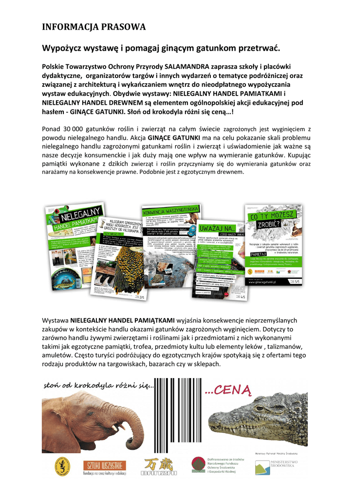 INFORMACJA PRASOWA Wypożycz wystawę i pomagaj ginącym gatunkom przetrwać. Polskie Towarzystwo Ochrony Przyrody SALAMANDRA zaprasza szkoły i placówki dydaktyczne, organizatorów targów i innych wydarzeń o tematyce podróżniczej oraz związanej z architekturą i wykańczaniem wnętrz do nieodpłatnego wypożyczania wystaw edukacyjnych. Obydwie wystawy: NIELEGALNY HANDEL PAMIATKAMI i NIELEGALNY HANDEL DREWNEM są elementem ogólnopolskiej akcji edukacyjnej pod hasłem - GINĄCE GATUNKI. Słoń od krokodyla różni się ceną…! Ponad 30 000 gatunków roślin i zwierząt na całym świecie zagrożonych jest wyginięciem z powodu nielegalnego handlu. Akcja GINĄCE GATUNKI ma na celu pokazanie skali problemu nielegalnego handlu zagrożonymi gatunkami roślin i zwierząt i uświadomienie jak ważne są nasze decyzje konsumenckie i jak duży mają one wpływ na wymieranie gatunków. Kupując pamiątki wykonane z dzikich zwierząt i roślin przyczyniamy się do wymierania gatunków oraz narażamy na konsekwencje prawne. Podobnie jest z egzotycznym drewnem. Wystawa NIELEGALNY HANDEL PAMIĄTKAMI wyjaśnia konsekwencje nieprzemyślanych zakupów w kontekście handlu okazami gatunków zagrożonych wyginięciem. Dotyczy to zarówno handlu żywymi zwierzętami i roślinami jak i przedmiotami z nich wykonanymi takimi jak egzotyczne pamiątki, trofea, przedmioty kultu lub elementy leków , talizmanów, amuletów. Często turyści podróżujący do egzotycznych krajów spotykają się z ofertami tego rodzaju produktów na targowiskach, bazarach czy w sklepach. INFORMACJA PRASOWA Zobacz w jaki sposób powstają przedmioty wykonane z gatunków zwierząt chronionych prawem - obejrzyj viral: https://youtu.be/_9ZheHGnC98 Wystawa NIELEGALNY HANDEL DREWNEM wyjaśnia zależności między niekontrolowaną, rabunkową wycinką lasów tropikalnych a handlem drewnem egzotycznym w naszych sklepach. Ten nielegalny proceder przynosi kolosalne zyski, jak wynika z szacunków stanowi aż 40% globalnego handlu drewnem na świecie. Powoduje także degradację ogromnych obszarów leśnych i utratę bioróżnorodności. Dowiedz się więcej na www.ginacegatunki.pl Każdą osobę i instytucję zainteresowaną bezpłatnym wynajmem wystawy prosimy o kontakt mailowy: [email protected]. Szczególnie mocno zapraszamy do współpracy szkoły, edukacja młodych ludzi daje szansę na lepszą ochronę dzikiej przyrody w przyszłości. Idealnym miejsce na ekspozycję wystawy są także targi i imprezy podróżnicze oraz targi budowlane i poświęcone wykańczaniu wnętrz. Każda z wystaw prezentowana jest na 5 planszach w aluminiowych ramach o wymiarach 100 x 70, w komplecie drewniane sztalugi. Los tysięcy gatunków zależy od przemyślanych decyzji konsumentów na całym świecie, również w Polsce. Wejdź na stronie kampanii www.ginacegatunki.pl i dowiedz się więcej! Kontakt w sprawie wystawy: [email protected] INFORMACJA PRASOWA Akcja edukacyjna SŁOŃ OD KROKODYLA RÓŻNI SIĘ… CENĄ stanowi część ogólnopolskiej kampanii GINĄCE GATUNKI, która jest realizowana w partnerstwie Polskiego Towarzystwa Ochrony Przyrody „Salamandra”, Fundacji „Sztuki Wszystkie” oraz firmy BANZAI, dzięki dofinansowaniu Narodowego Funduszu Ochrony Środowiska i Gospodarki Wodnej. Patronat honorowy nad projektem sprawuje Minister Środowiska. Kampania skierowana jest do telewidzów, Internautów, turystów, konsumentów oraz do architektów wnętrz. Celem kampanii jest podwyższenie poziomu świadomości społecznej w zakresie nielegalnego handlu gatunkami zagrożonymi wyginięciem oraz ograniczenie tego procederu szczególnie poprzez właściwe wybory konsumenckie. Głównym elementem kampanii jest cykl filmów dokumentalnych o charakterze edukacyjnym pt. „Mapa ginącego świata”. Gospodarzem filmów jest aktor Mateusz Damięcki, a zdjęcia do cyklu realizowane były w Kenii, Sri Lance, Wietnamie oraz na Madagaskarze. Ponadto powstały dwa virale internetowe, ulotka - mapa ginącego świata, która trafi na lotniska, a stamtąd do turystów, aplikacja na telefon – świadomy podróżnik i dwie wystawy: Nielegalny handel pamiątkami i Nielegalny handel drewnem. Szkoły, festiwale podróżnicze, instytucje zainteresowane ekspozycją wybranej wystaw zapraszamy do współpracy. Więcej informacji na temat wystaw oraz kampanii GINĄCE GATUNKI znajduje się na stronie www.ginacegatunki.pl Kontakt dla mediów: Małgorzata Kosowska, [email protected], 794 490 100
