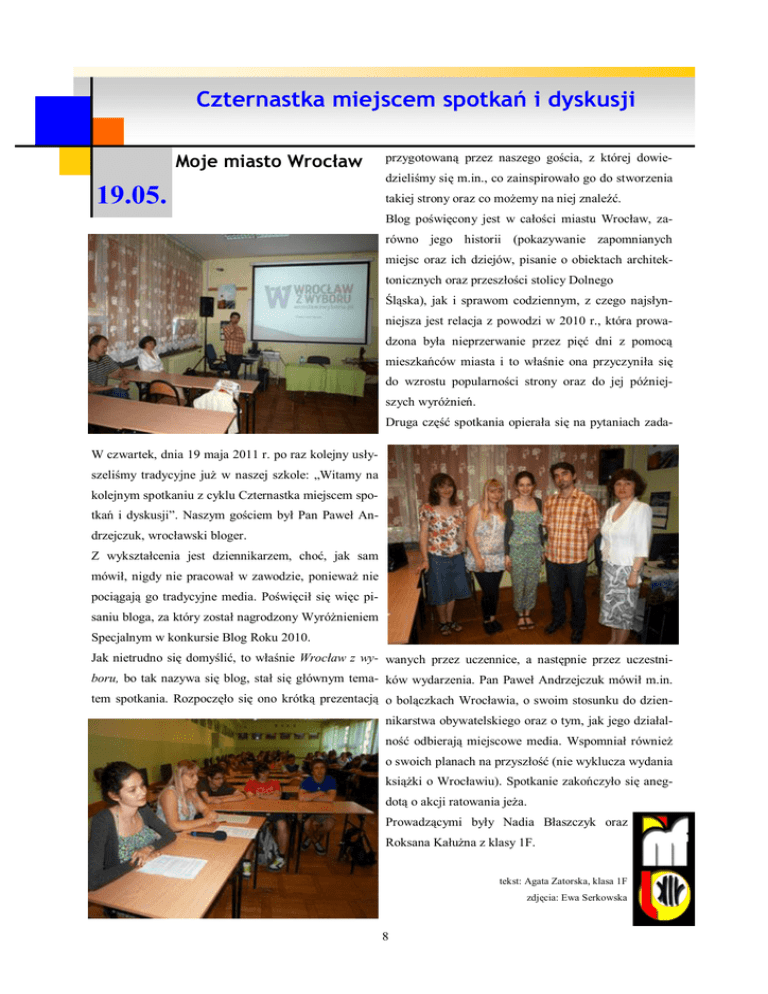 Czternastka miejscem spotkań i dyskusji Moje miasto Wrocław przygotowaną przez naszego gościa, z której dowiedzieliśmy się m.in., co zainspirowało go do stworzenia 19.05. takiej strony oraz co możemy na niej znaleźć. Blog poświęcony jest w całości miastu Wrocław, zarówno jego historii (pokazywanie zapomnianych miejsc oraz ich dziejów, pisanie o obiektach architektonicznych oraz przeszłości stolicy Dolnego Śląska), jak i sprawom codziennym, z czego najsłynniejsza jest relacja z powodzi w 2010 r., która prowadzona była nieprzerwanie przez pięć dni z pomocą mieszkańców miasta i to właśnie ona przyczyniła się do wzrostu popularności strony oraz do jej późniejszych wyróżnień. Druga część spotkania opierała się na pytaniach zada- W czwartek, dnia 19 maja 2011 r. po raz kolejny usłyszeliśmy tradycyjne już w naszej szkole: „Witamy na kolejnym spotkaniu z cyklu Czternastka miejscem spotkań i dyskusji”. Naszym gościem był Pan Paweł Andrzejczuk, wrocławski bloger. Z wykształcenia jest dziennikarzem, choć, jak sam mówił, nigdy nie pracował w zawodzie, ponieważ nie pociągają go tradycyjne media. Poświęcił się więc pisaniu bloga, za który został nagrodzony Wyróżnieniem Specjalnym w konkursie Blog Roku 2010. Jak nietrudno się domyślić, to właśnie Wrocław z wy- wanych przez uczennice, a następnie przez uczestniboru, bo tak nazywa się blog, stał się głównym tema- ków wydarzenia. Pan Paweł Andrzejczuk mówił m.in. tem spotkania. Rozpoczęło się ono krótką prezentacją o bolączkach Wrocławia, o swoim stosunku do dziennikarstwa obywatelskiego oraz o tym, jak jego działalność odbierają miejscowe media. Wspomniał również o swoich planach na przyszłość (nie wyklucza wydania książki o Wrocławiu). Spotkanie zakończyło się anegdotą o akcji ratowania jeża. Prowadzącymi były Nadia Błaszczyk oraz Roksana Kałużna z klasy 1F. tekst: Agata Zatorska, klasa 1F zdjęcia: Ewa Serkowska 8
